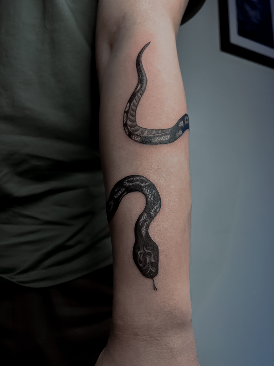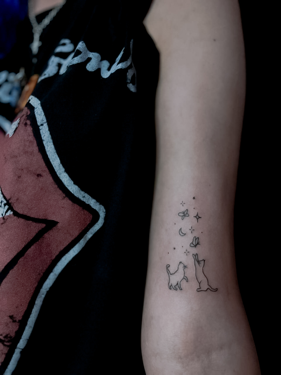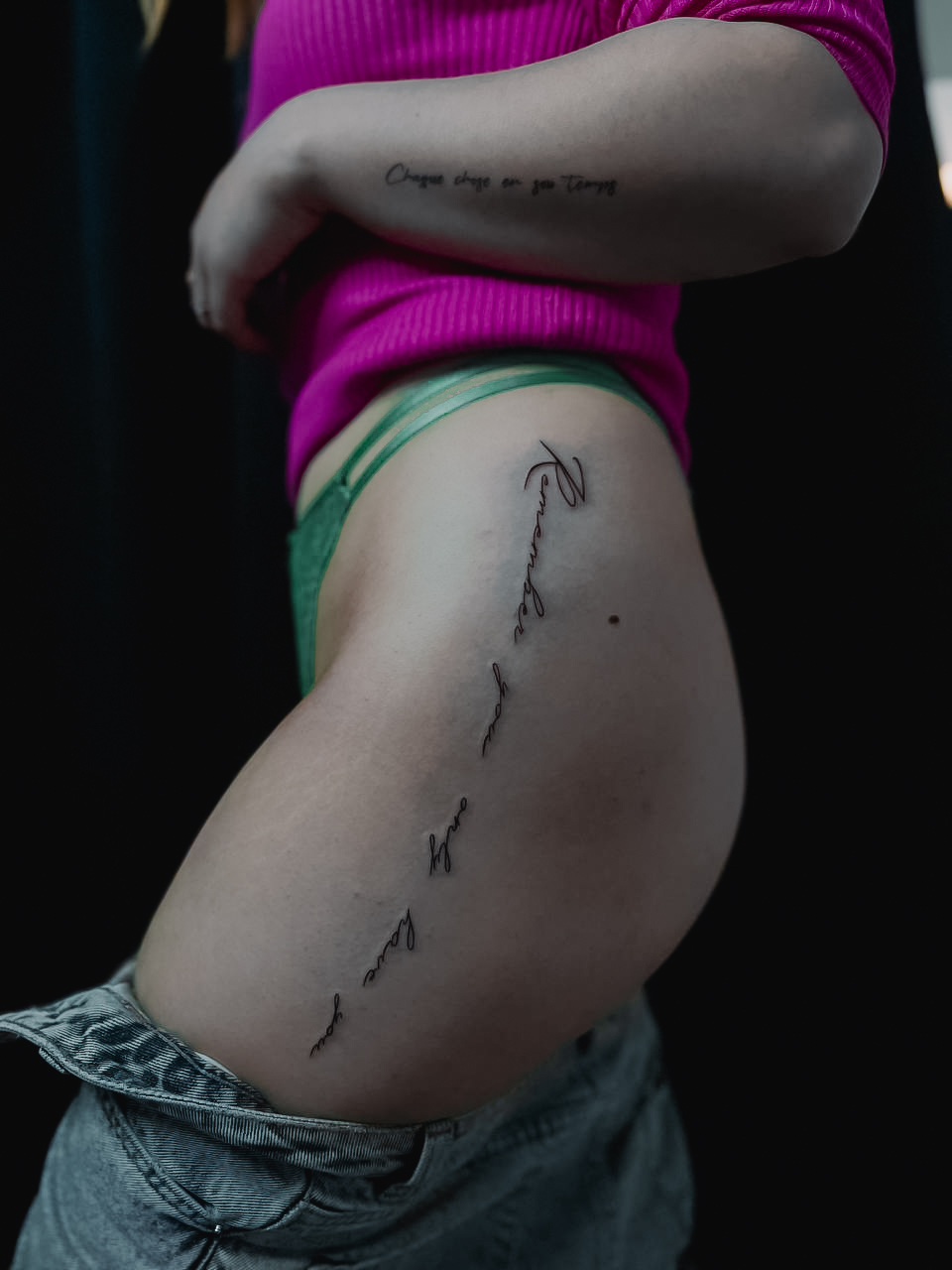 Ahoj! Jmenuji se Nina. Jsem tatérka. V tomto oboru pracuji šest měsíců. Preferuji grafické a minimalistické styly. Obor tetování jsem si vybral, protože umění opravdu miluji ve všech jeho projevech, považuji tento obor za velmi kreativní a zajímavý. Mezi mé koníčky patří cestování, knihy a divadlo. Čekám na vás na sezení! Vaše tatérka Nina)