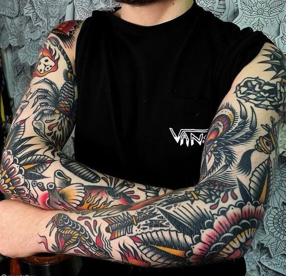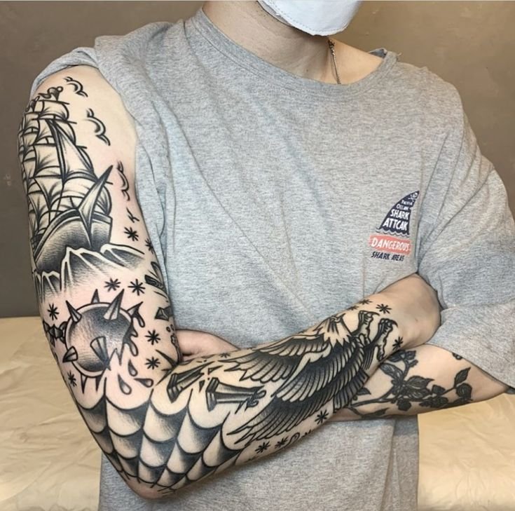 - Pokud se rozhodnete, že vaším konečným cílem bude rukáv, pak je lepší držet se od samého začátku jednoho designu a konceptu. A nejde o to, že jednotlivá tetování budou vypadat špatně na celé ploše vaší ruky. Tak tomu není. Za prvé mohou zůstat tetované samostatně a za druhé, tatér bude muset vybraný design upravit pro každé další tetování v souladu s parametry vaší ruky, což je spojeno s neúměrným natažením samotného návrhu, resp. zbytečné zmenšení designu, což může vést k nejasnostem v detailech.