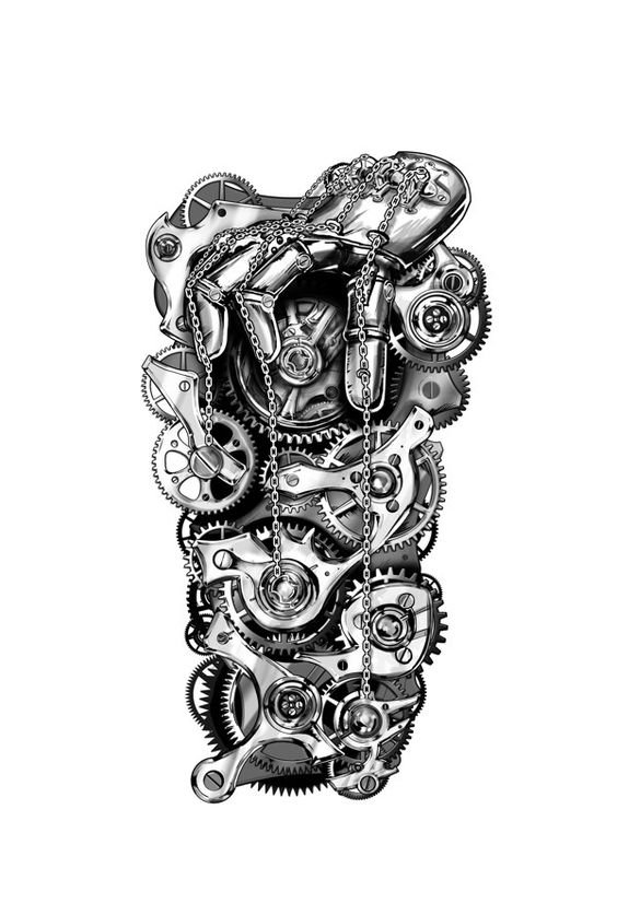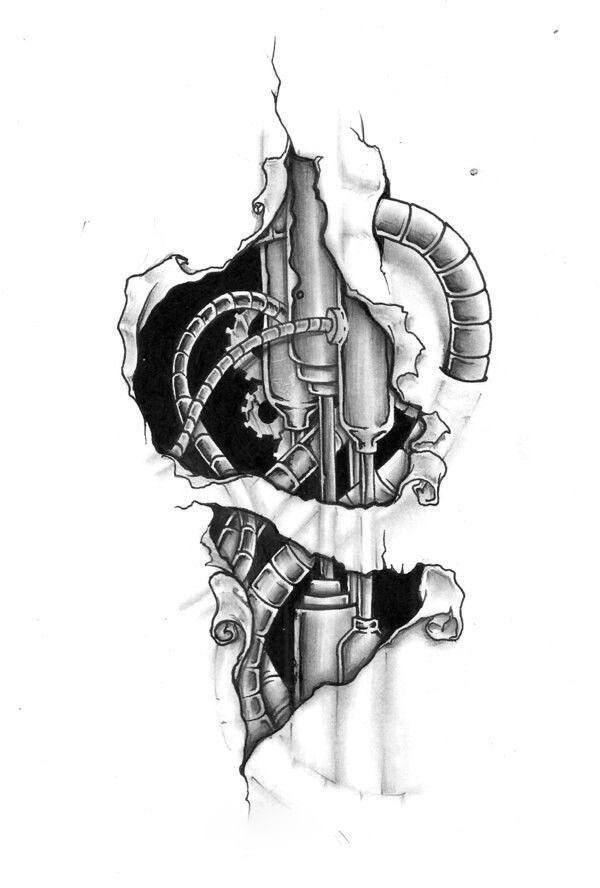 Náčrty zpravidla vypadají takto: na lidském těle je zobrazena roztrhaná kůže, přes kterou je viditelný mechanismus.Všechny součásti mechanismu (matice, dráty, pružiny, písty, šrouby atd.) vypadají velmi přirozeně. Co dodává stylu zvláštní šmrnc