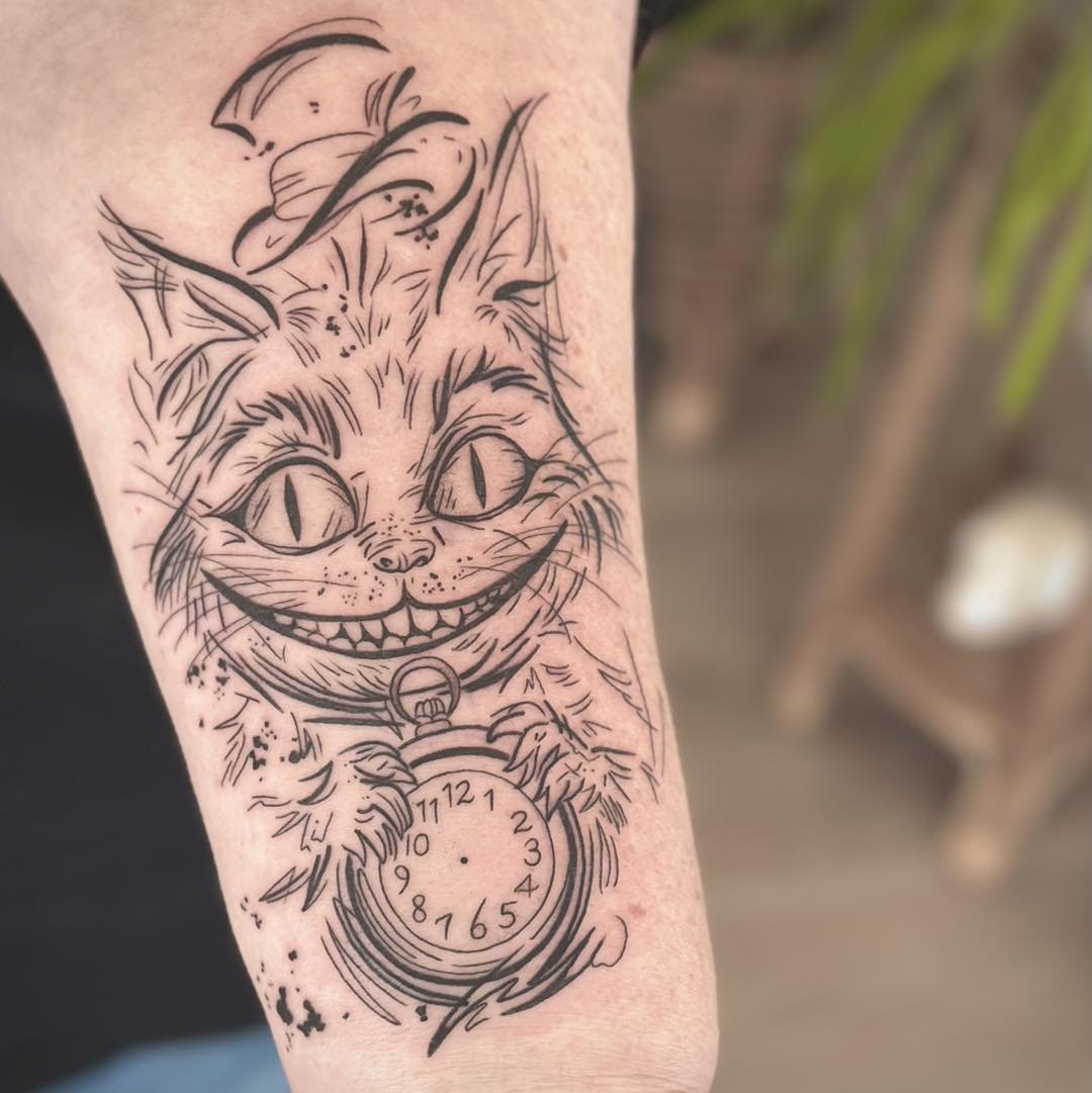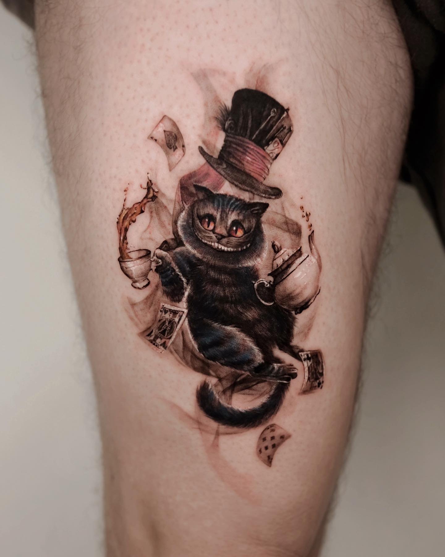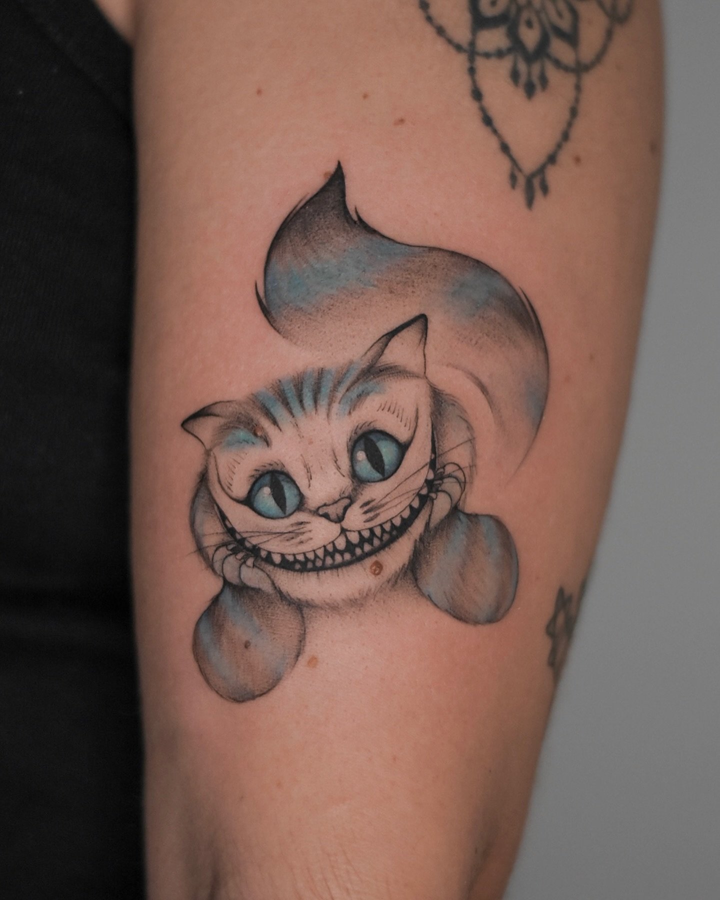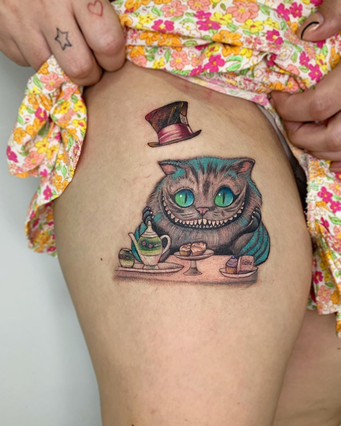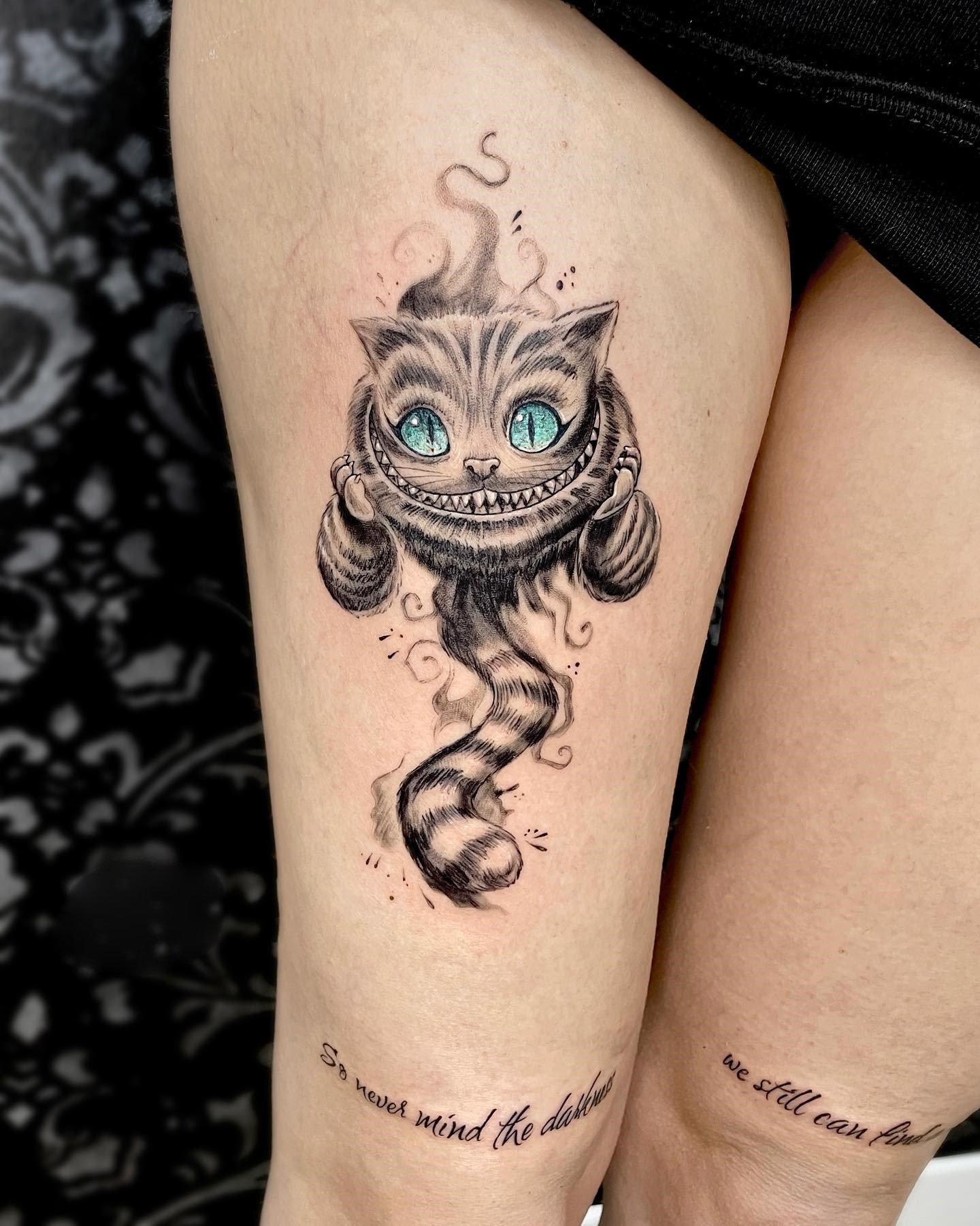 Lewisova kniha nám vypráví o úžasné cestě Alenky zvláštní zemí plnou záhad a neobyčejných věcí a neobvyklých obyvatel. Z této knihy jsme se dozvěděli o neobvyklé, záhadné Češirské kočce, která získala srdce všech svým širokým úsměvem. V tomto příběhu Češir vystupuje v roli filosofa, pozitivního usměvavého kocoura, který se může objevit a zmizet, kdykoli si to přeje, nechávaje za sebou jen úsměv. Jak je známo, na motivy knihy byl natočen stejnojmenný film a animovaný film, v nichž je nejjasnějším postavou právě Češirská kočka. Vzhledem k takové popularitě není divu, že se tato kočka dostala i do umění tetování a těší se velké poptávce.