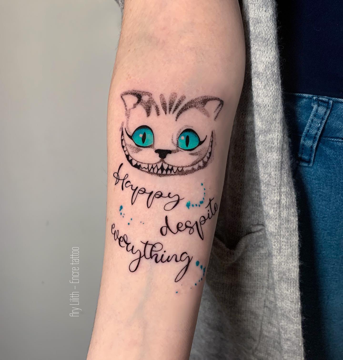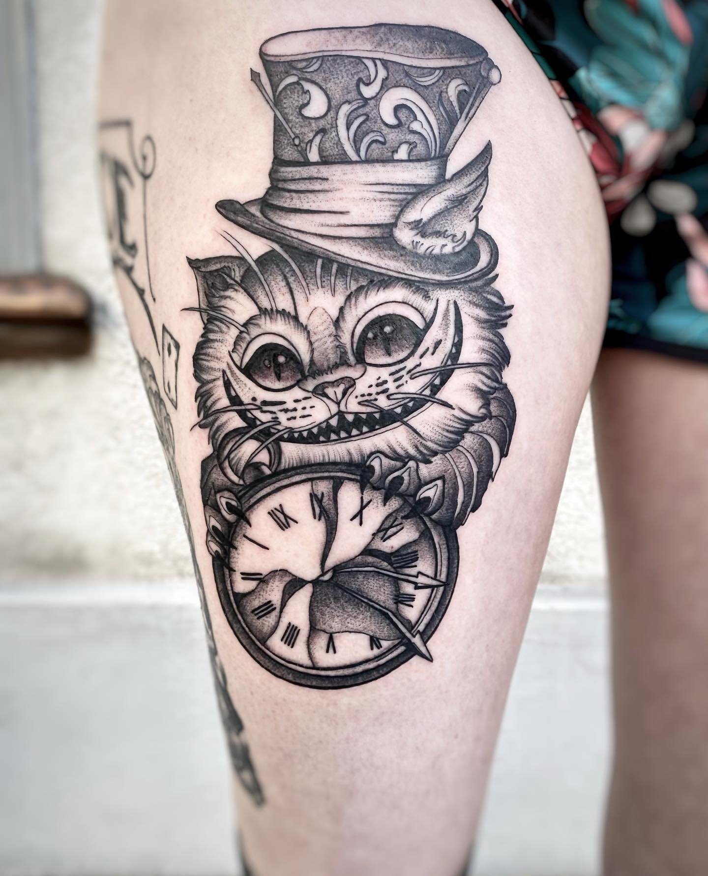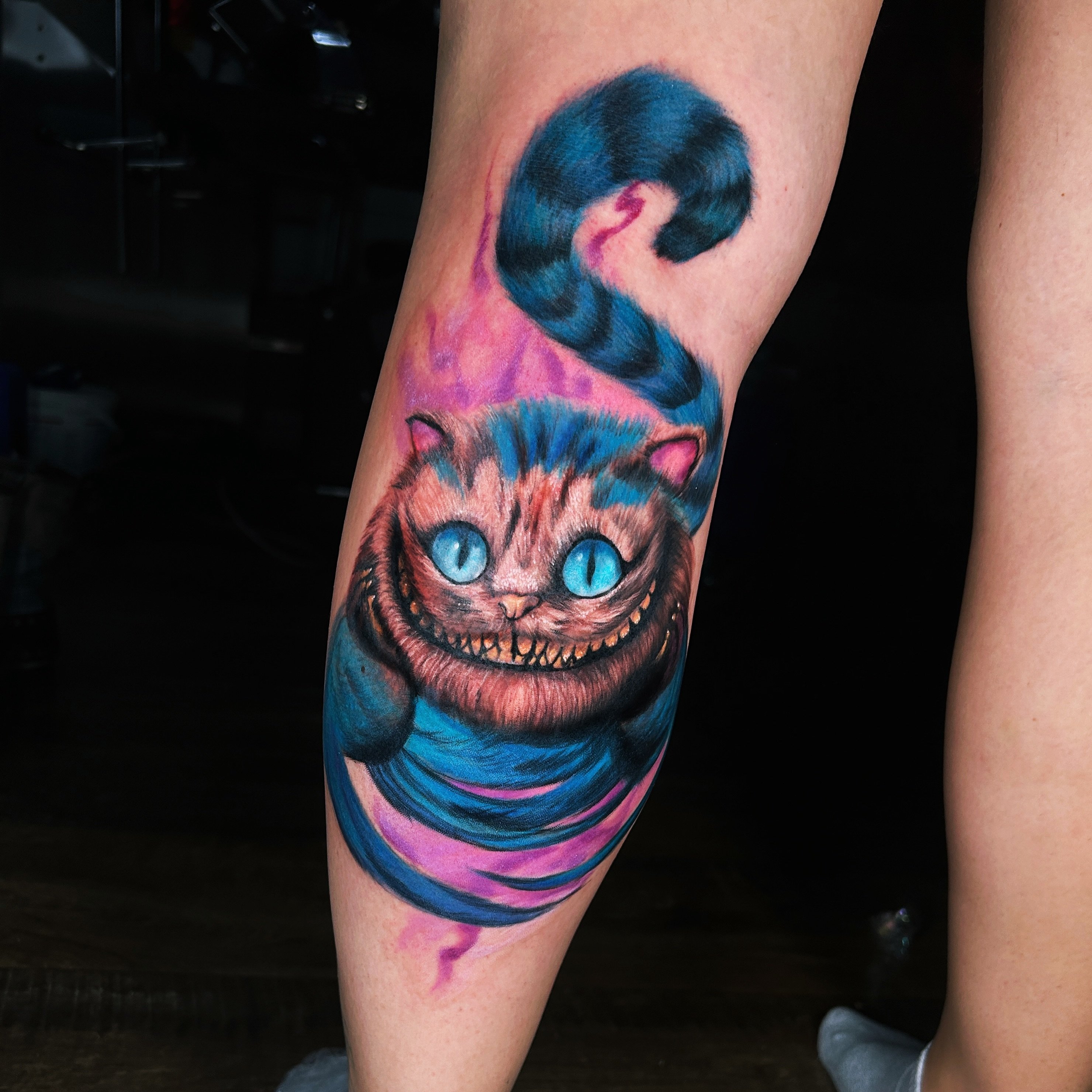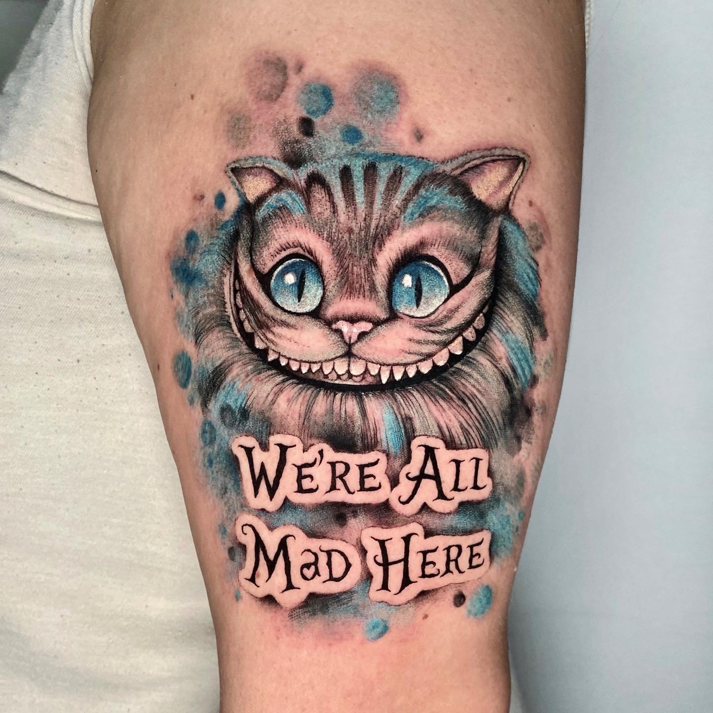 Lewisova kniha nám vypráví o úžasné cestě Alenky zvláštní zemí plnou záhad a neobyčejných věcí a neobvyklých obyvatel. Z této knihy jsme se dozvěděli o neobvyklé, záhadné Češirské kočce, která získala srdce všech svým širokým úsměvem. V tomto příběhu Češir vystupuje v roli filosofa, pozitivního usměvavého kocoura, který se může objevit a zmizet, kdykoli si to přeje, nechávaje za sebou jen úsměv. Jak je známo, na motivy knihy byl natočen stejnojmenný film a animovaný film, v nichž je nejjasnějším postavou právě Češirská kočka. Vzhledem k takové popularitě není divu, že se tato kočka dostala i do umění tetování a těší se velké poptávce.