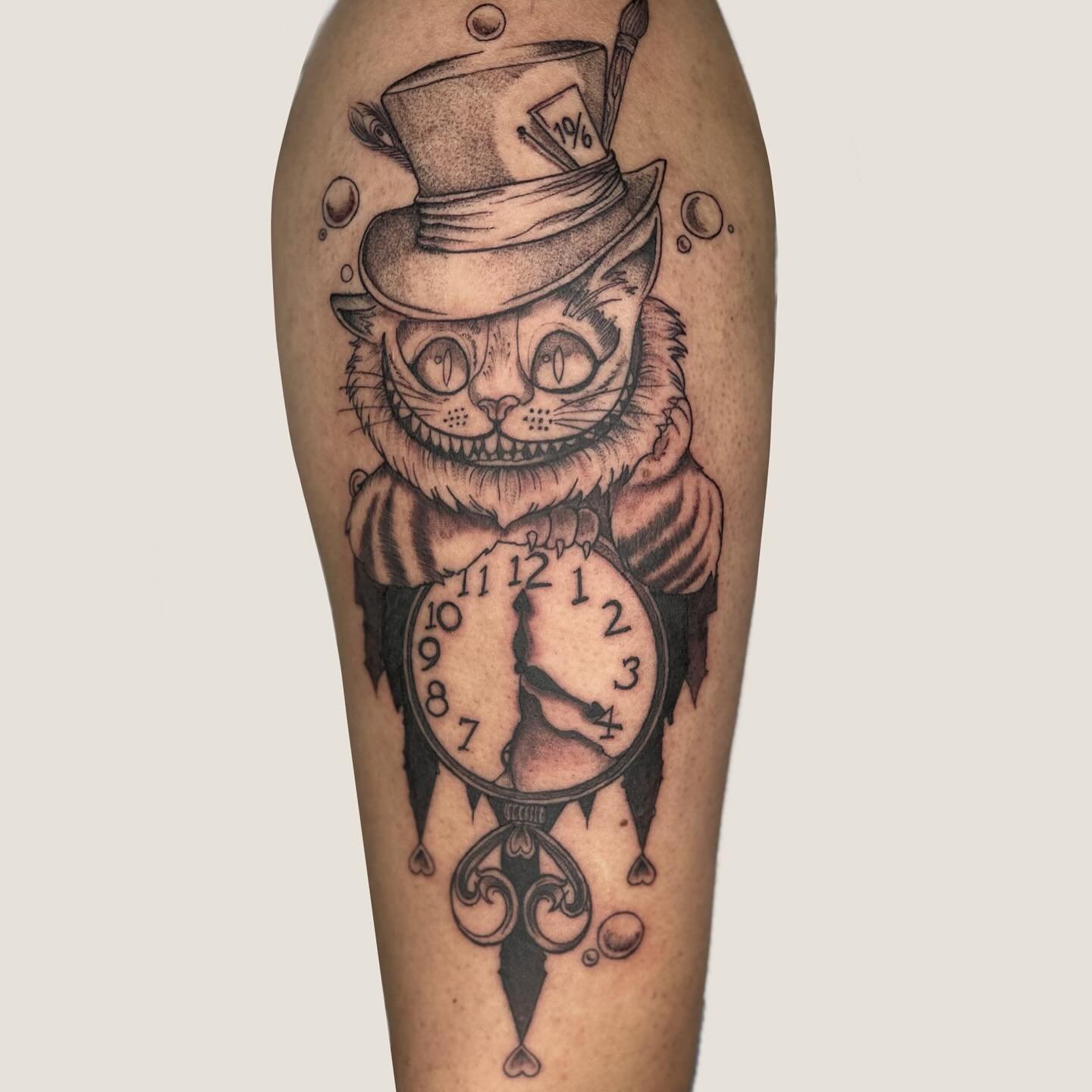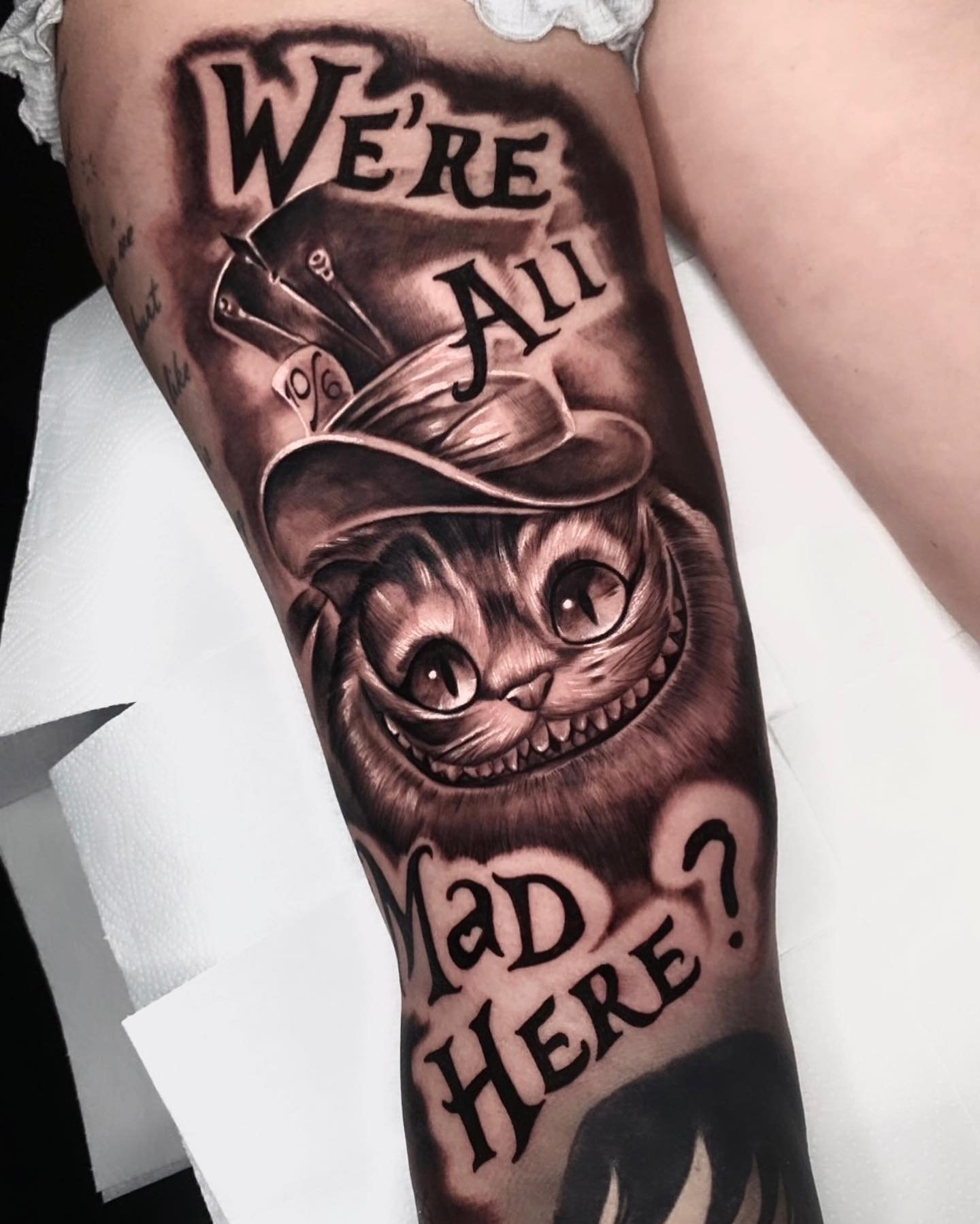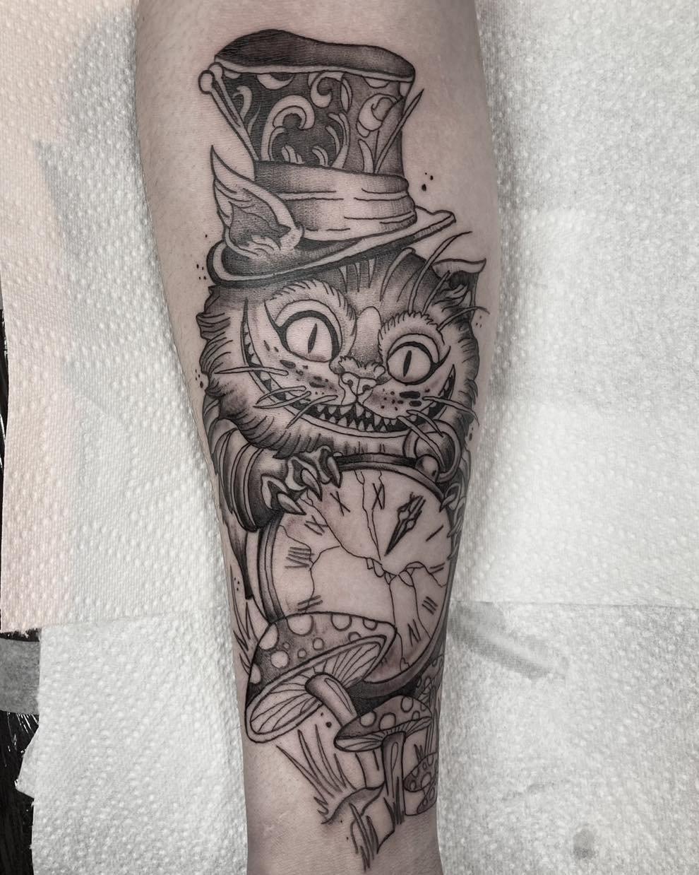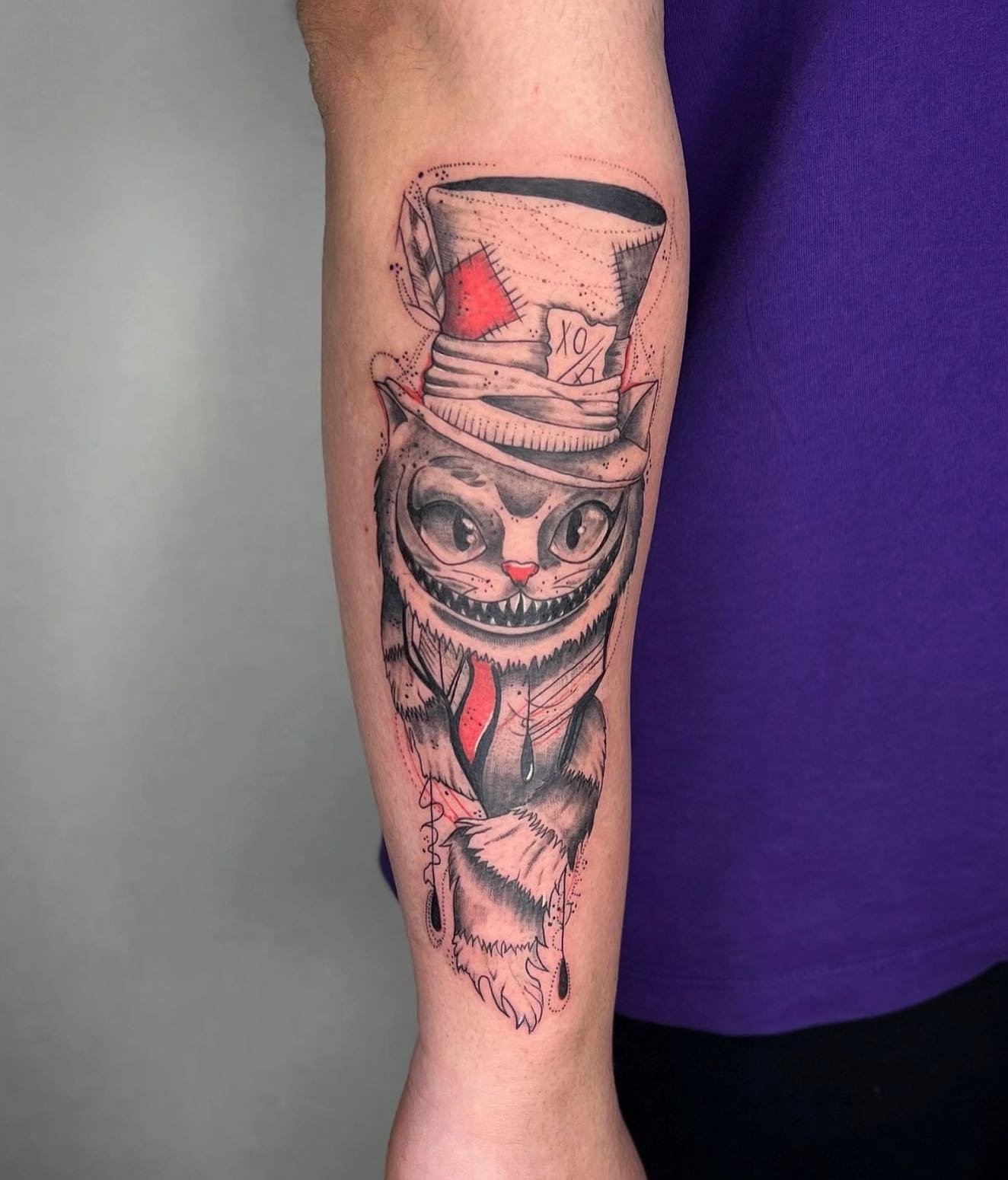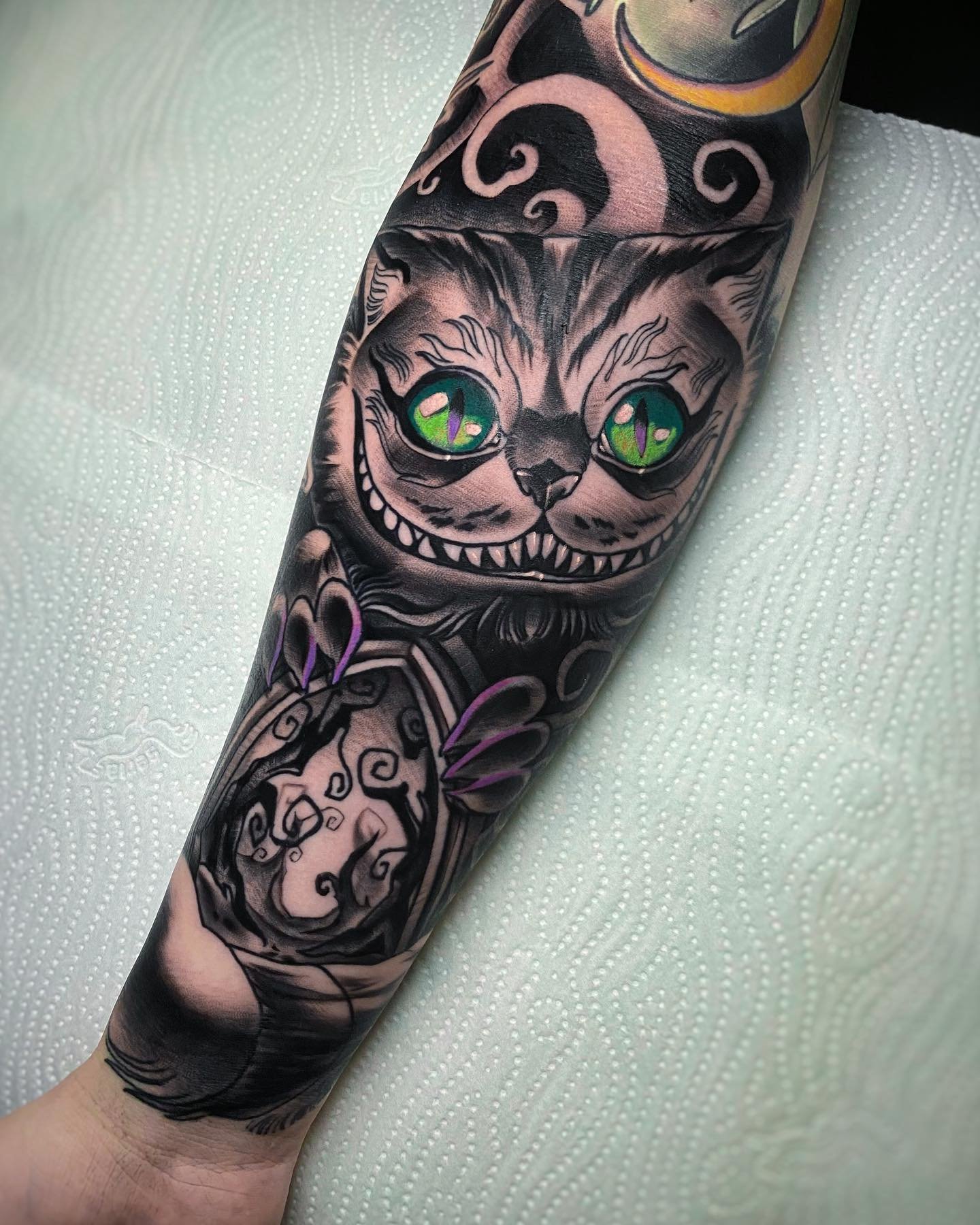 Lewisova kniha nám vypráví o úžasné cestě Alenky zvláštní zemí plnou záhad a neobyčejných věcí a neobvyklých obyvatel. Z této knihy jsme se dozvěděli o neobvyklé, záhadné Češirské kočce, která získala srdce všech svým širokým úsměvem. V tomto příběhu Češir vystupuje v roli filosofa, pozitivního usměvavého kocoura, který se může objevit a zmizet, kdykoli si to přeje, nechávaje za sebou jen úsměv. Jak je známo, na motivy knihy byl natočen stejnojmenný film a animovaný film, v nichž je nejjasnějším postavou právě Češirská kočka. Vzhledem k takové popularitě není divu, že se tato kočka dostala i do umění tetování a těší se velké poptávce.