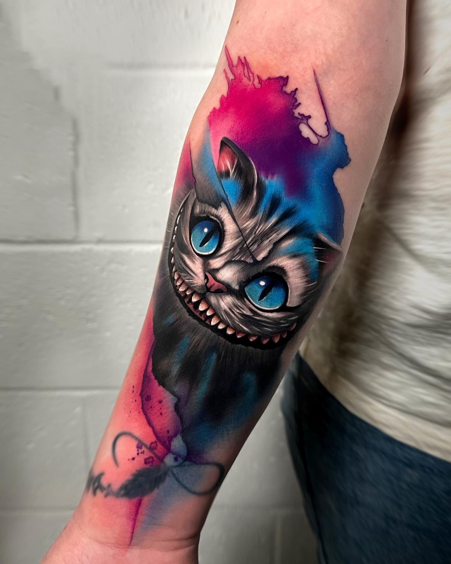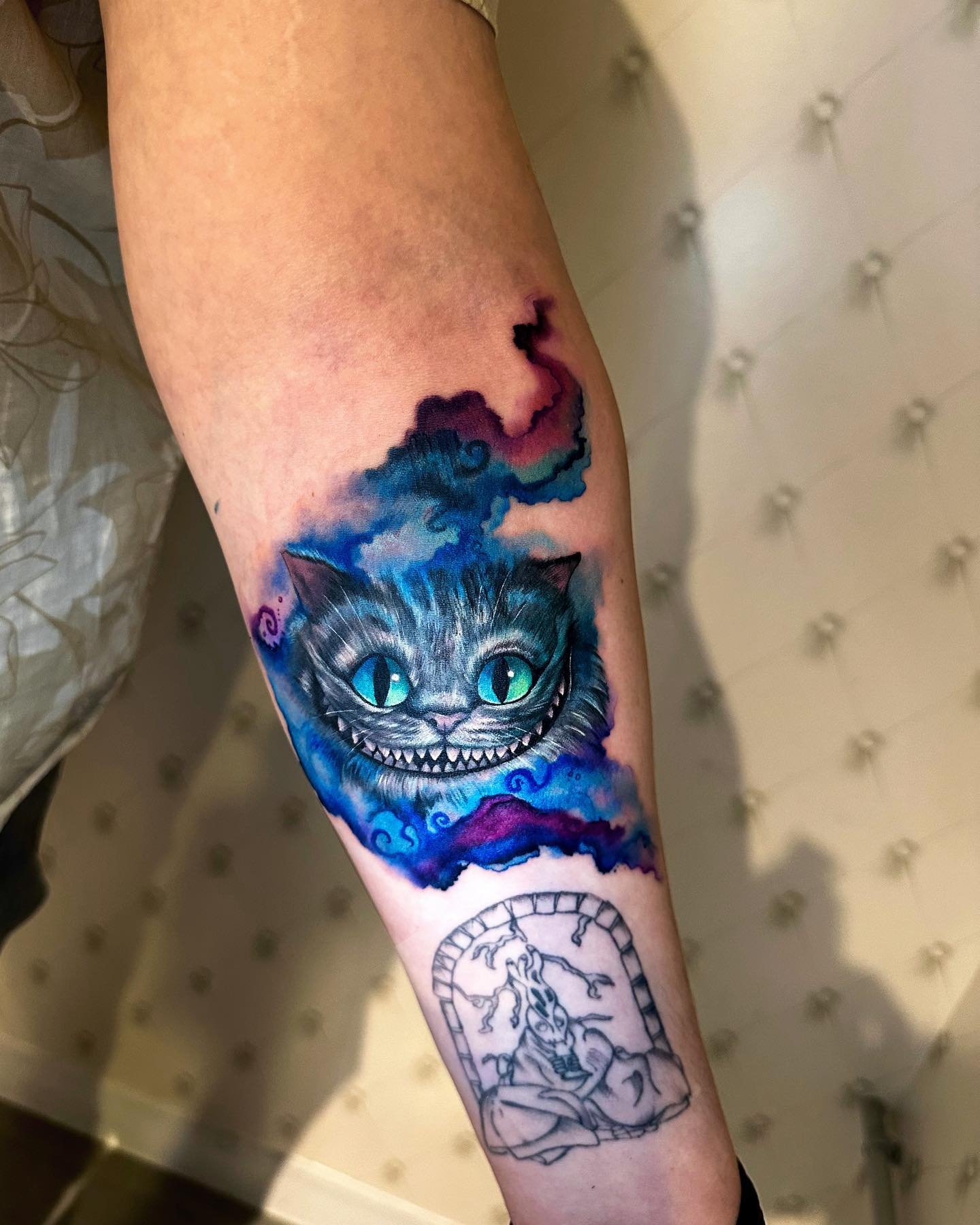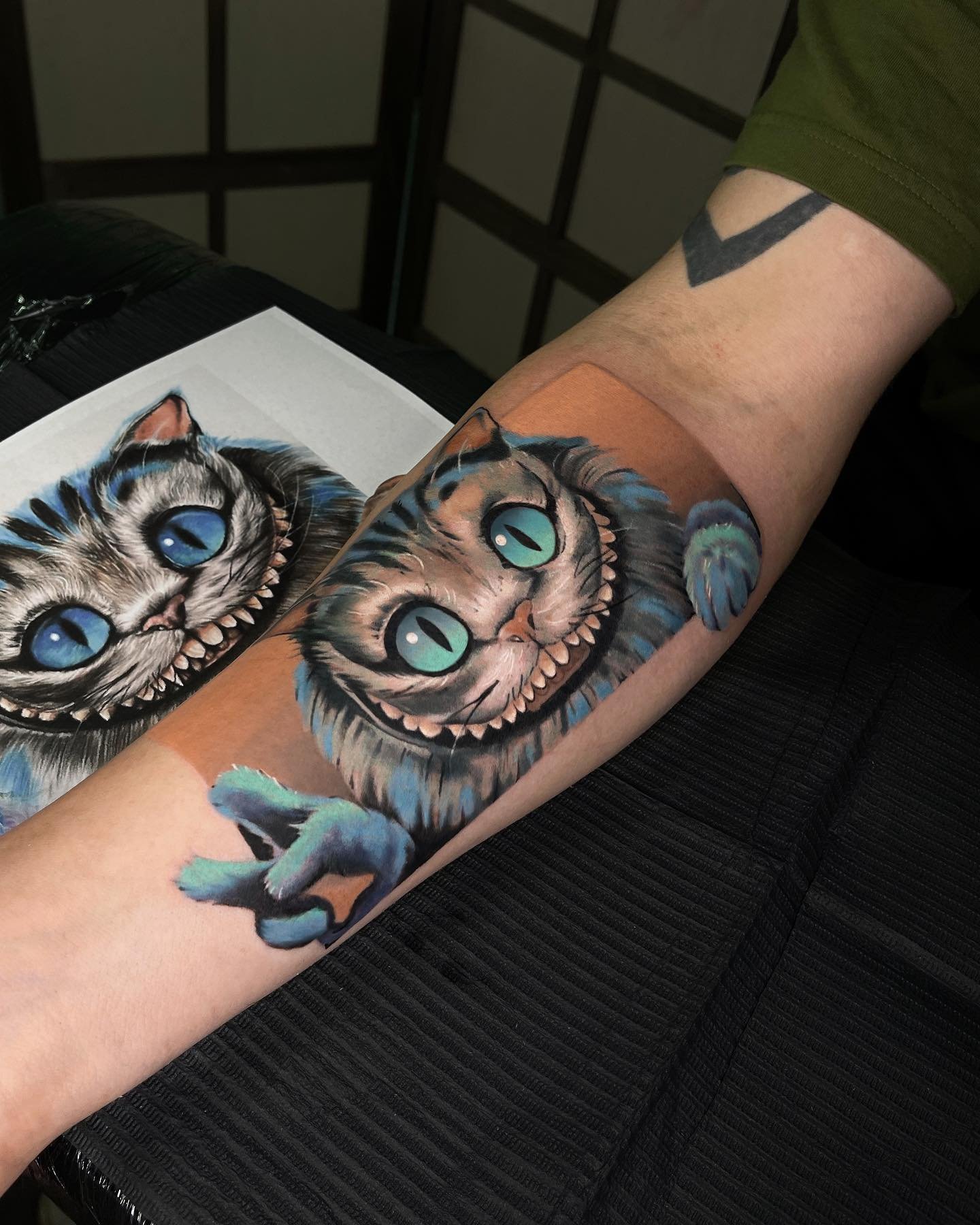 Tetování s obrazem Češirské kočky je univerzální, vyhlíží stejně originálně a záhadně jak na mužském, tak na ženském těle. Češir může být proveden v jakékoli požadované barevné paletě, omezení nejsou. To může být jen prostě kočka, nebo s dalšími prvky: například s hodinkami, kloboukem, sedící na větvi nebo vznášející se ve vzduchu. Obvykle si takový obraz vybírají mladí životemilovní chlapci a dívky, demonstrujíce své pozitivní naladění. Tetování s Češirskou kočkou nese v sobě spoustu pozitivních emocí, darujíc je všem okolním.