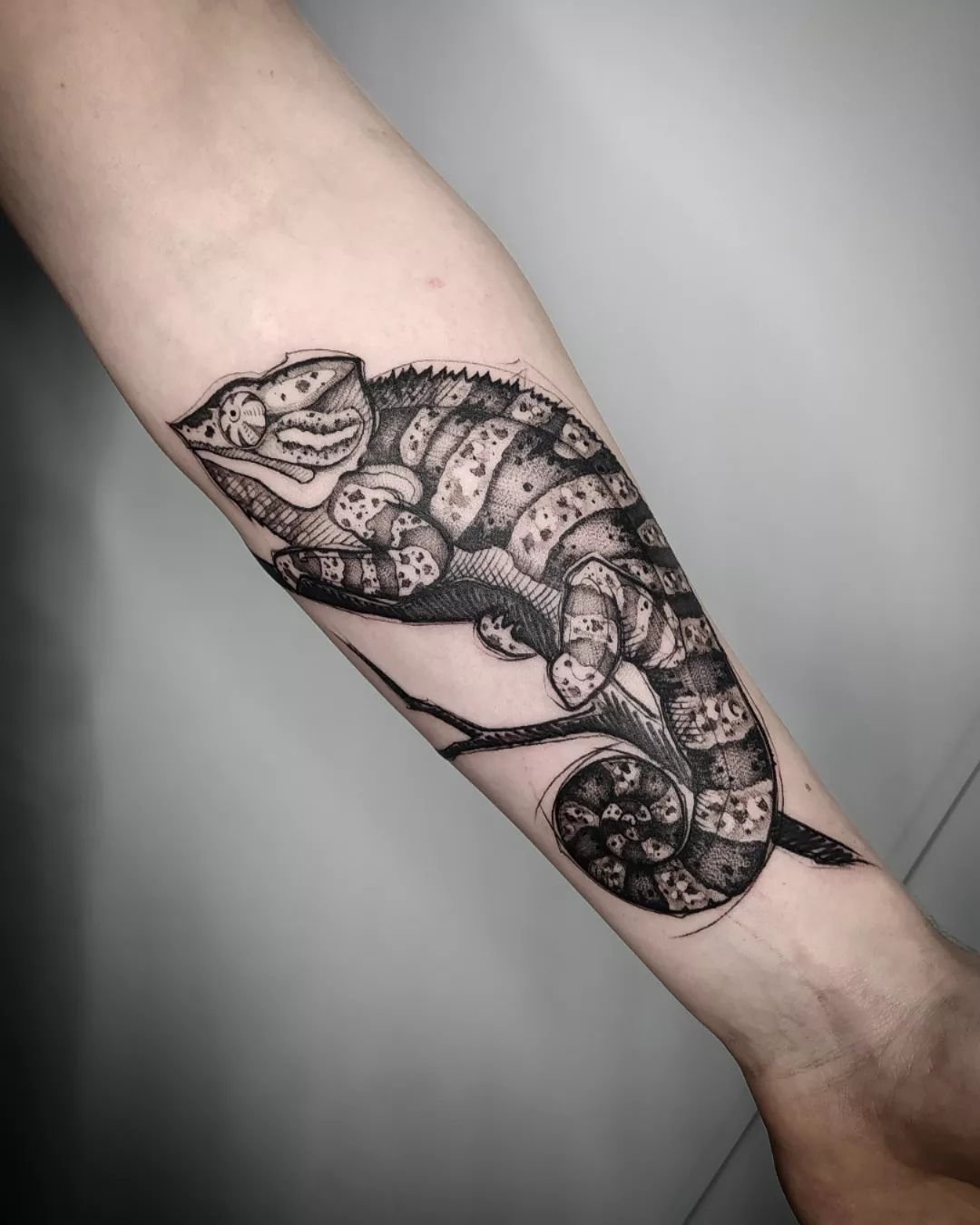 Styl gravírování také hodí pro tetování s chameleony. V tomto stylu bude chameleon vypadat jako kreslený obrázek v učebnici.