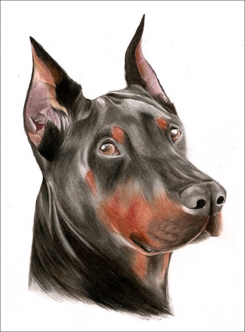 Dobrman je zobrazen jak v plném růstu, tak v polovině, nebo jen v obličeji domácího mazlíčka.