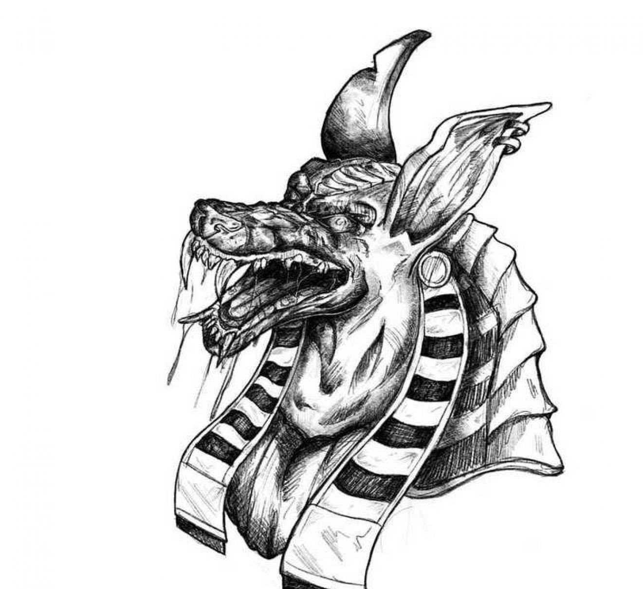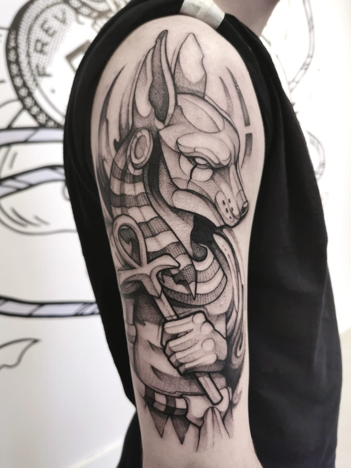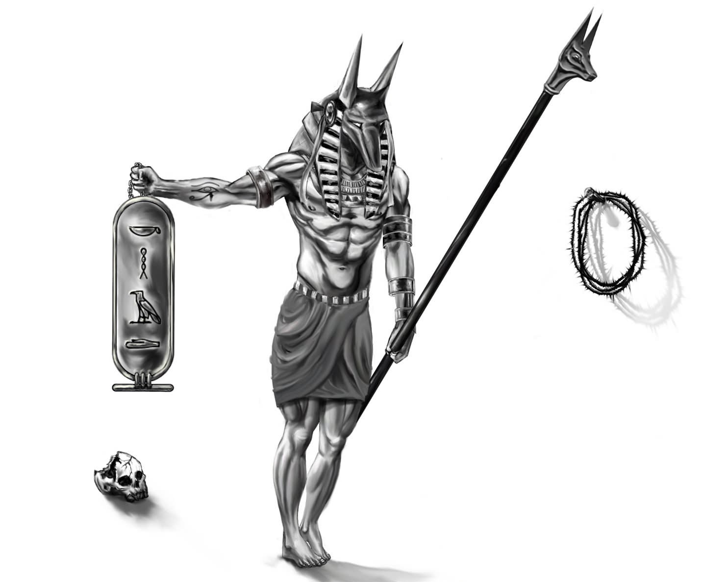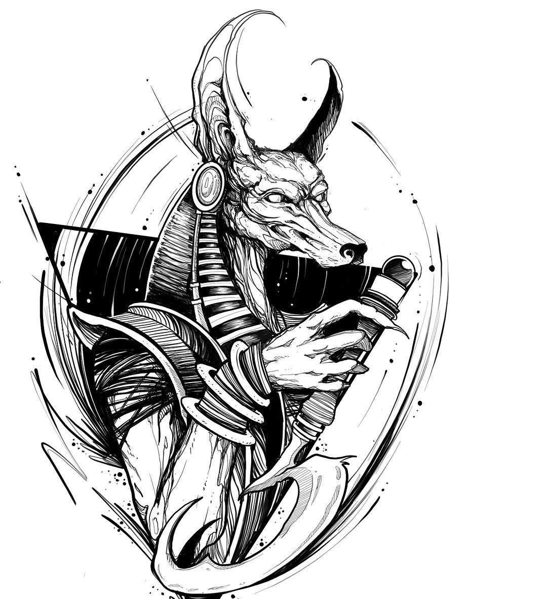 Pro náčrty tetování se však často používá pes v podobě boha. Anubis přitahuje svou vznešeností a tajemností. Dílo může být zdobeno hieroglyfy a skalními malbami a Anubis má často v ruce vycházkovou hůl. Energie kresby může dát svému majiteli sílu a moudrost.