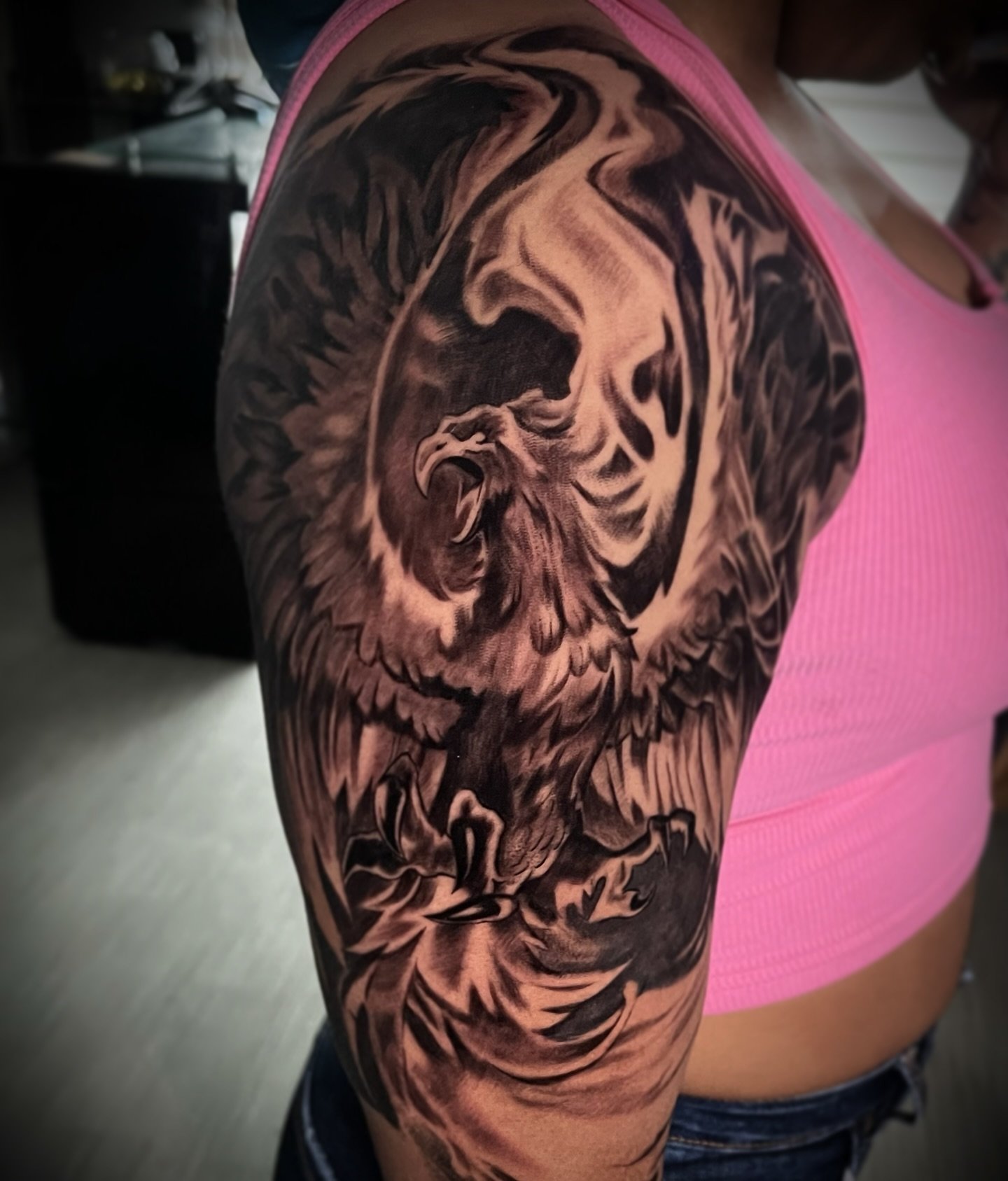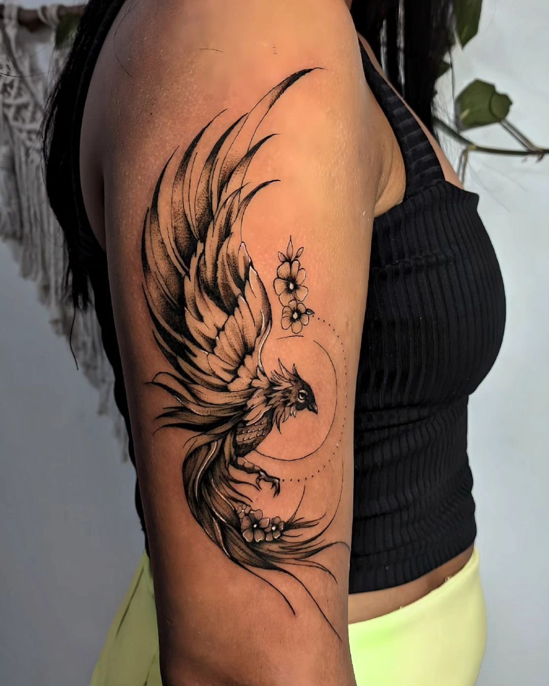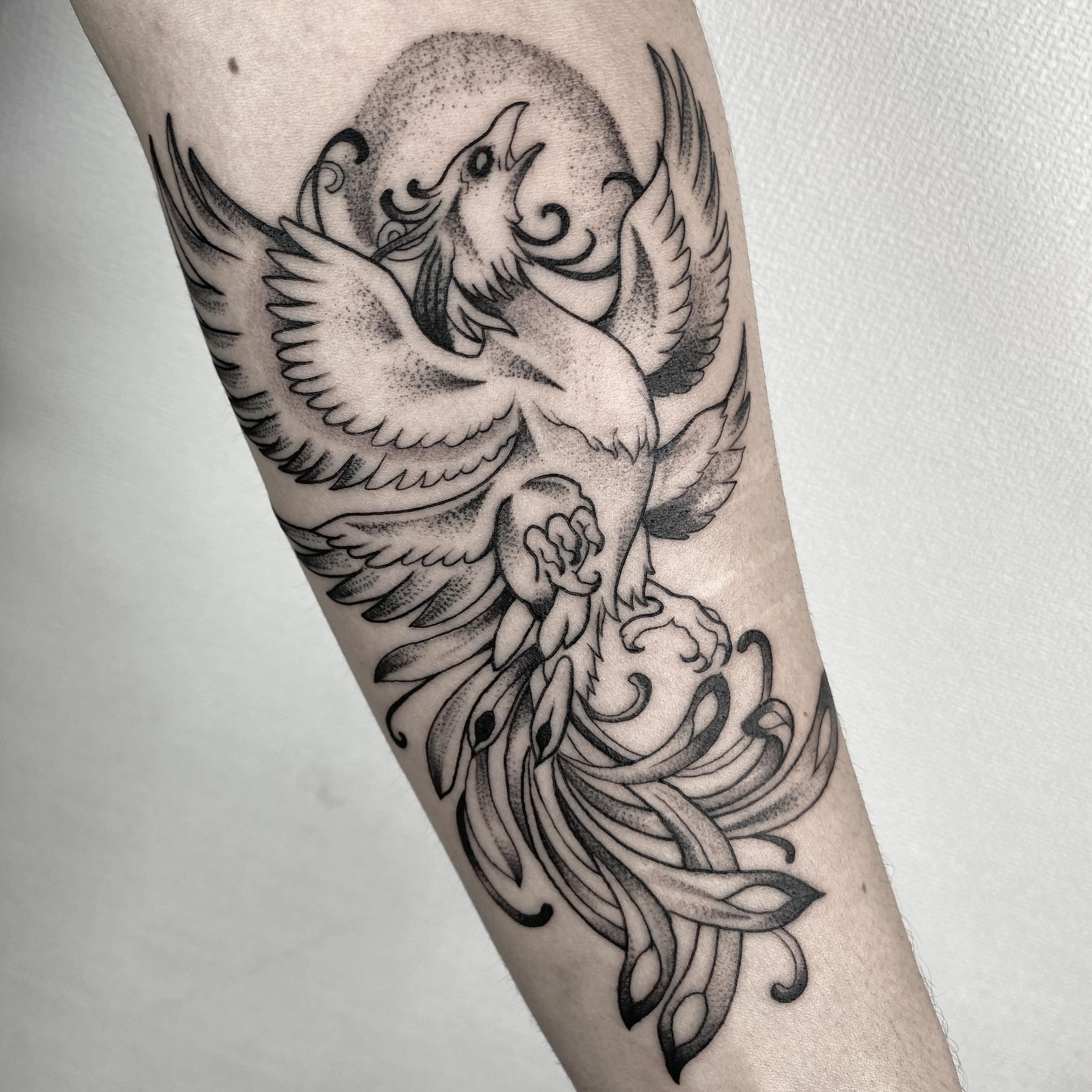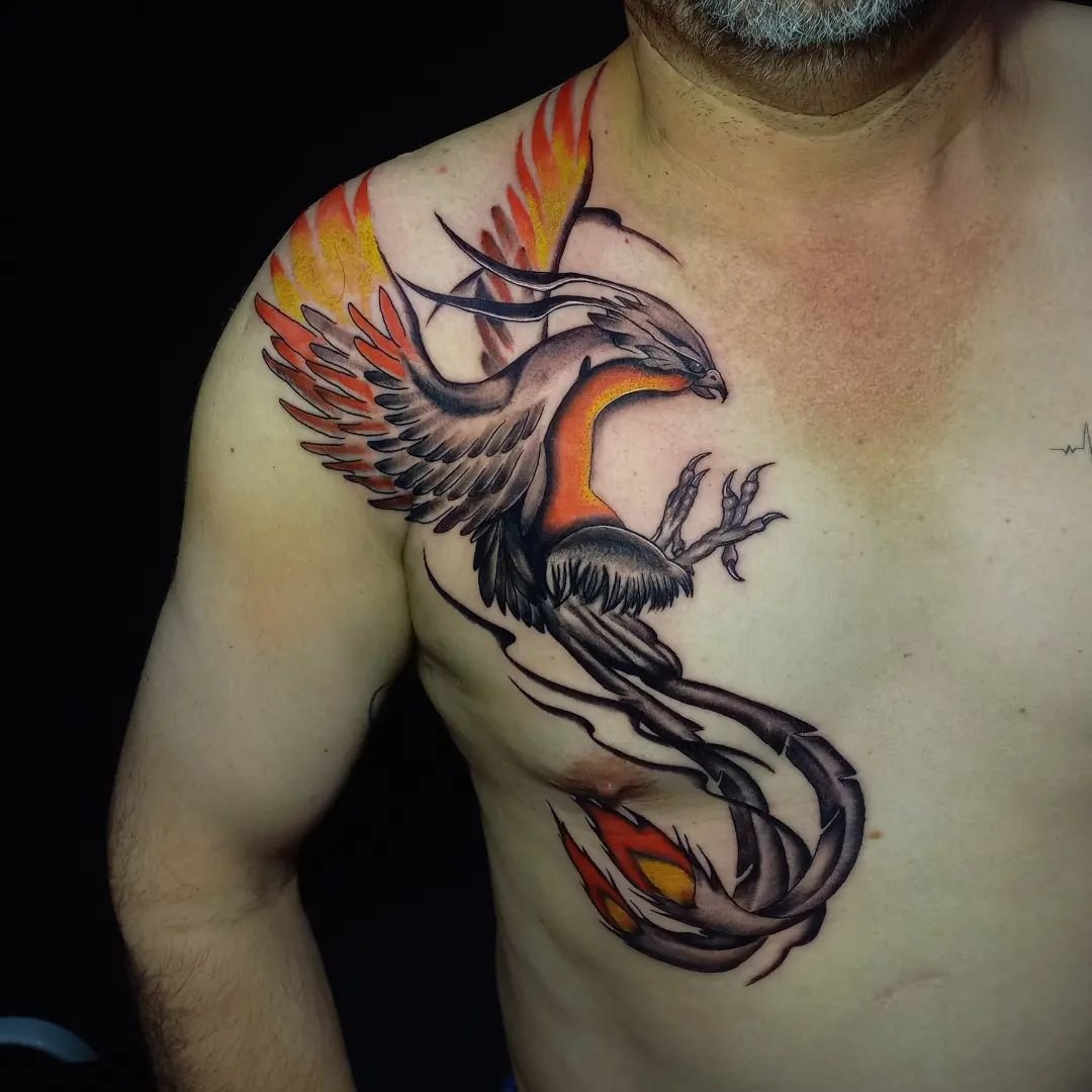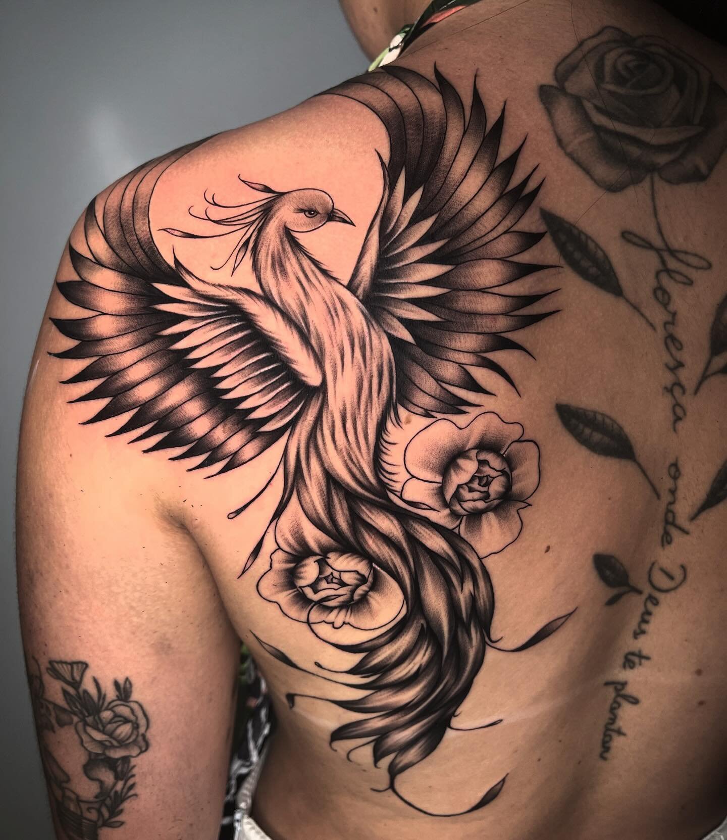 Obrázek fénixa sloužil jako ozdoba římských mincí, vystupující jako znak označující nesmrtelnou Římskou říši. Podle některých legend získal fénix věčný život v Edenské zahradě, když odmítl ochutnat zakázané ovoce z dřeva. Poměrně často se setkáváme s obrázkem fénixa, vylétávajícího z ohně, který symbolizuje sílu vůle a vítězství. Takový obrázek je velmi populární, v této tetování oheň znamená smrt, a fénix - znamení vítězství nad smrtí a všemi životními obtížemi. Také taková tetování mluví o znovuzrození, novém začátku života. Poměrně často si tetování s vylétávajícím z ohně fénixem vybírají duchovně silní lidé, kteří prožili mnoho obtíží, neslomili se, nechali všechny problémy za sebou a pokračují dál ve své životní cestě.