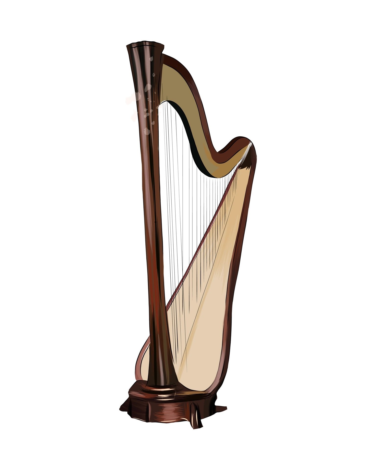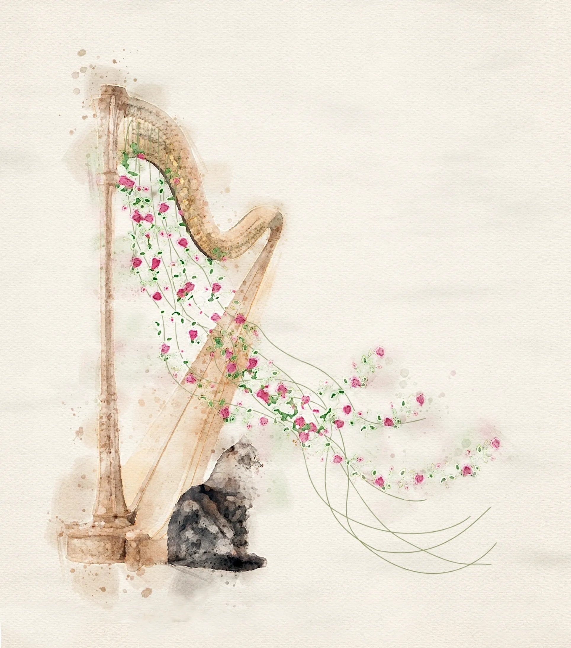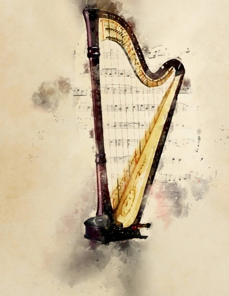 Harfa může být také součástí kresby, která zobrazuje úplnější obraz: mohou zde být další postavy a předměty, což rozvíjí sémantické zatížení obrazu. Může to být rám z vaší oblíbené produkce nebo náčrt linií z eposu nebo balady.
