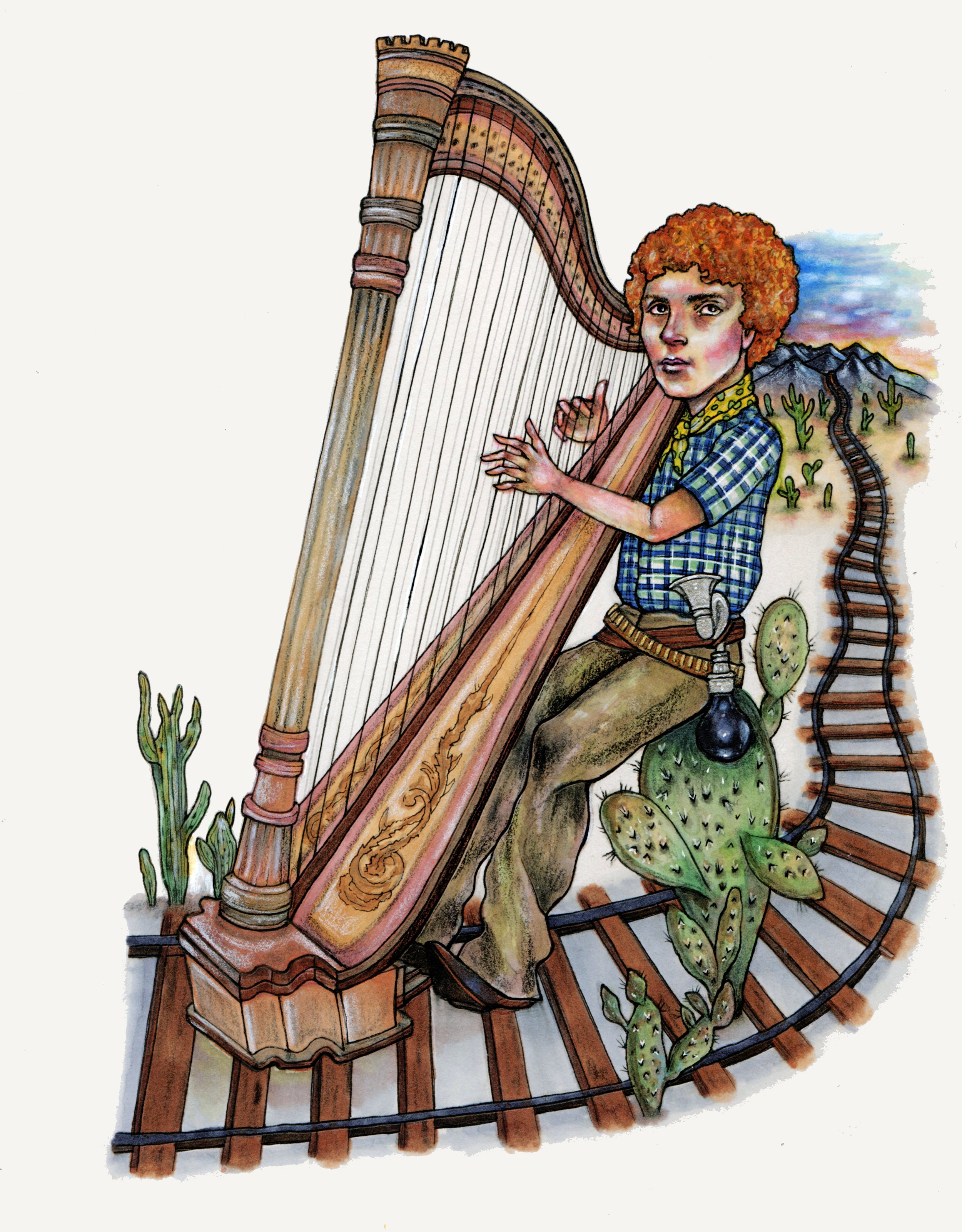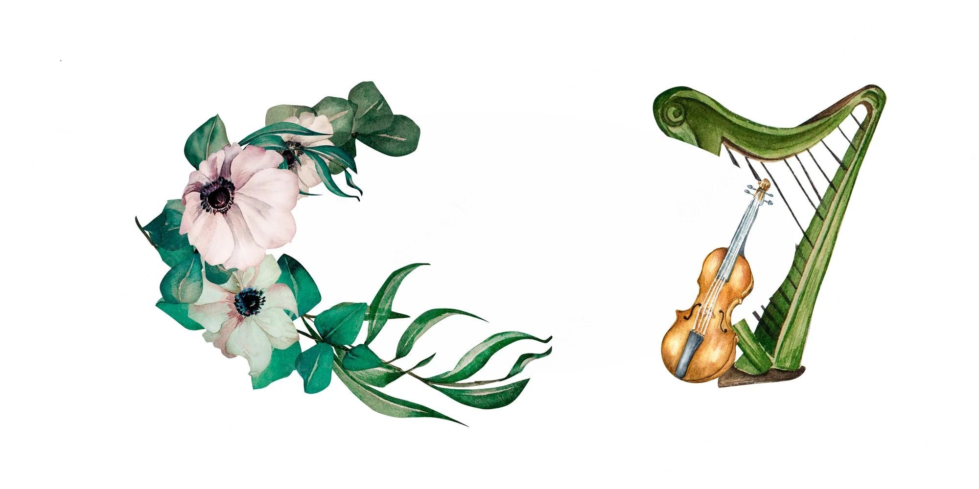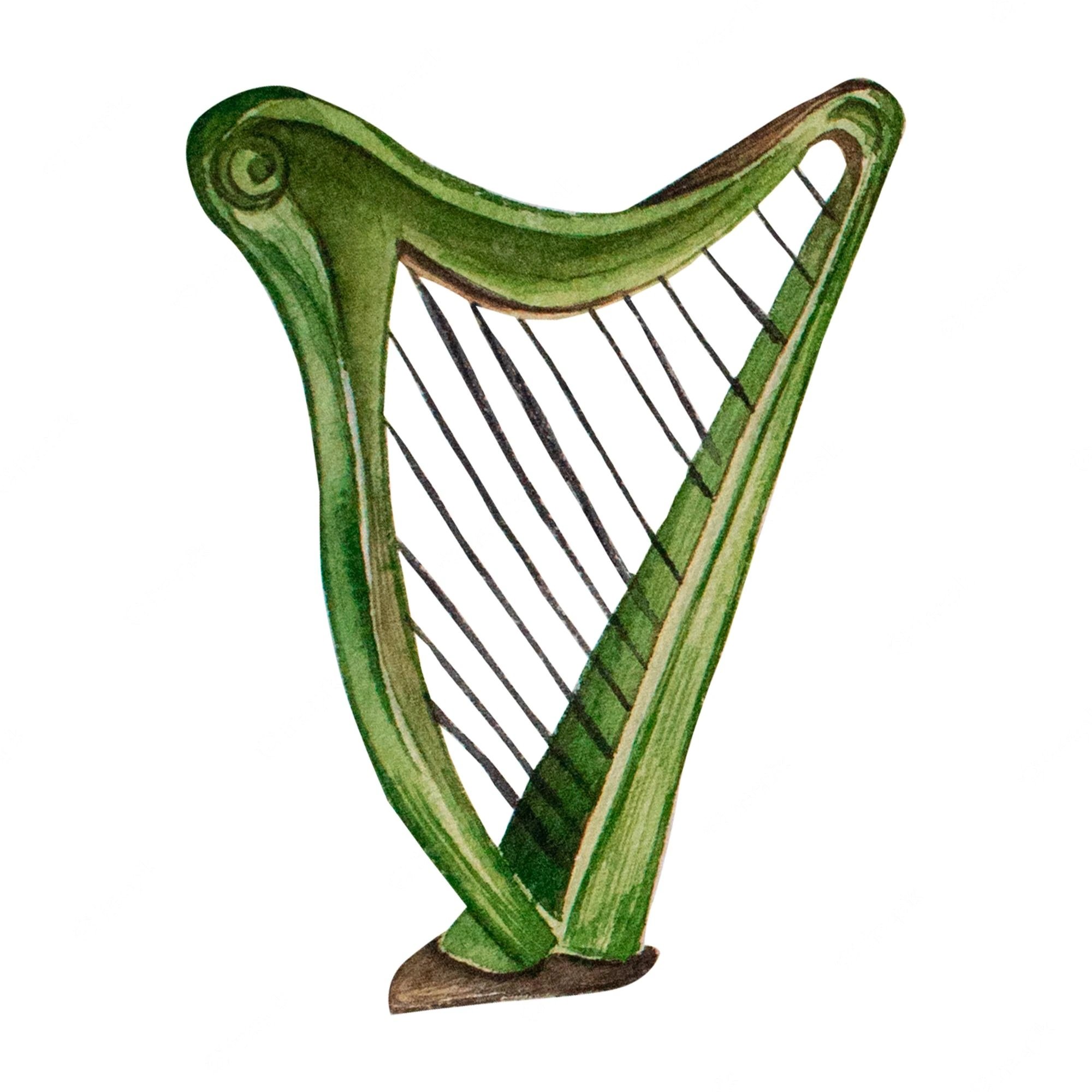 Harfa může být také součástí kresby, která zobrazuje úplnější obraz: mohou zde být další postavy a předměty, což rozvíjí sémantické zatížení obrazu. Může to být rám z vaší oblíbené produkce nebo náčrt linií z eposu nebo balady.
