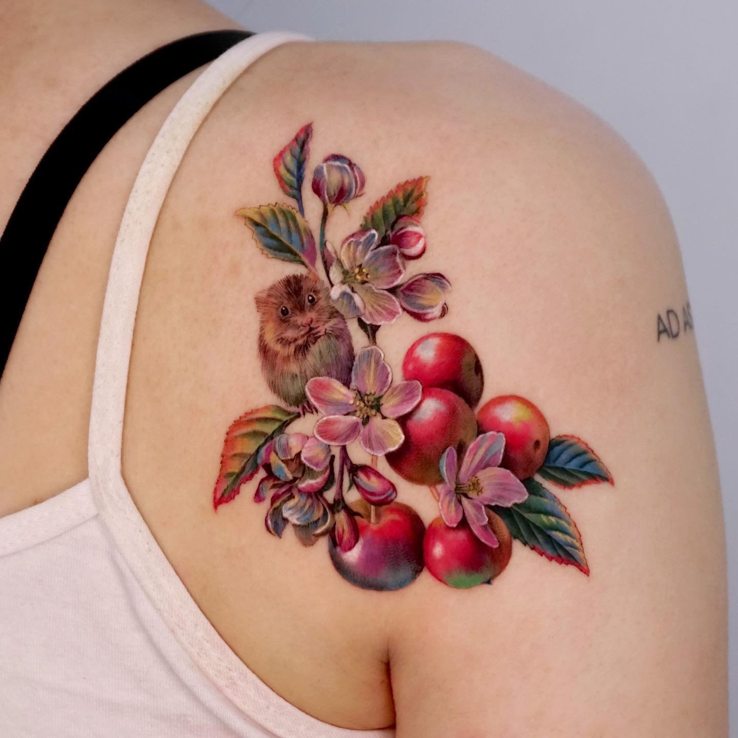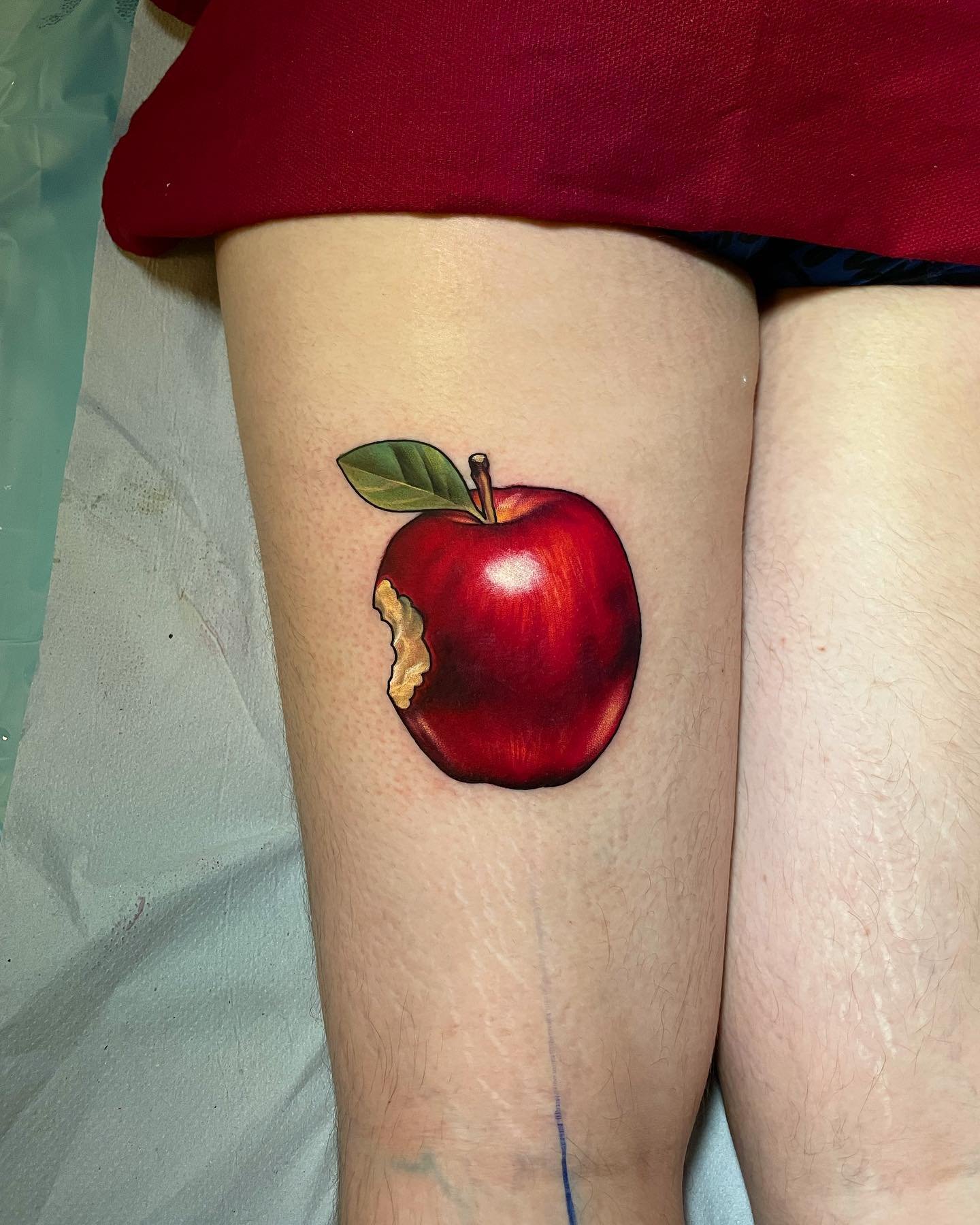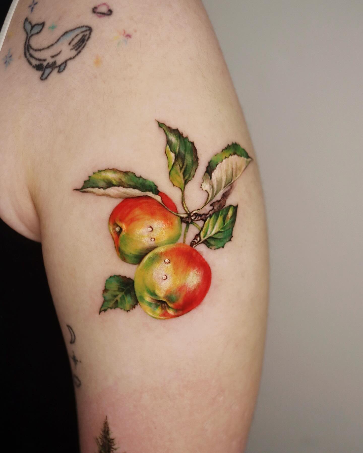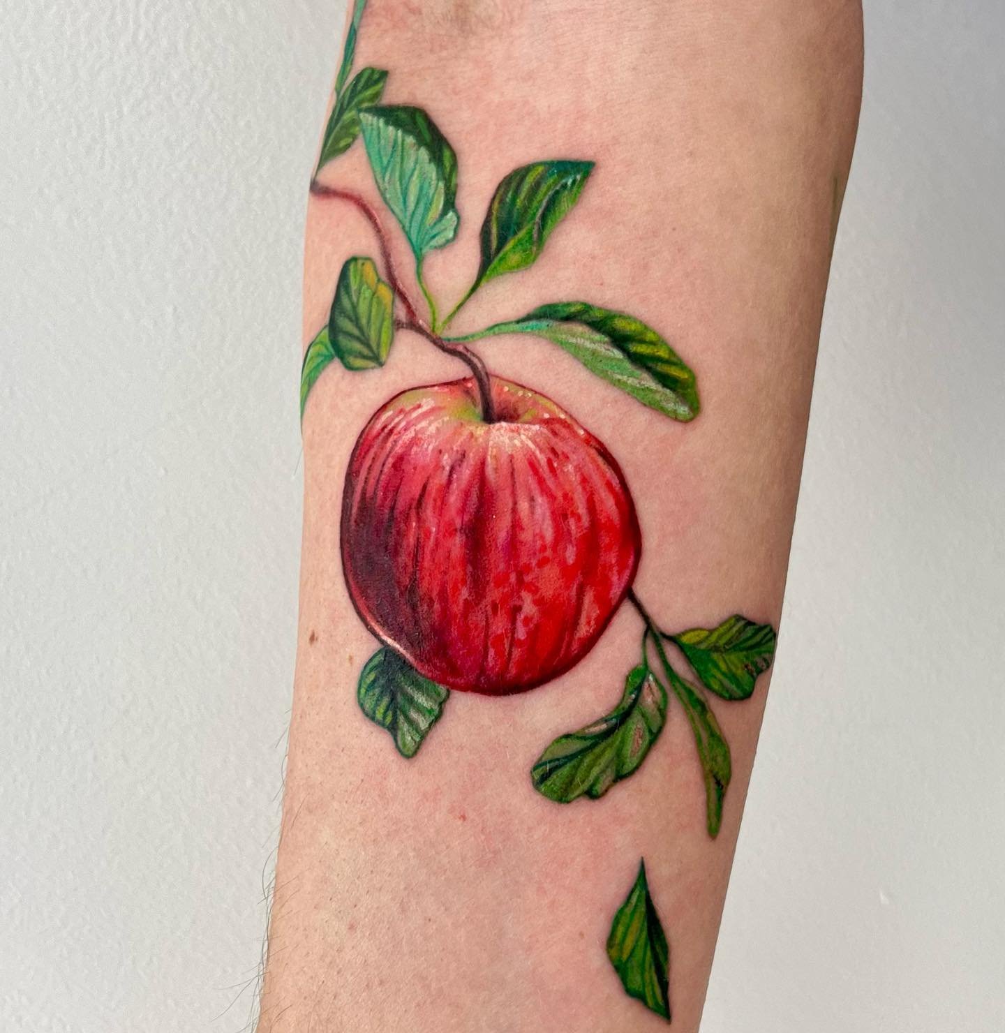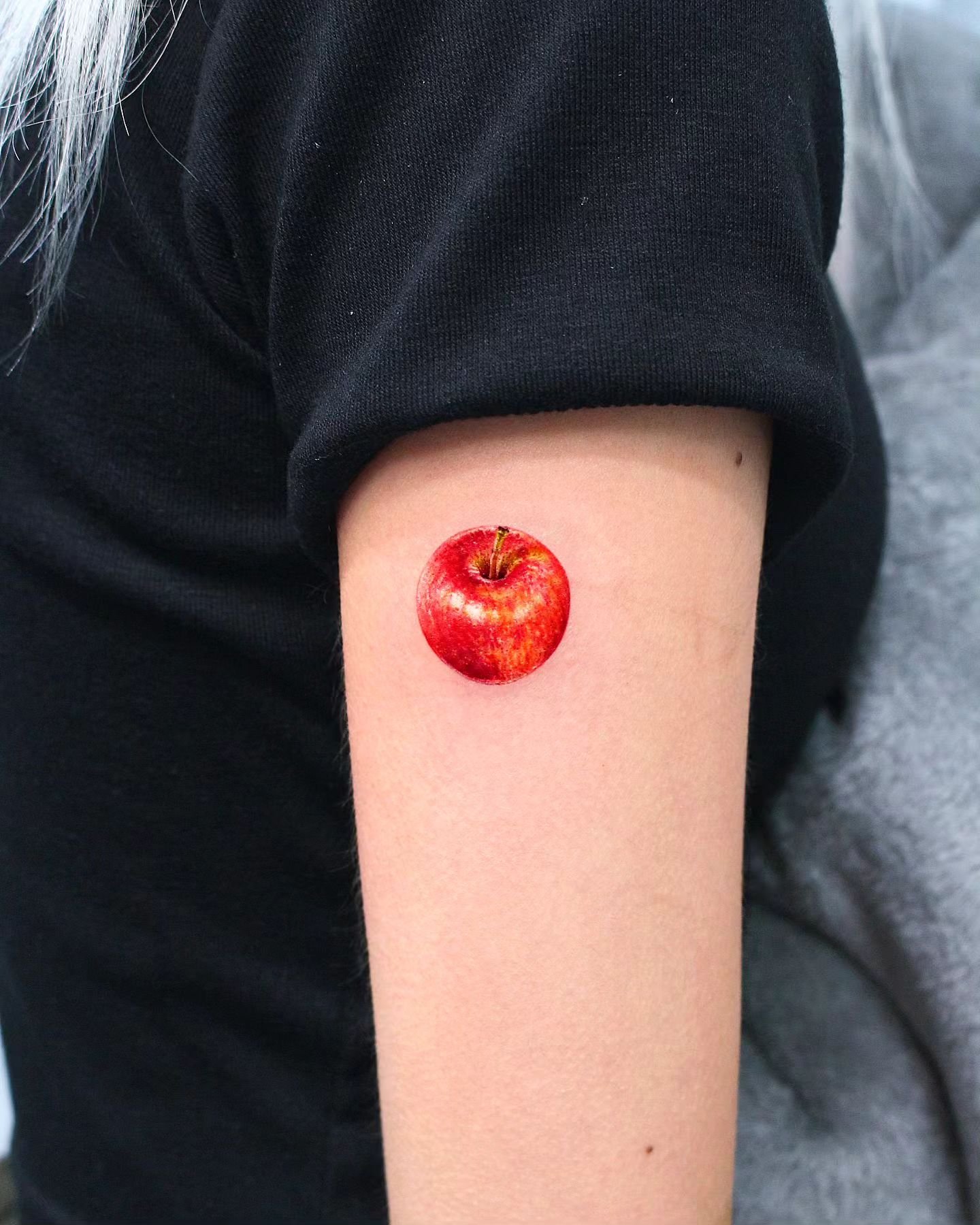 Realismus - univerzální styl, jablko na vašem těle bude vypadat jako skutečné, ne jen jako obrázek. Zvlášť realistický vzhled jablka dodávají drobné detaily, jako jsou kapky rosy, šťavnatý lesk, který předává chuť jablka. Je třeba poznamenat, že tetování v tomto stylu je poměrně náročná práce, vyžadující zvláštní znalosti a nemalou zkušenost.