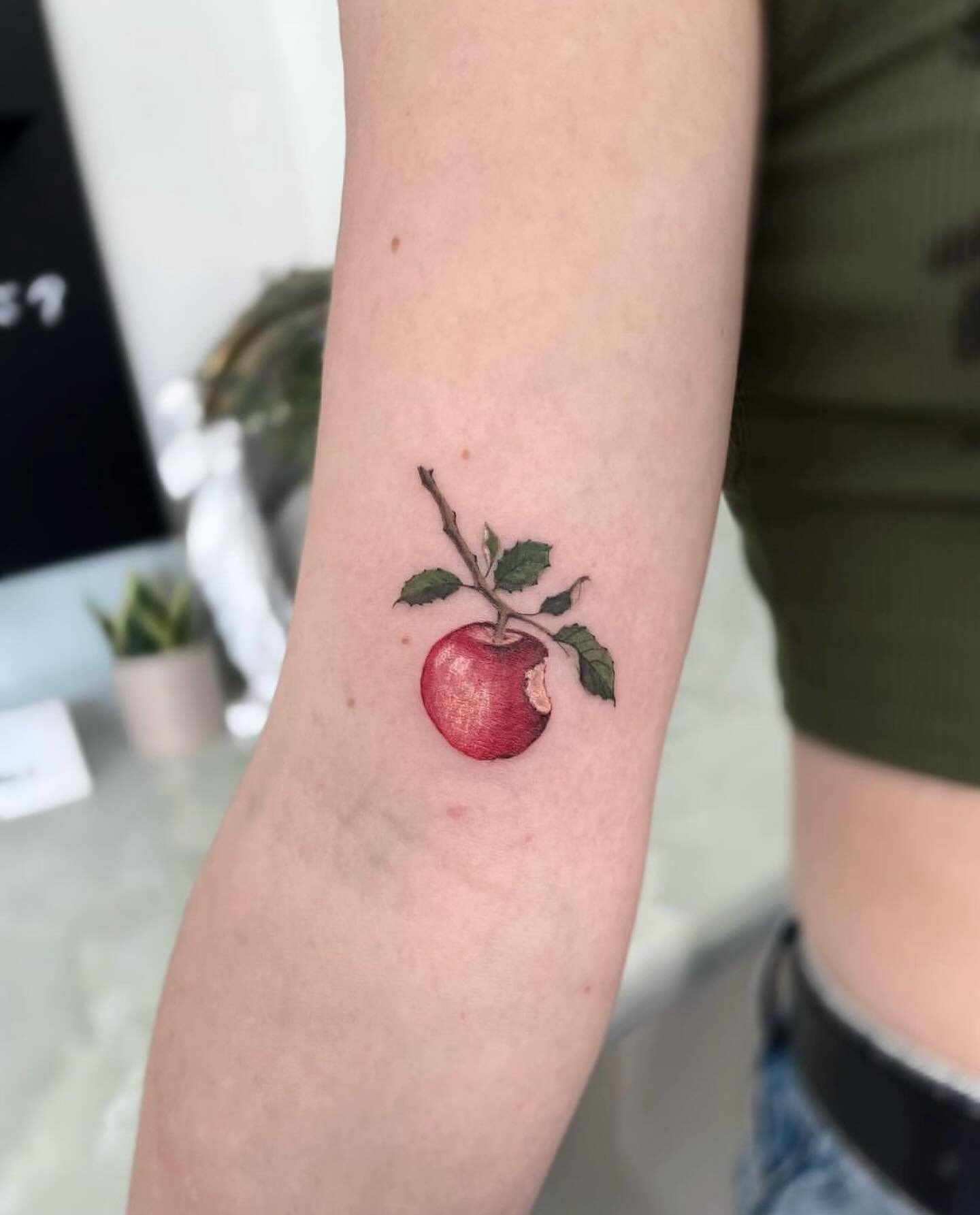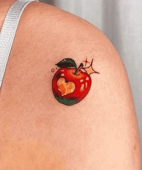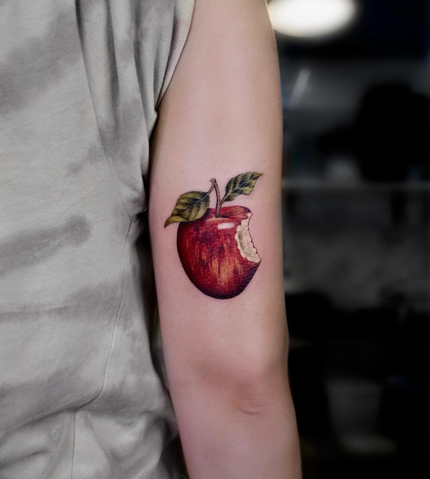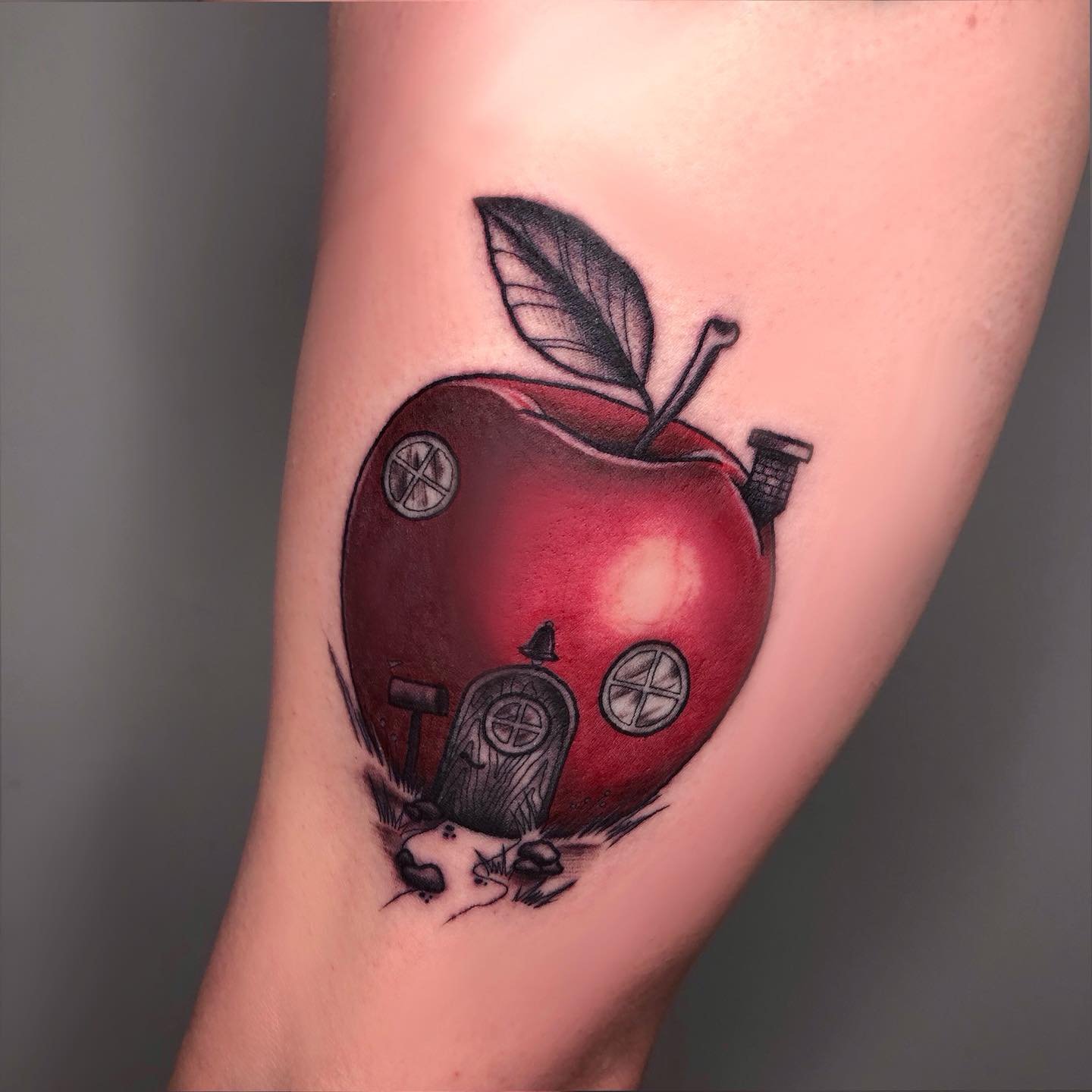 Animovaný styl také vyhovuje pro tetování s jablkem, obrázek bude vypadat originálně a neobvykle.