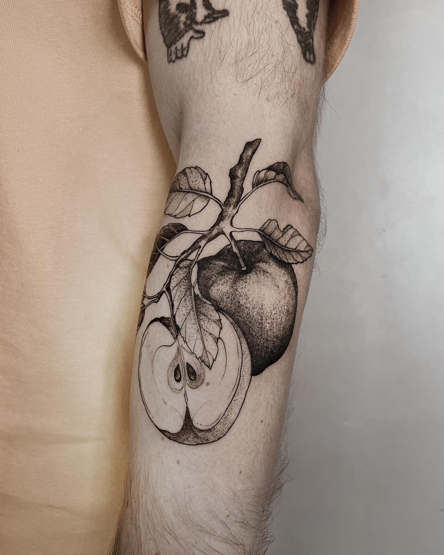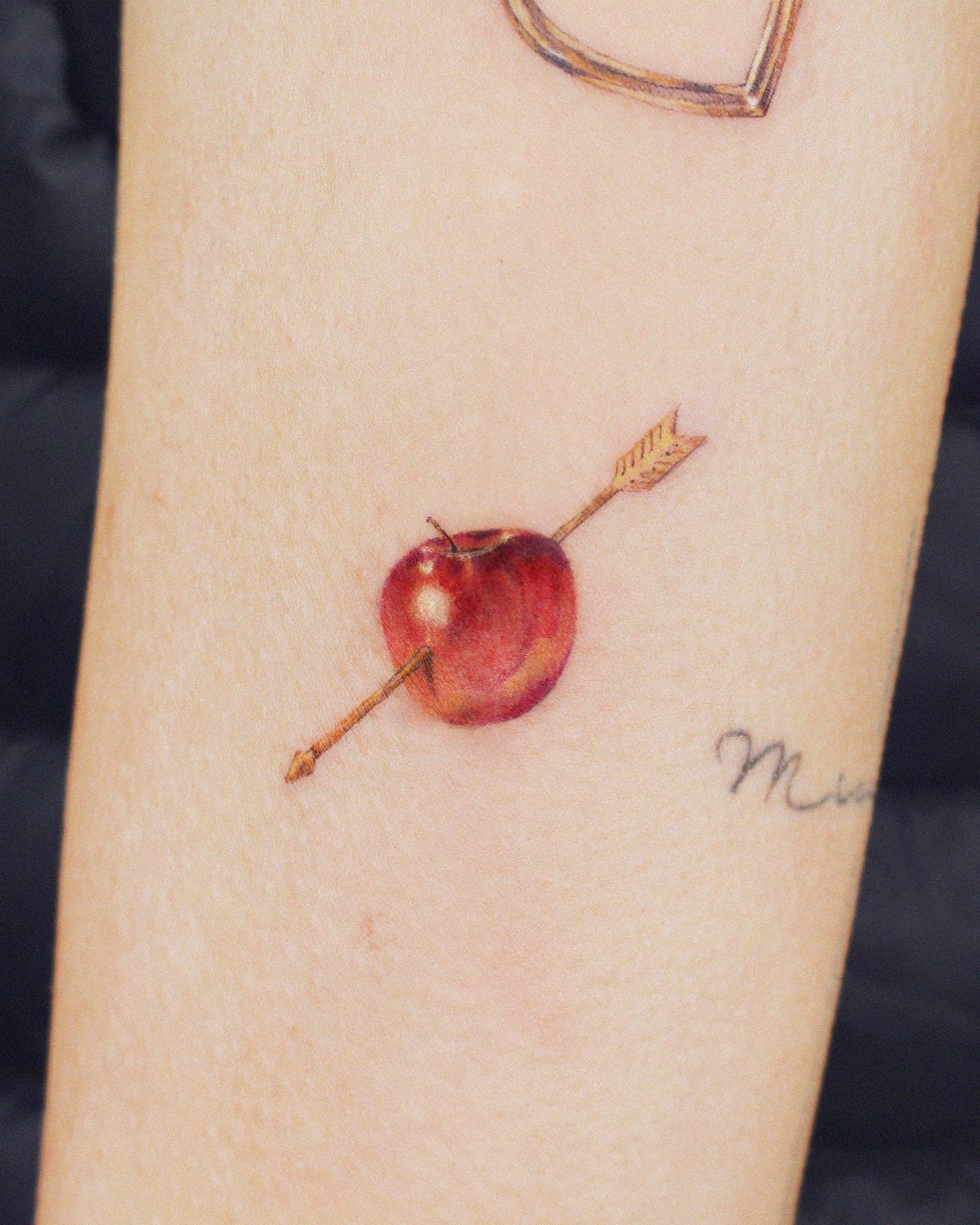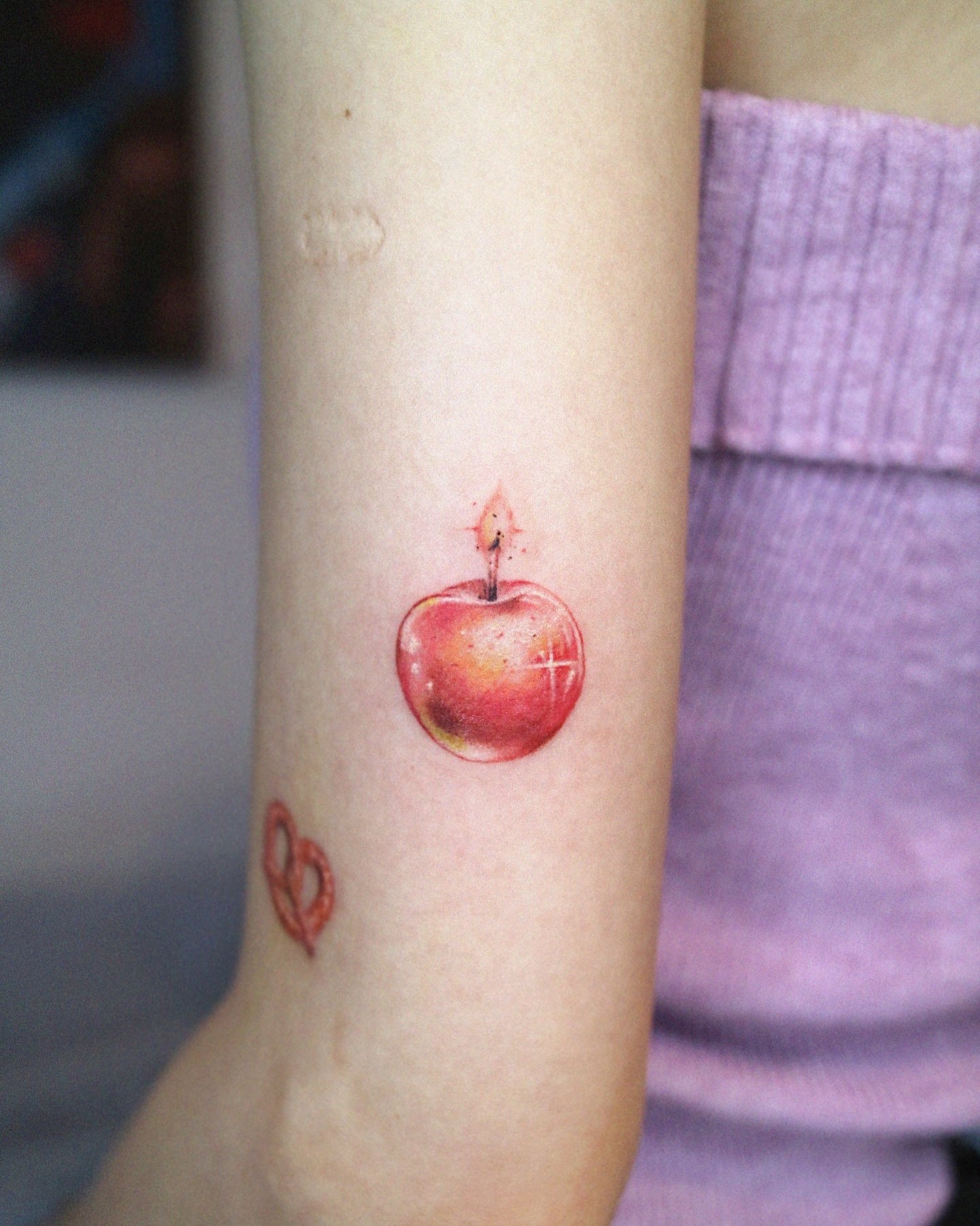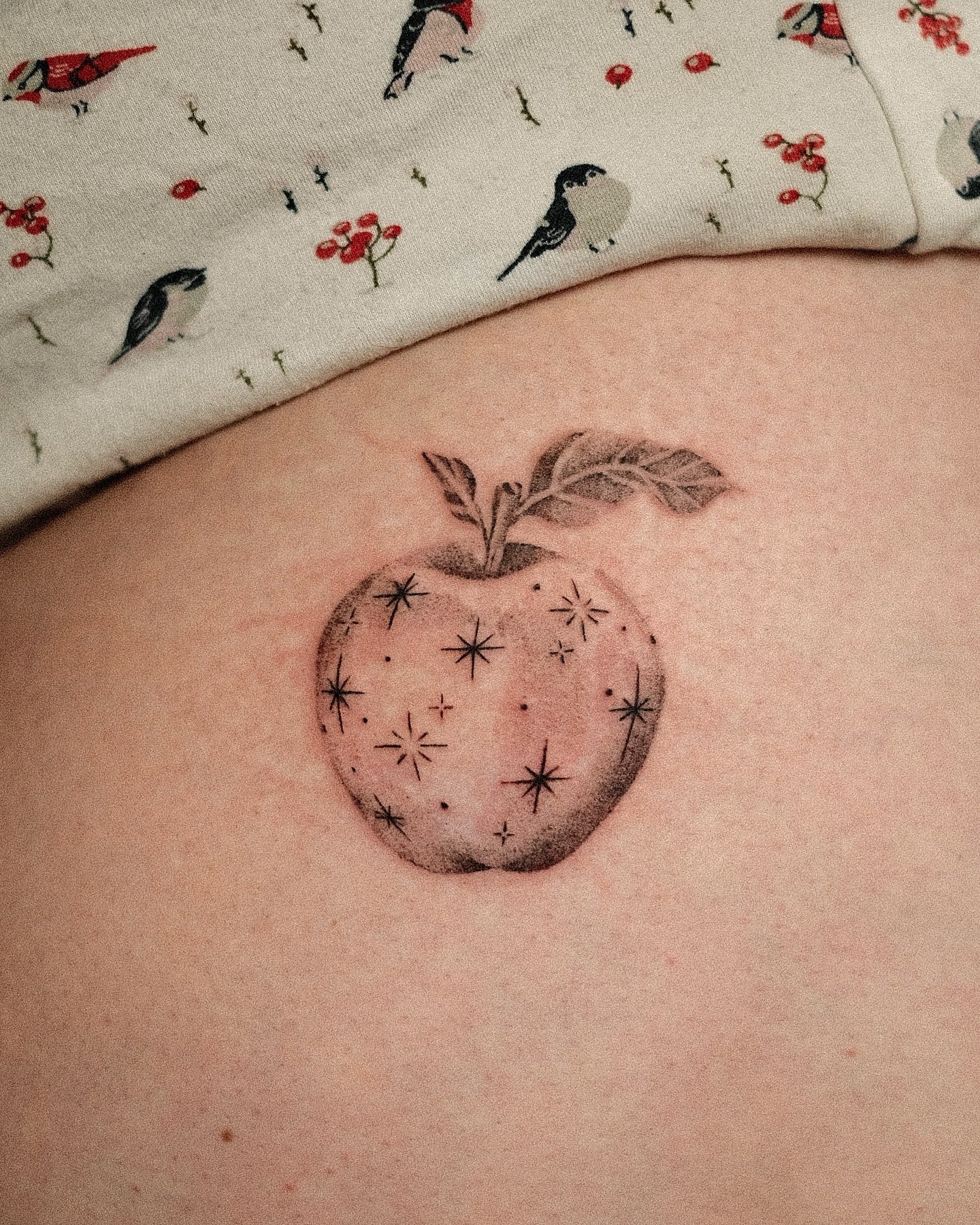 Animovaný styl také vyhovuje pro tetování s jablkem, obrázek bude vypadat originálně a neobvykle.