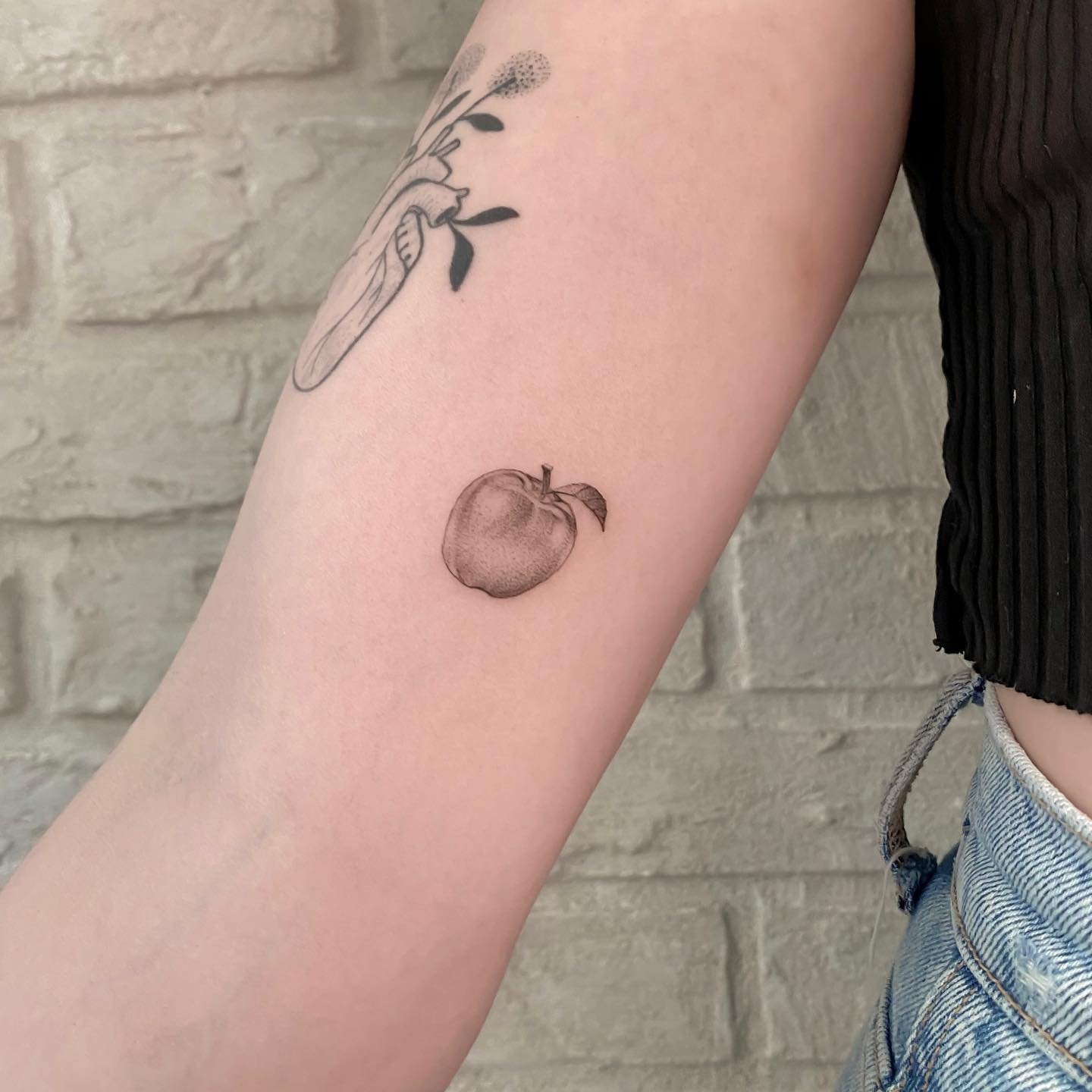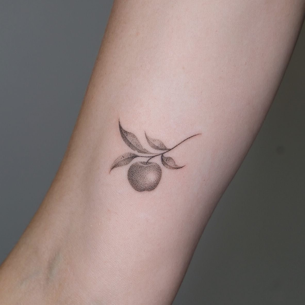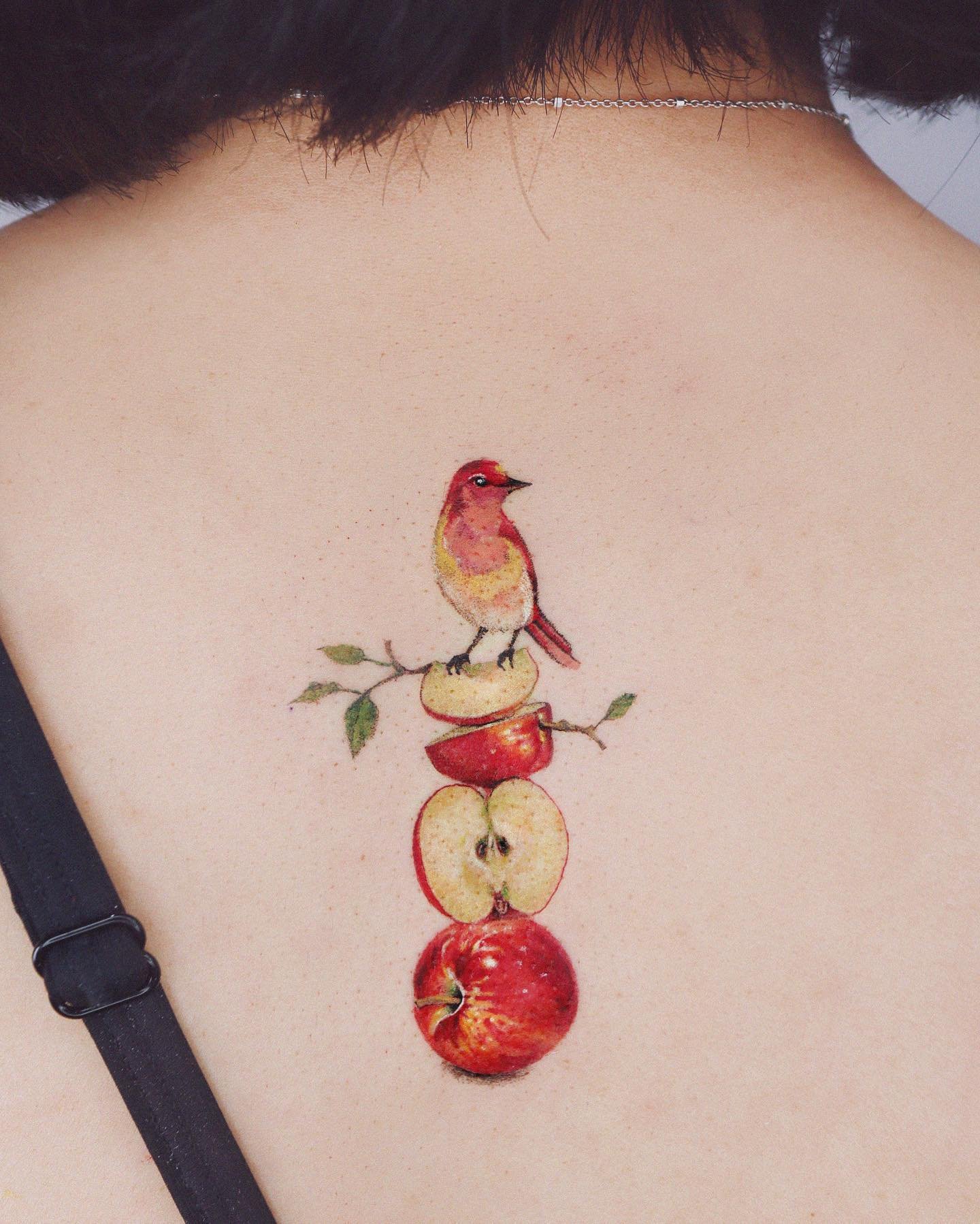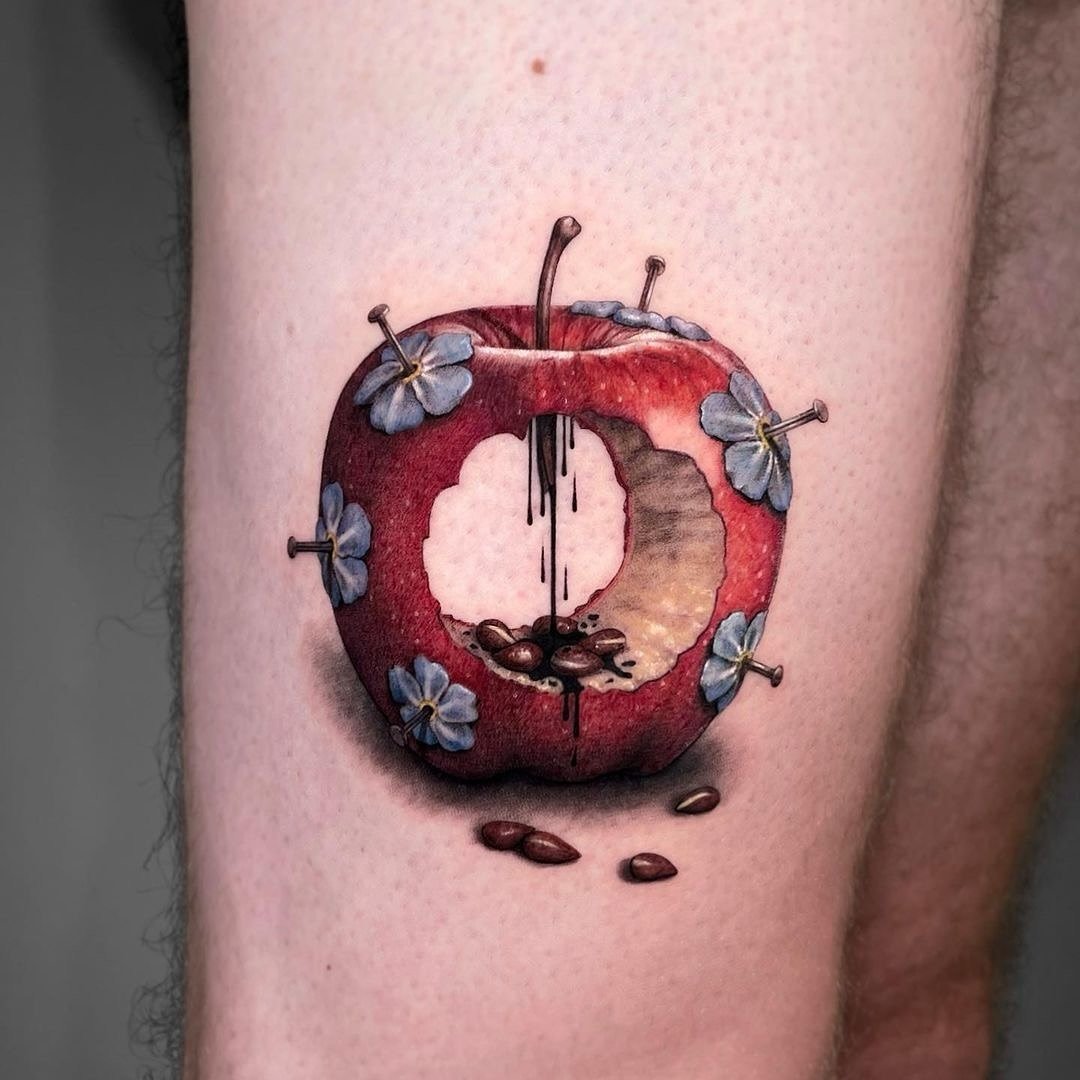 Animovaný styl také vyhovuje pro tetování s jablkem, obrázek bude vypadat originálně a neobvykle.