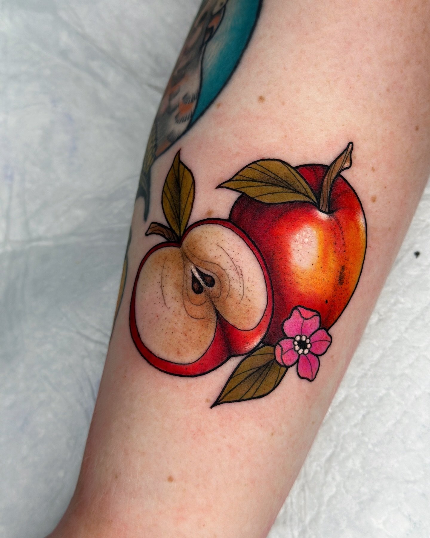 Velmi výrazně, šťavnatě, neobvykle vypadá jablko ve stylech New school, stejně jako Old school. V obraze bude přítomný černý obrys, často doplněný o stuhy, růže a další doplňkové prvky.