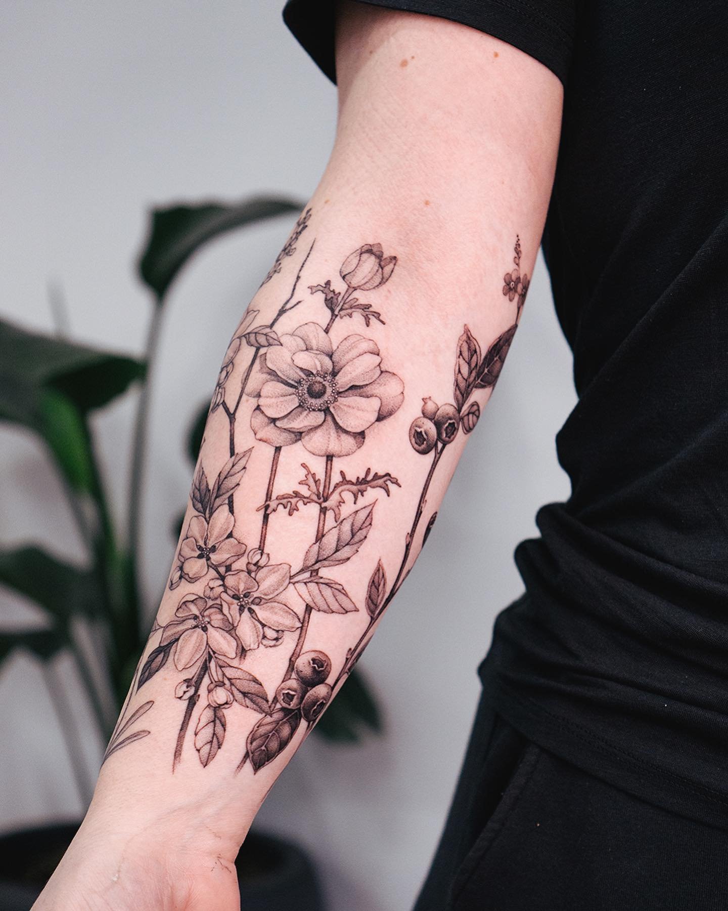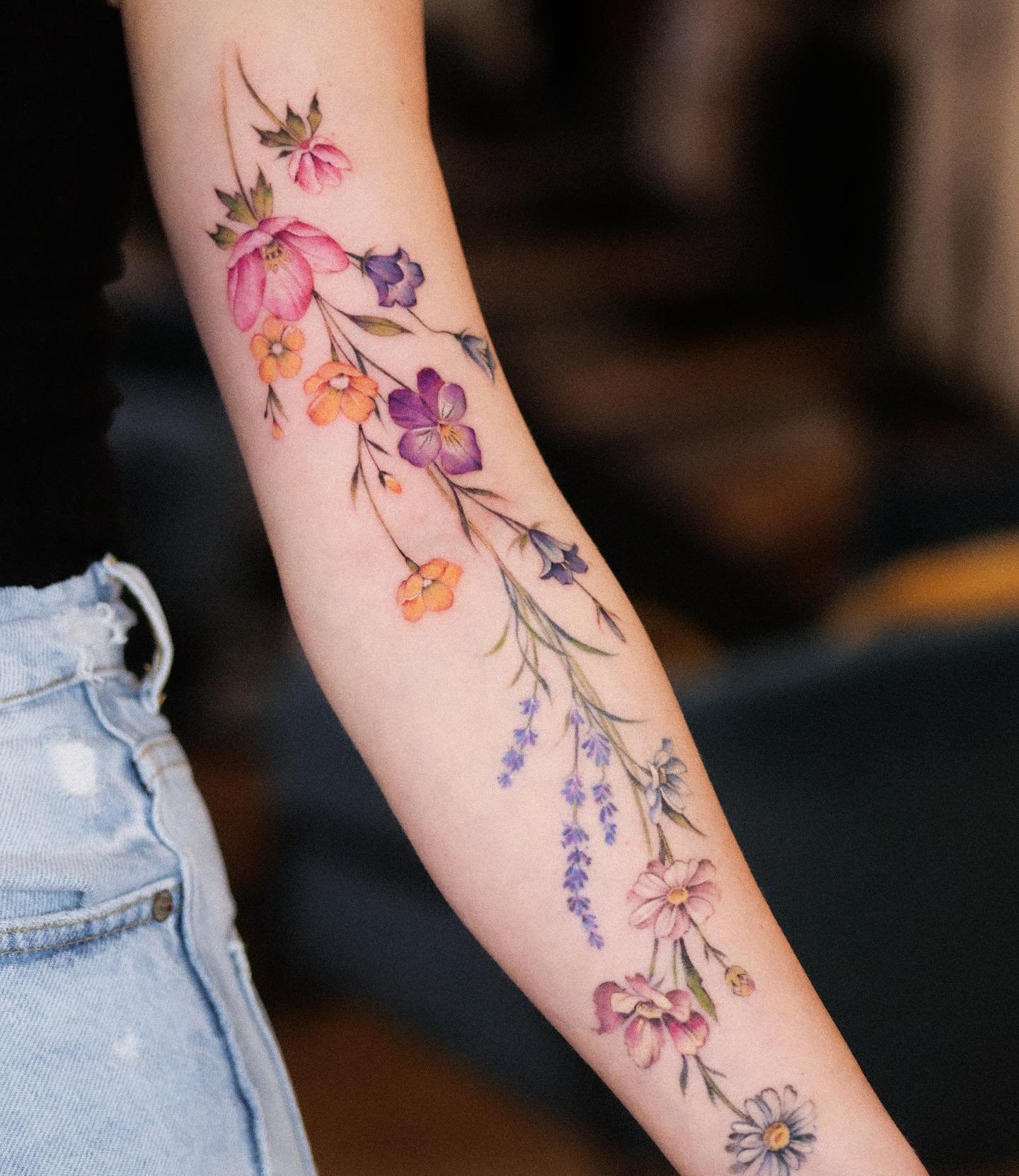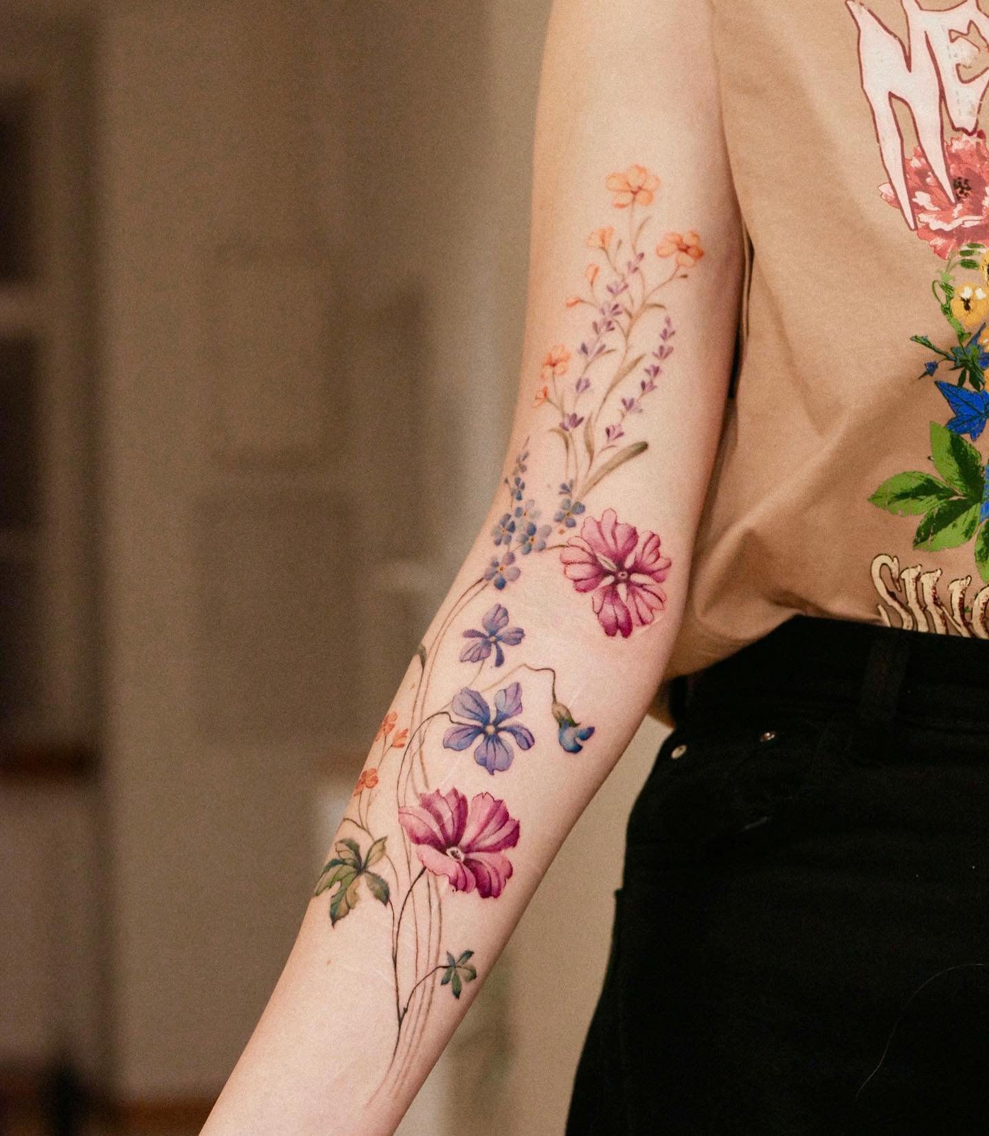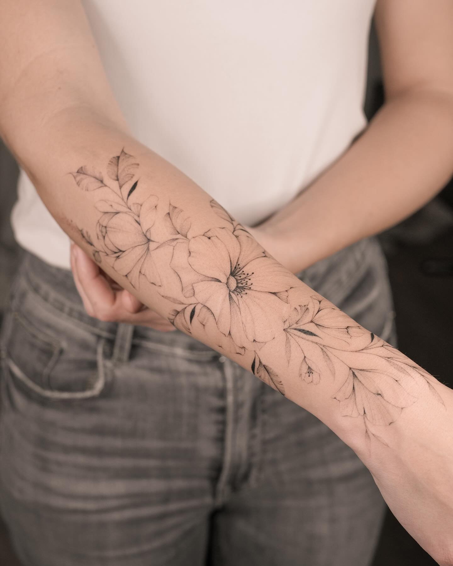 Můžete zobrazit celé kytice jednoho druhu květin, tak i různých druhů. Obvykle jsou tetování květin prováděna v barevných, živých tónech, nejčastěji ve realistickém stylu. Neskutečně šťavnatě a barevně vypadají tetování různých květin, provedených v technice akvarel. Černobílé tetování květin také má popularitu, vypadá stejně krásně a originálně. Místa pro tetování si můžete vybrat různá, muži preferují ruce nebo ramena. U žen bude zobrazení jakéhokoli květu vypadat velmi krásně a žensky na jakékoliv části těla.