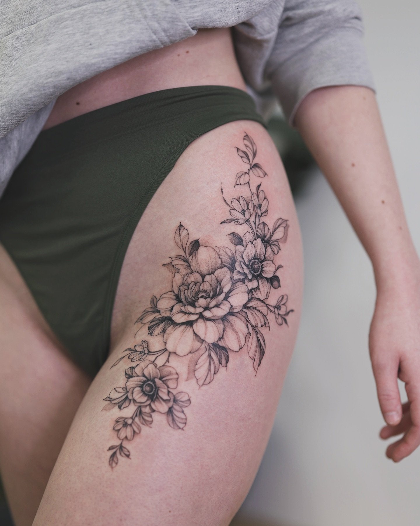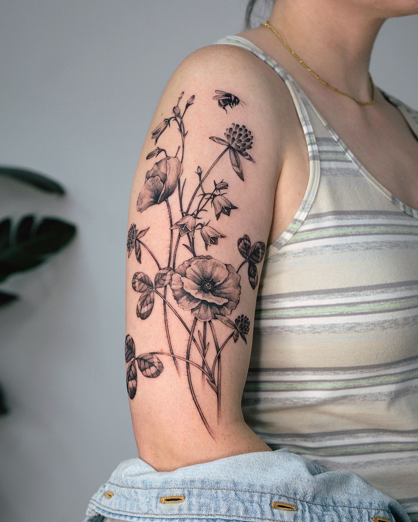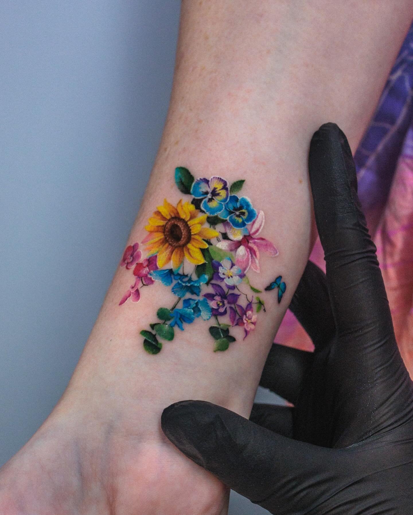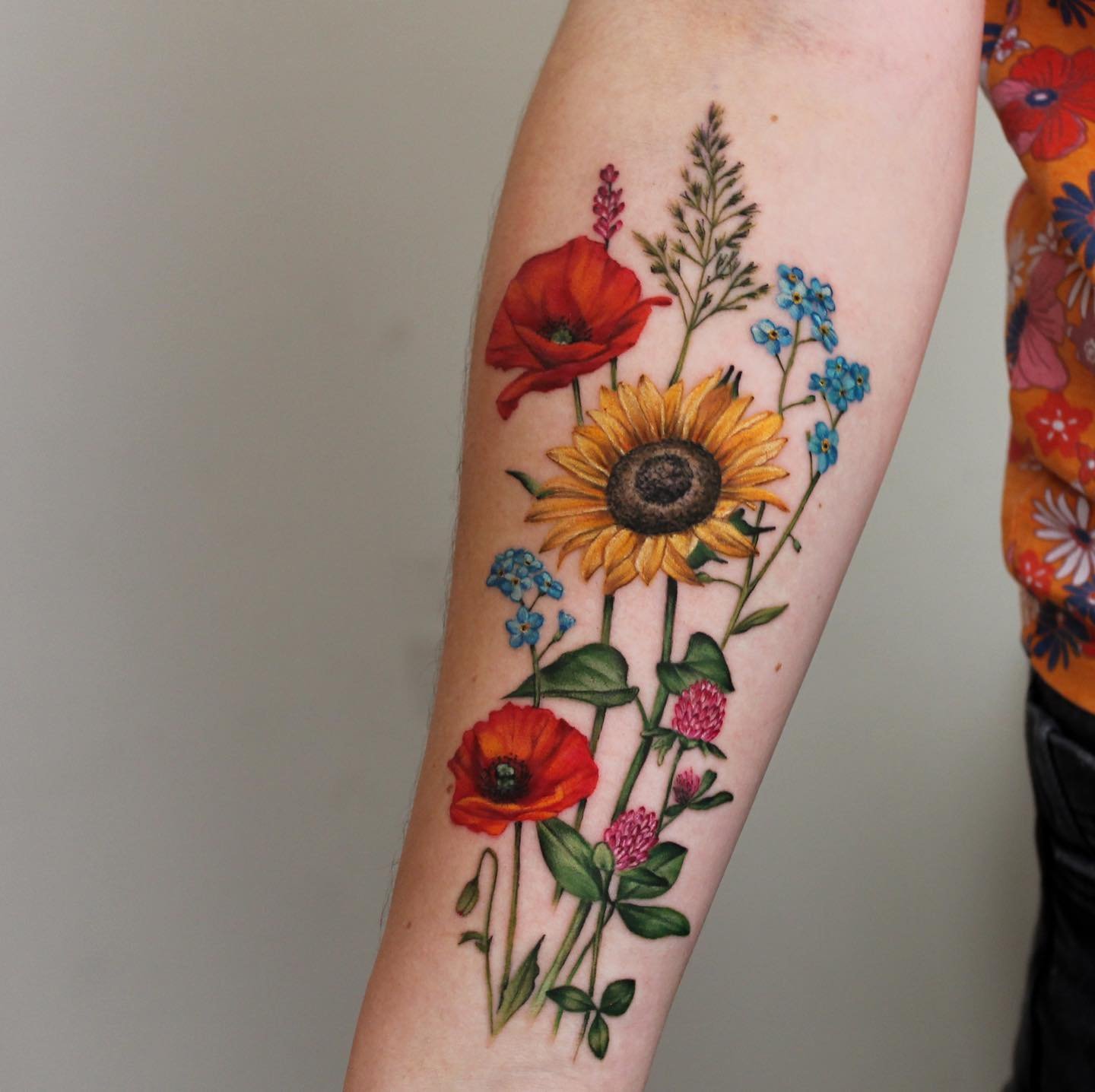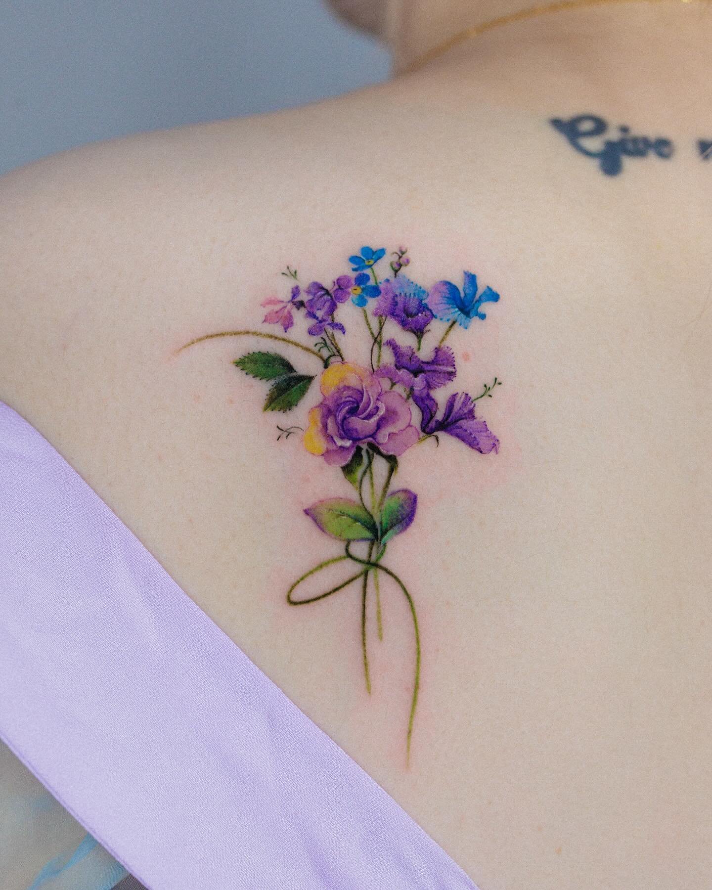 Můžete zobrazit celé kytice jednoho druhu květin, tak i různých druhů. Obvykle jsou tetování květin prováděna v barevných, živých tónech, nejčastěji ve realistickém stylu. Neskutečně šťavnatě a barevně vypadají tetování různých květin, provedených v technice akvarel. Černobílé tetování květin také má popularitu, vypadá stejně krásně a originálně. Místa pro tetování si můžete vybrat různá, muži preferují ruce nebo ramena. U žen bude zobrazení jakéhokoli květu vypadat velmi krásně a žensky na jakékoliv části těla.