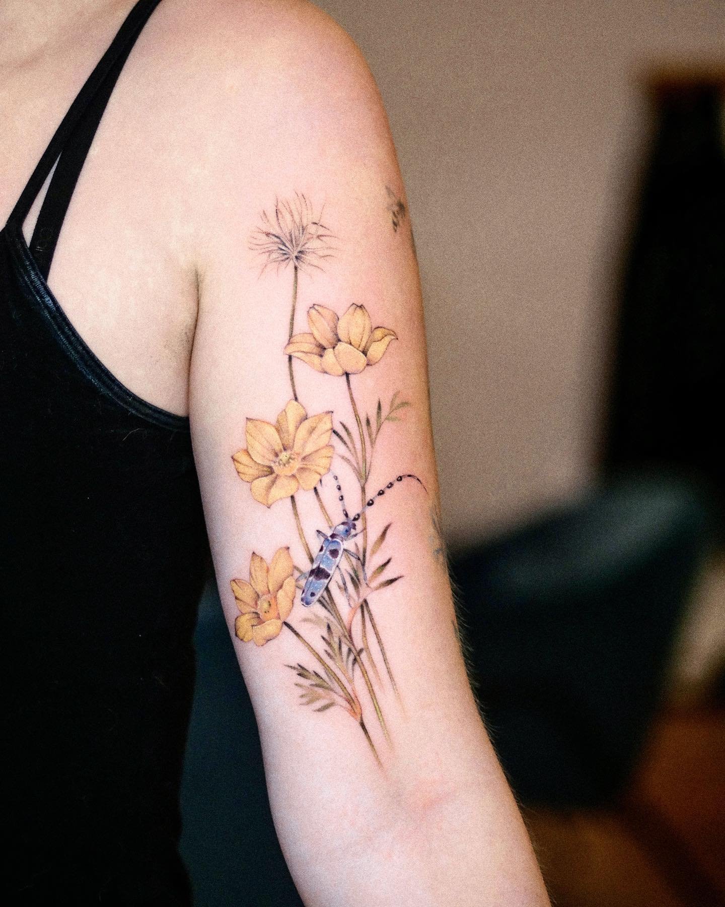 Obrazy květin jsou oblíbené jak u dívek, tak u chlapců. Tetování s květinami nejenže zdobí tělo, ale vždy vyvolává pozitivní emoce. Pro ozdobu těla si lidé vybírají různé květiny, někdo má rád růže, někdo lilie, jiní preferují sedmikrásky a tak dále. Každý konkrétní květ nese v sobě zvláštní význam, na význam tetování také vliv má barva, ve které je květ vyobrazen.