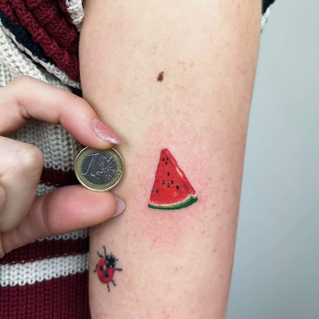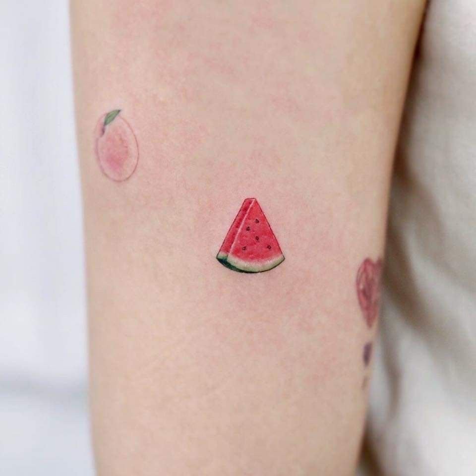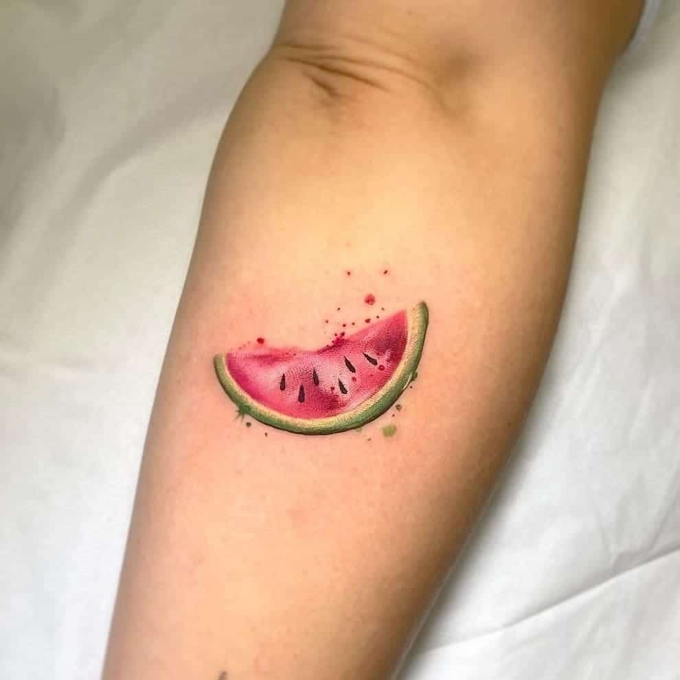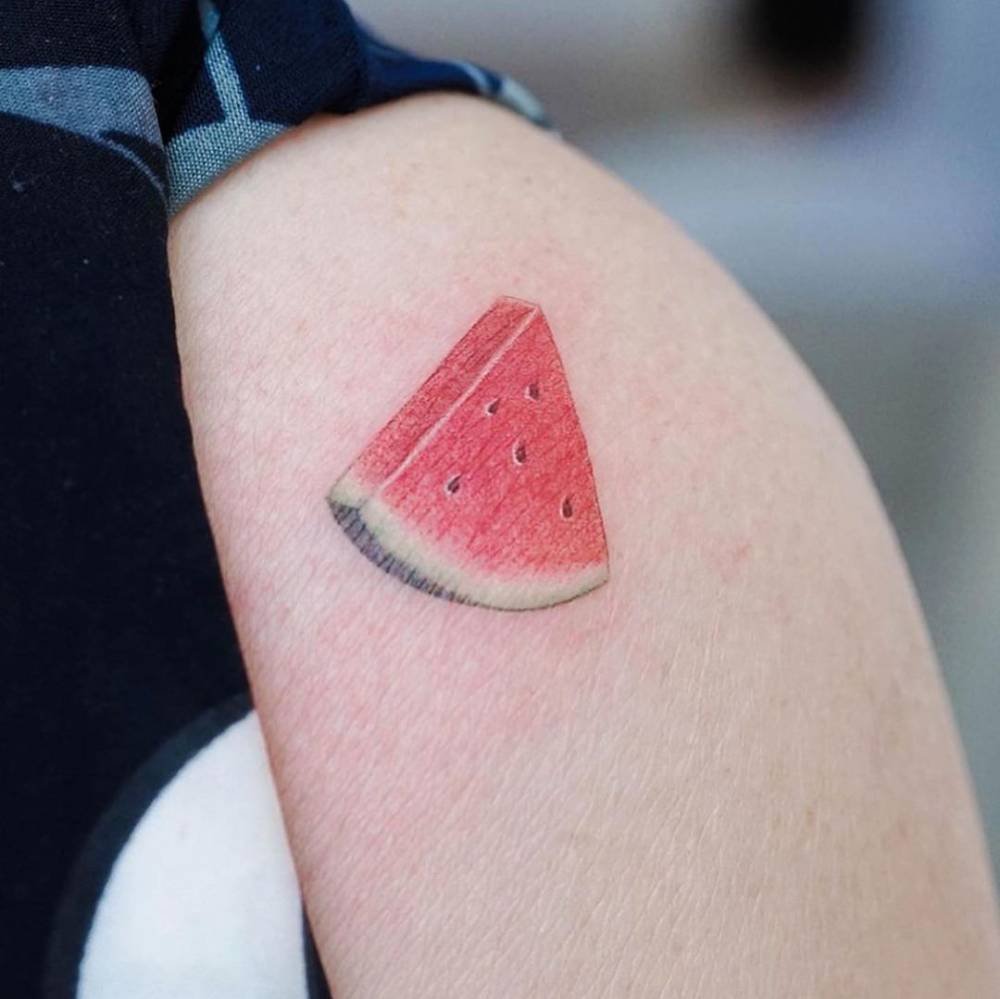Takové tetování ve formě melounu může říci, že dívka zdůrazňuje její mládí a krásu, přirozenost a jas.