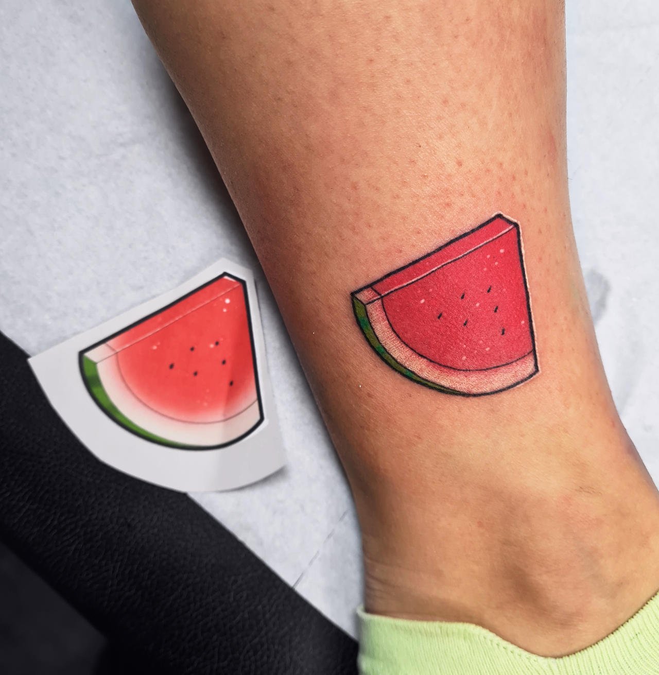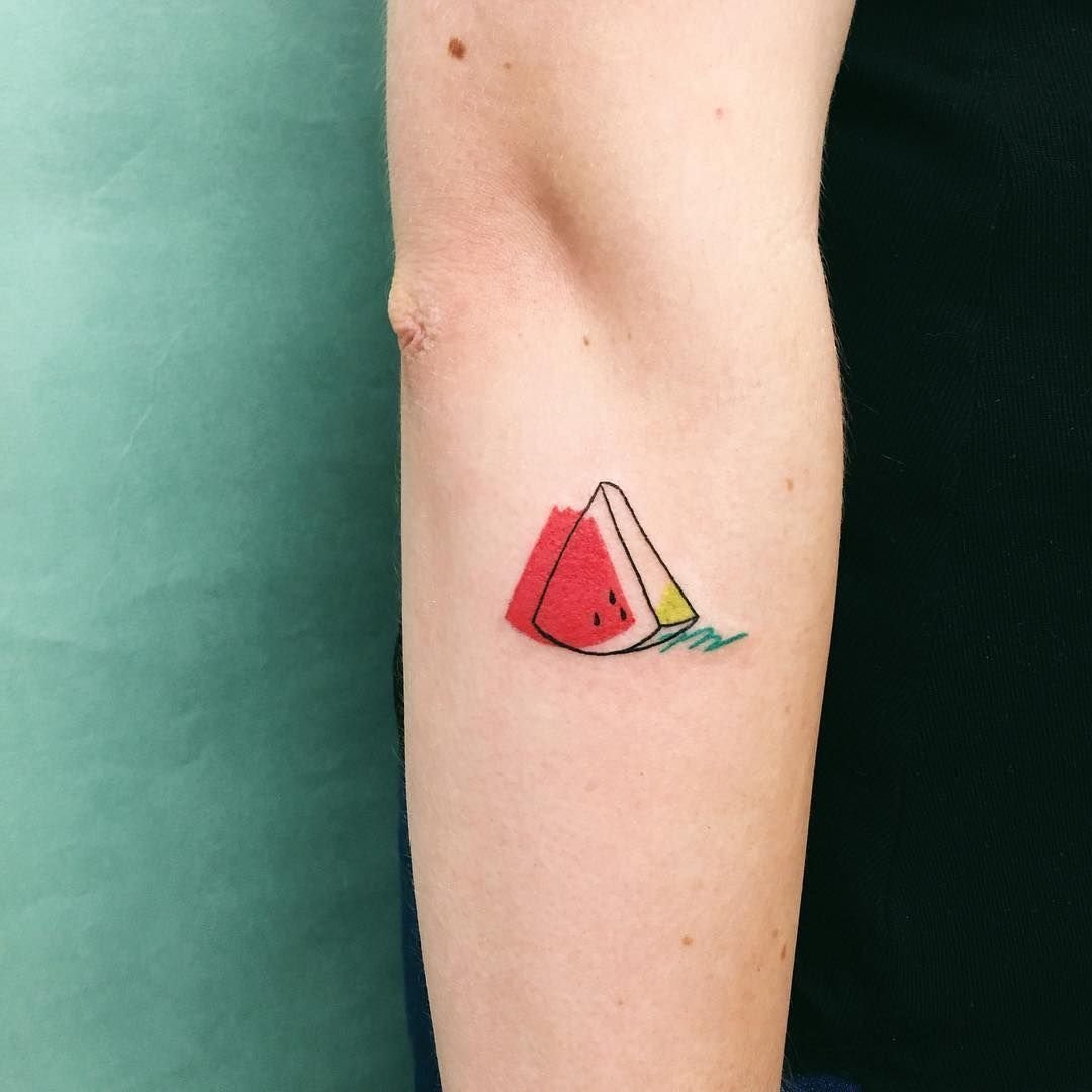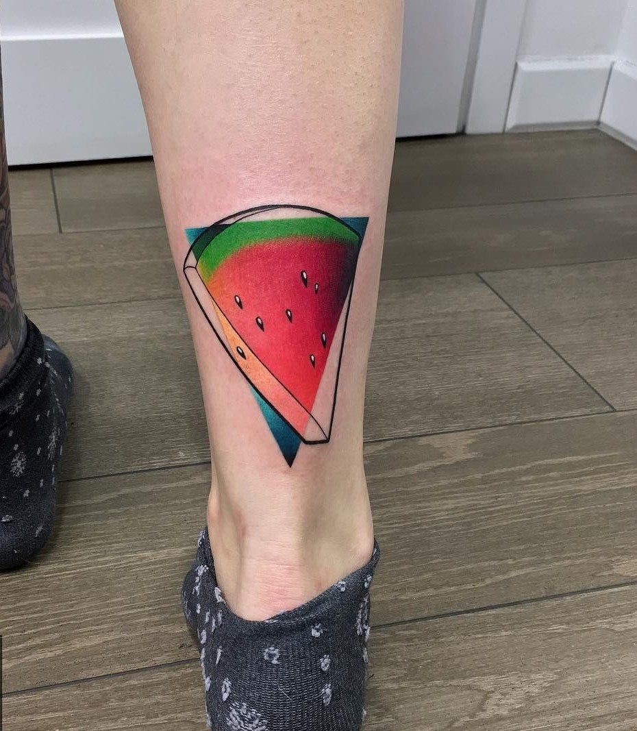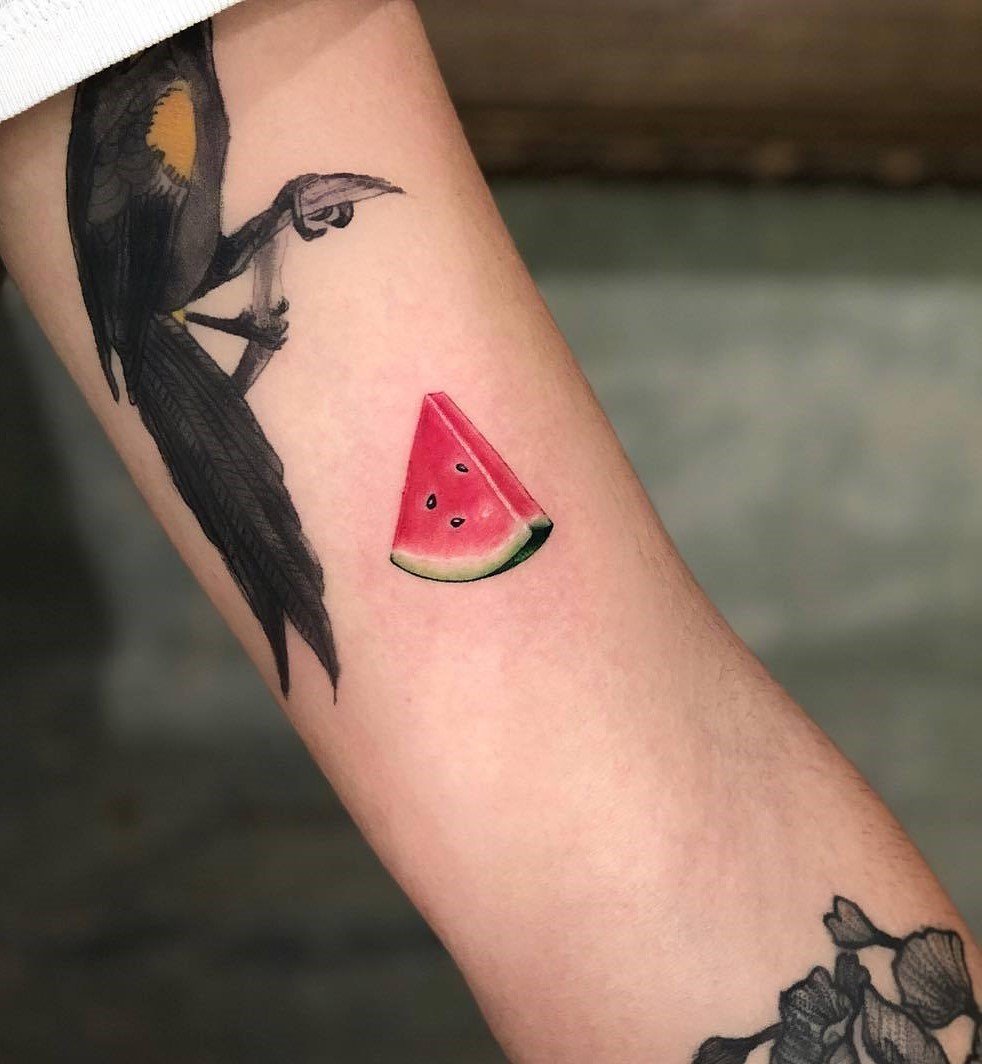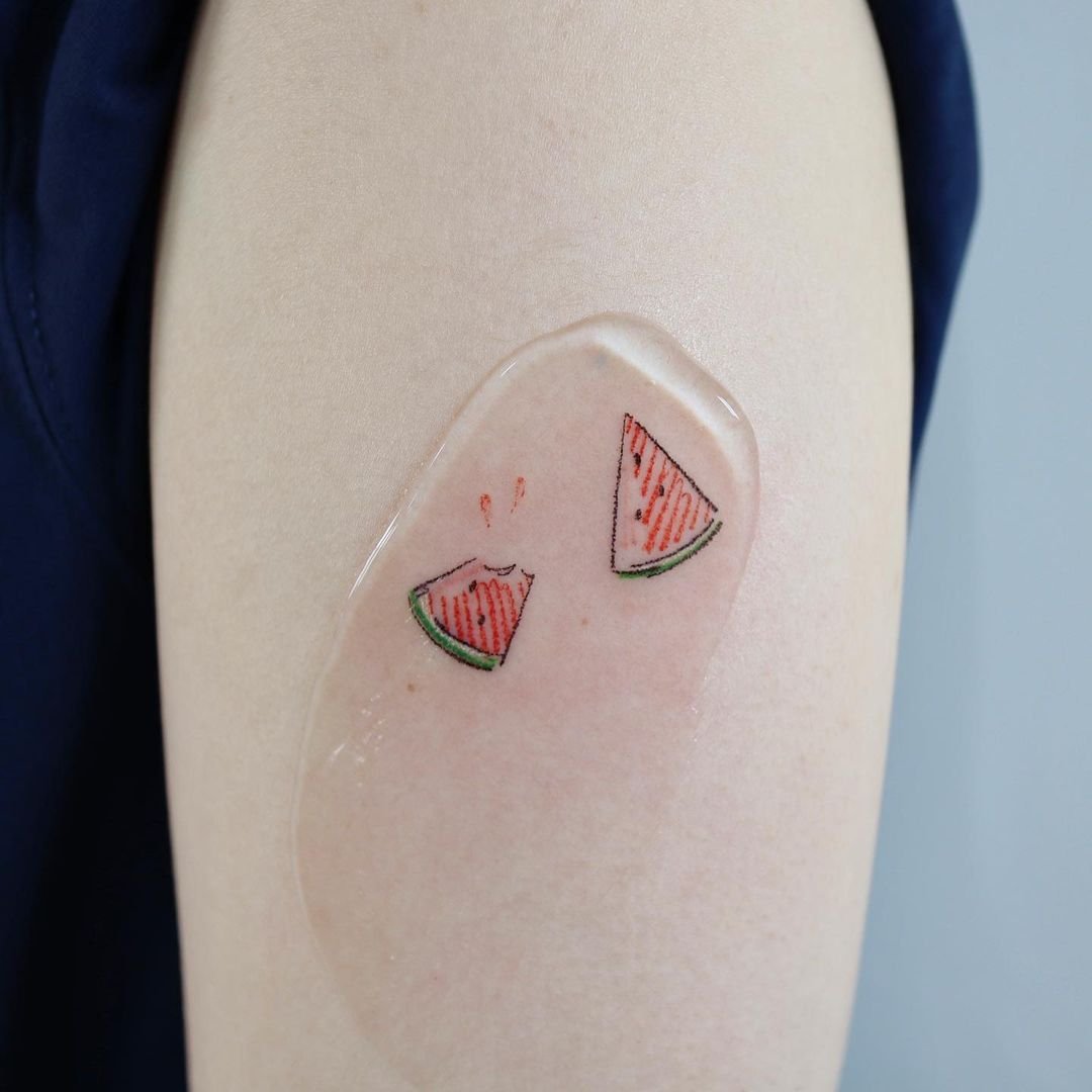 Takové tetování ve formě melounu může říci, že dívka zdůrazňuje její mládí a krásu, přirozenost a jas.