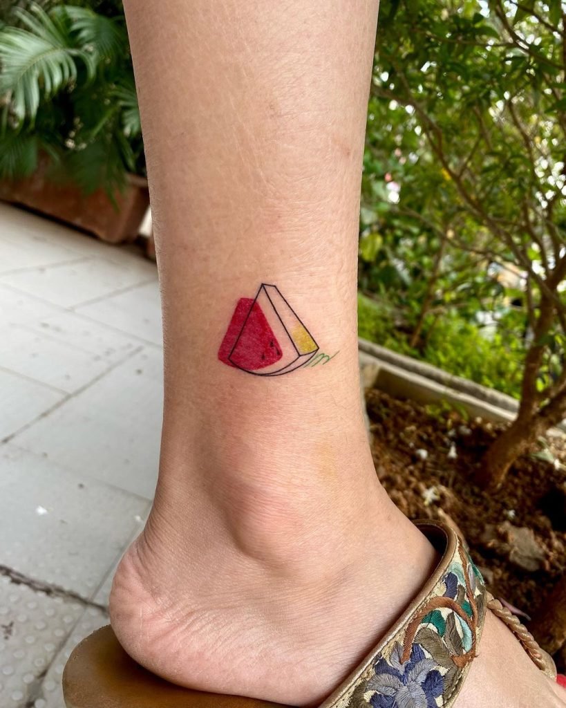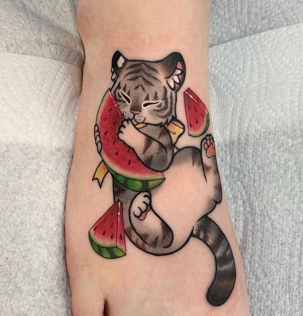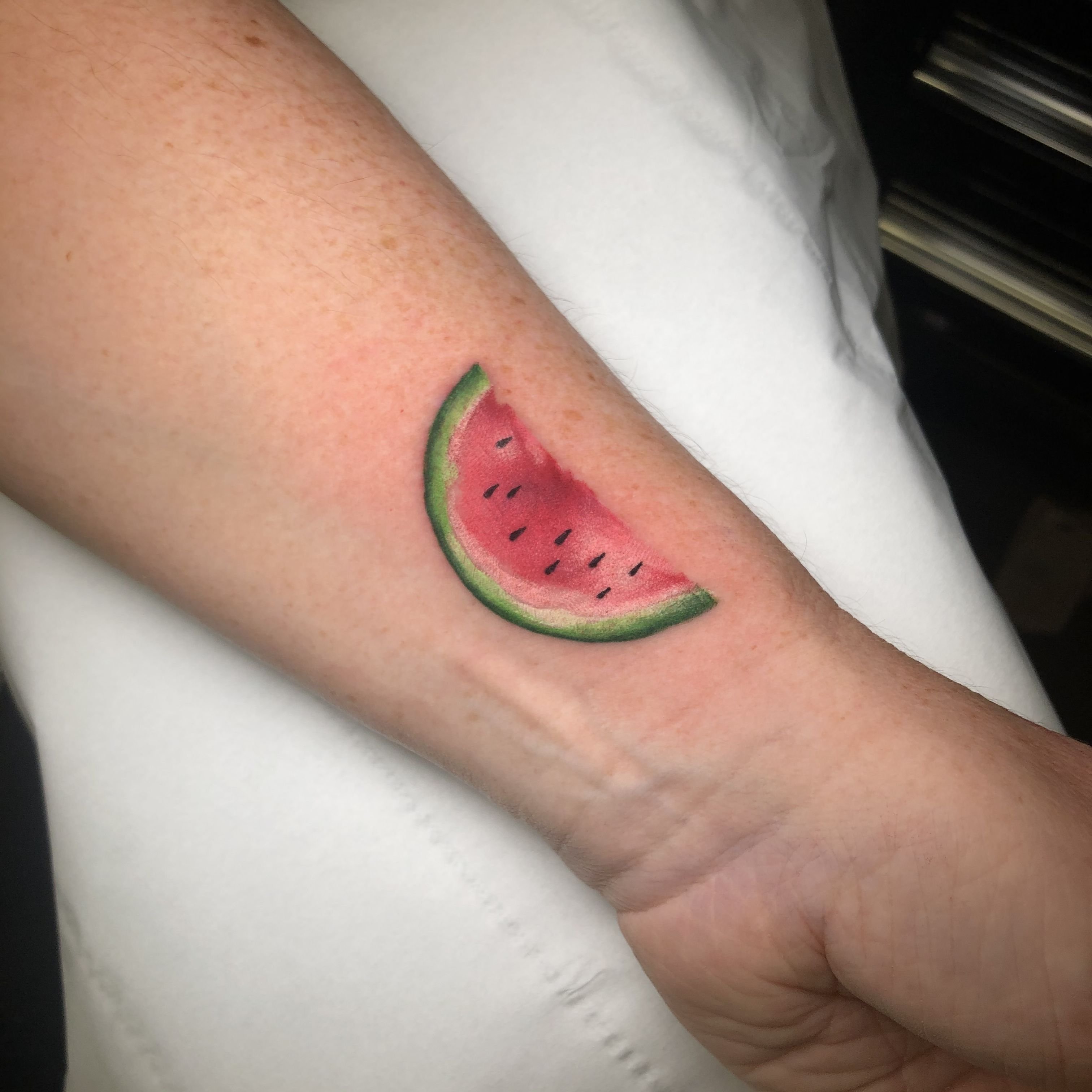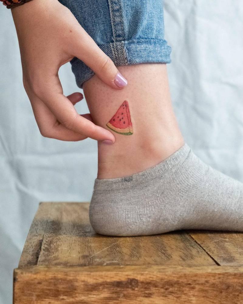 Takové tetování ve formě melounu může říci, že dívka zdůrazňuje její mládí a krásu, přirozenost a jas.