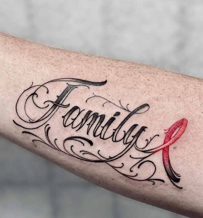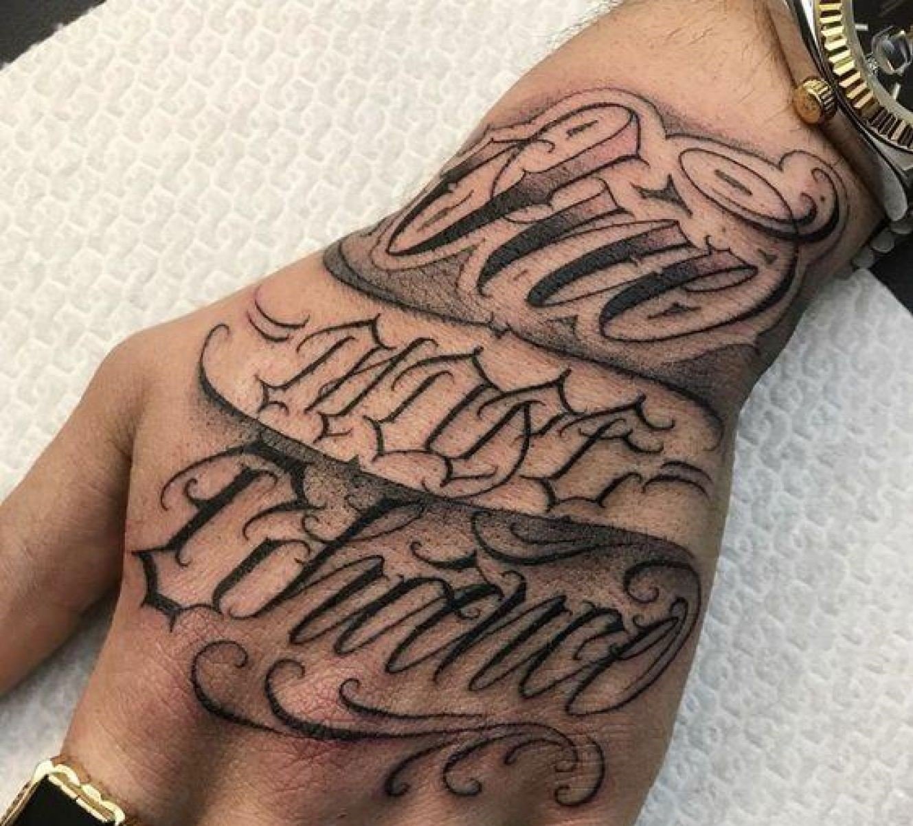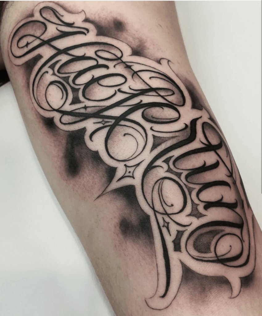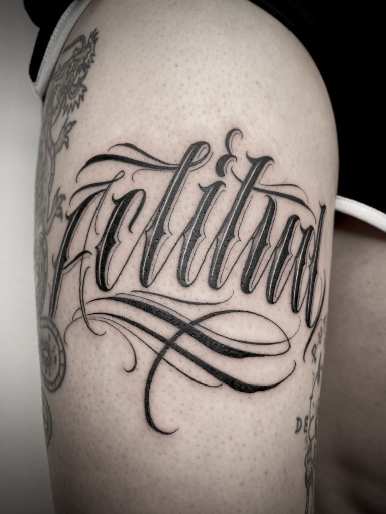 Tetovací náčrt nápisu může působit jako plnohodnotný obrázek nebo může být doplněn různými komponenty. Například nápis může doplnit obrázek létajících ptáků, stuhu, vzor a další prvky. Je důležité vybrat správný doplňkový obrázek, měl by plně doplňovat nápis a jeho sémantické zatížení. Často jsou zde nápisy s daty, například: svatební den, narození dítěte a jakákoli jiná důležitá událost v životě majitele tetování.