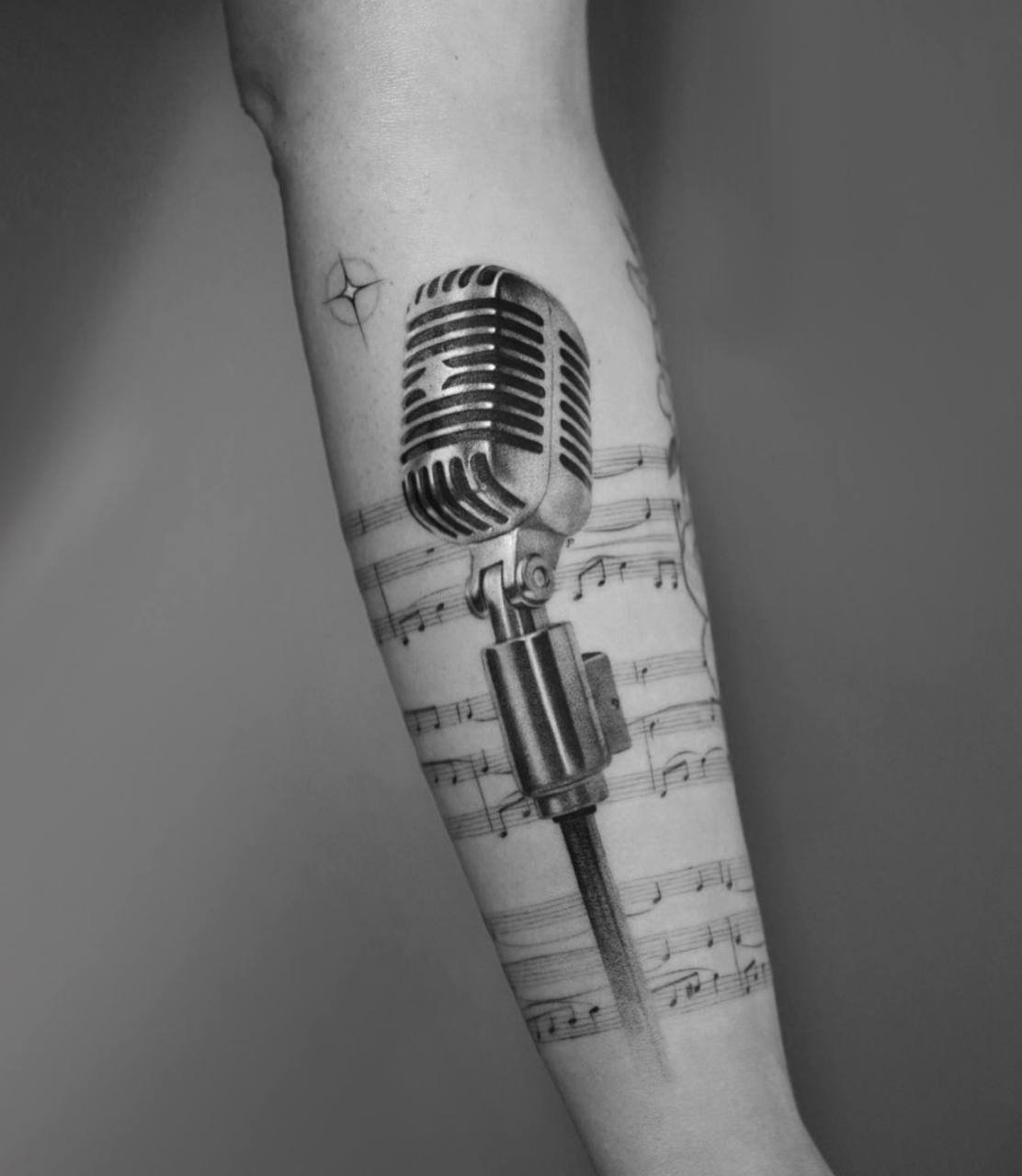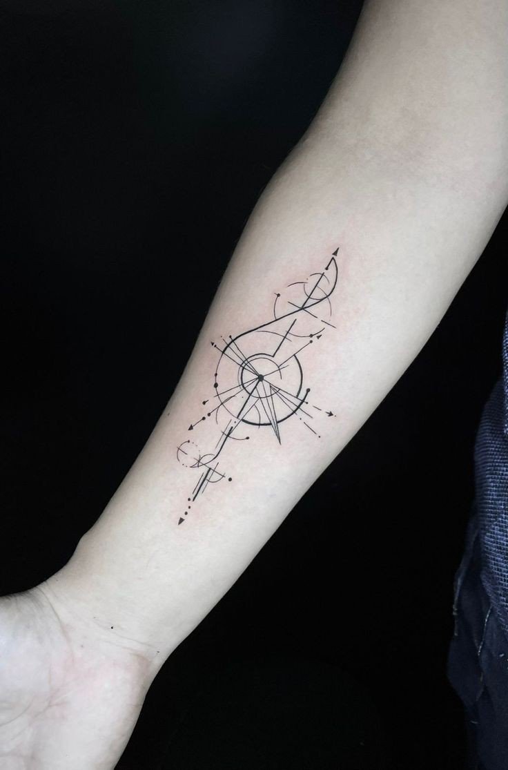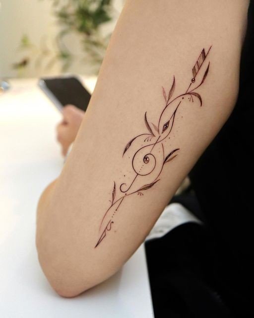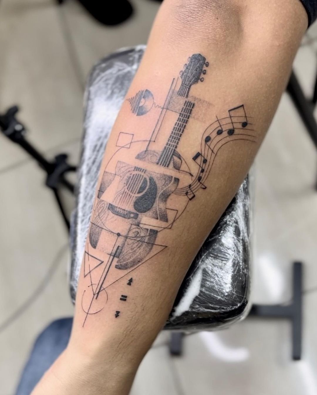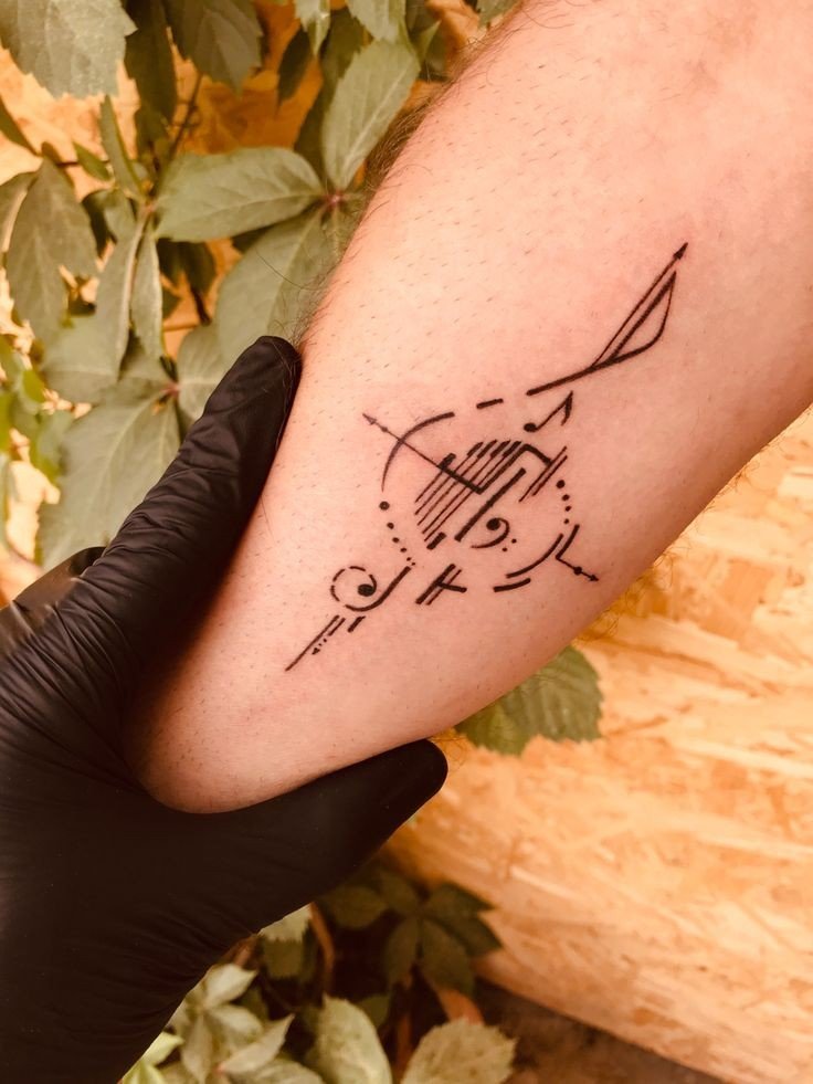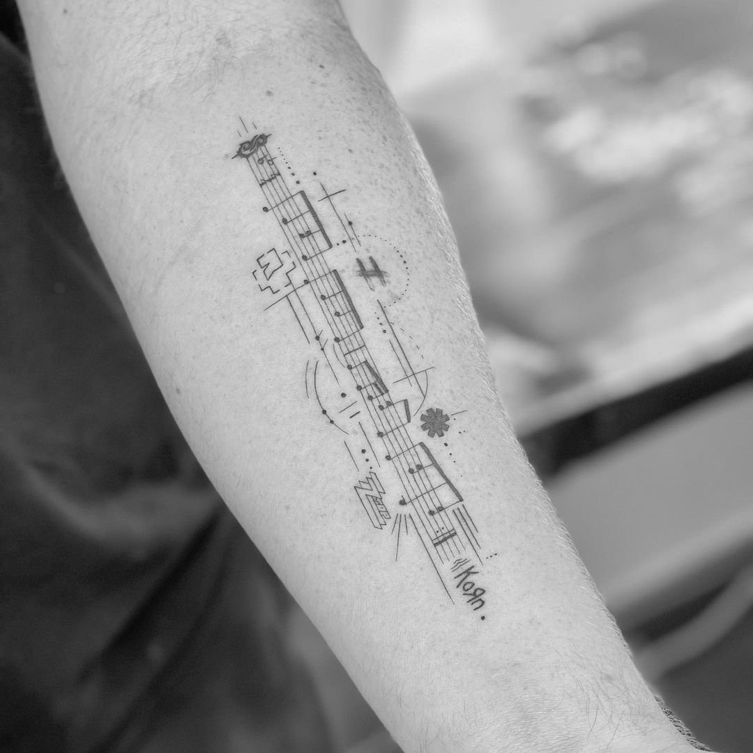 Tetování hudebního tématu (kytara, noty, houslový klíč atd.) naznačuje, že člověk je úzce spjat s hudebním průmyslem.