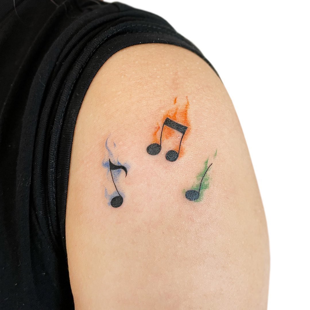 Tetování not si zpravidla vybírají lidé, jejichž život je spojen s hudbou. Tento obrázek je velmi žádaný mezi ženami i mezi muži. Obvykle jsou noty zobrazovány v malé velikosti, proto může být takovým vzorem ozdobena jakákoli část těla. Tetování se provádí v černé barvě, ale stojí za zmínku, že neexistují žádná omezení, takže si můžete vybrat jakýkoli odstín barvy z palety pigmentů.