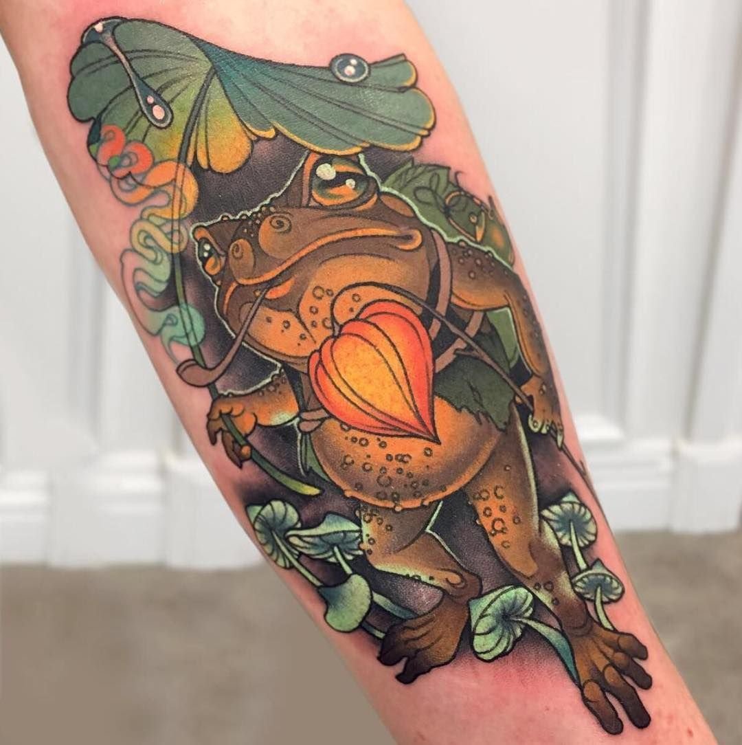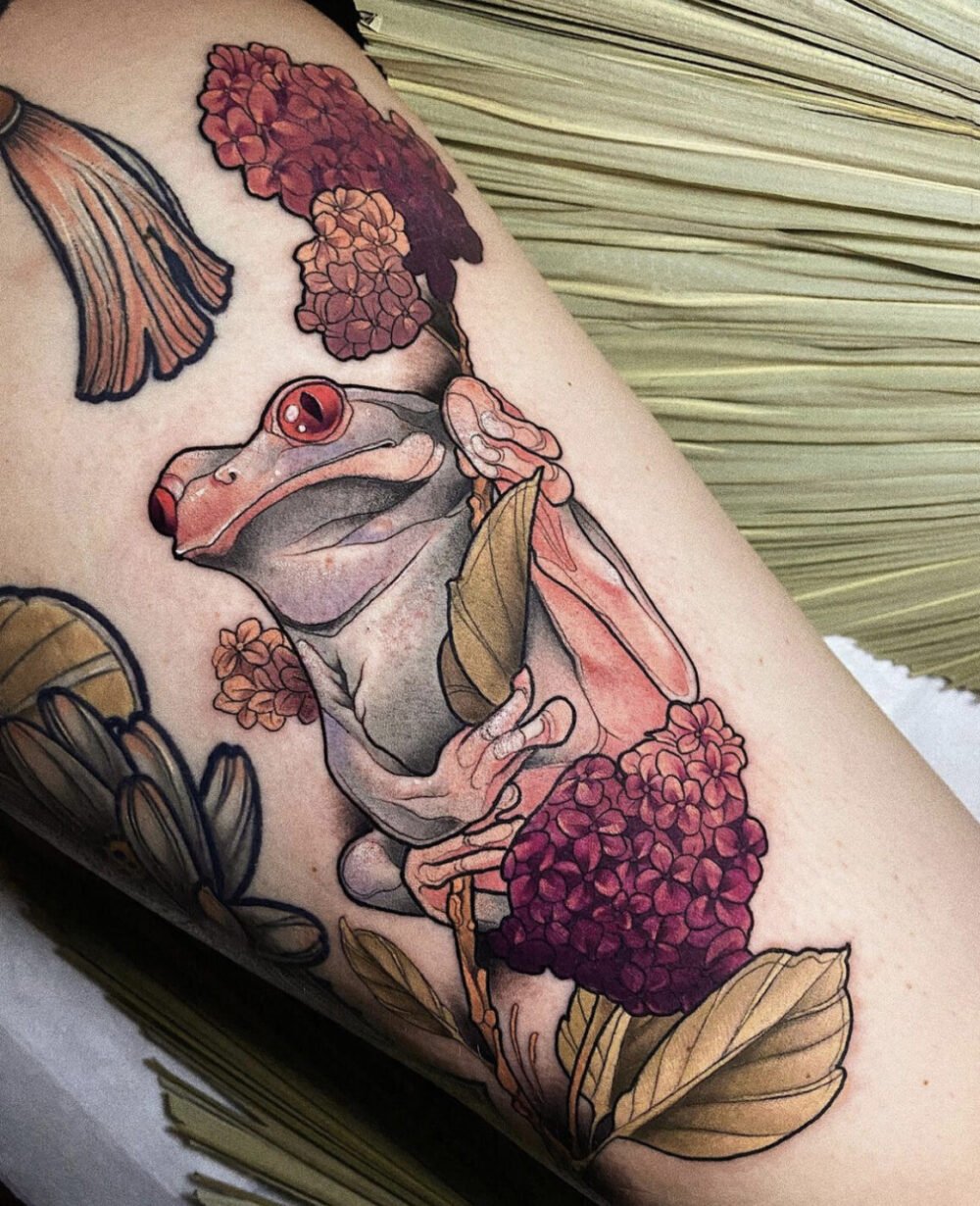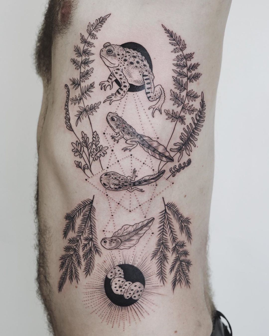 Žába v listí nebo v trávě. Tetování naznačuje, že jeho majitel má skrytou osobnost; Žába s jetelem. Image přitahuje úspěch, udržuje romantické vztahy a přitahuje finance. Za zmínku také stojí, že tetování žáby může být provedeno v nejjasnějších barvách, čímž se zdůrazňuje jasná, odvážná a individuální osobnost. Obraz žáby si obvykle vybírají lidé, kteří jsou spojeni s kreativitou, milují experimenty a chtějí se odlišit od lidí kolem nich.