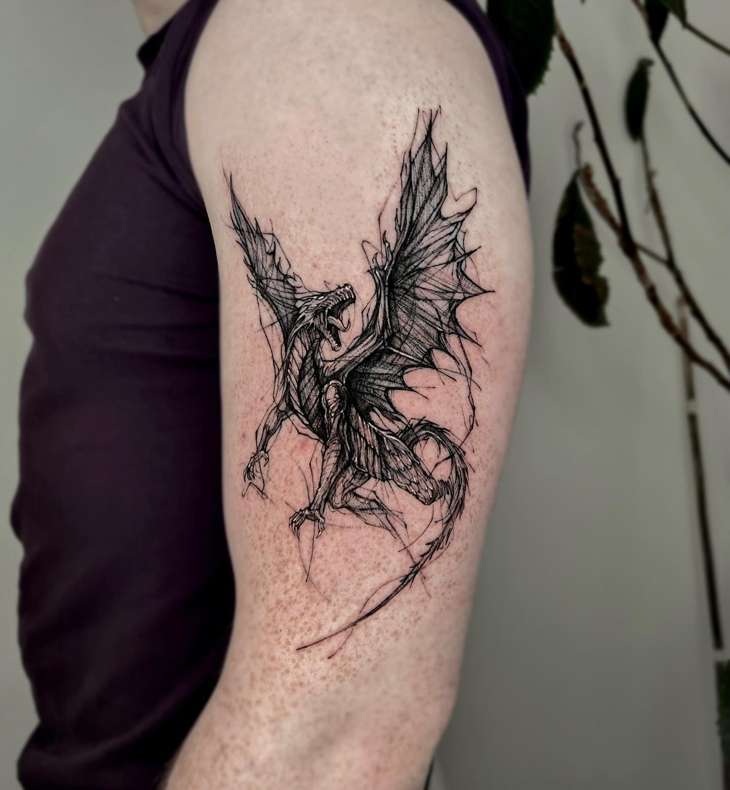 Tetování v tomto stylu lze snadno předělat nebo přidat nové detaily. Doporučujeme do kompozice zapojit jasné barvy. Efektního vzhledu dosáhne tetování díky plynulému přechodu z Akvarelu do stylu Sketch. Vrcholem tetování bude grafický motiv draka v japonském stylu.
