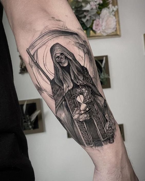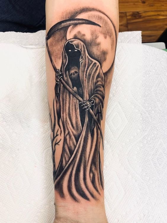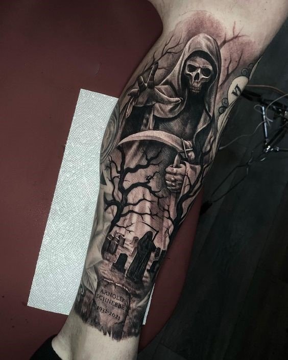 Při výběru místa na těle pro tetování smrti s kosou se nejvíce hodí rozsáhlé oblasti: záda, hrudník, břicho, předloktí, horní část nohy.