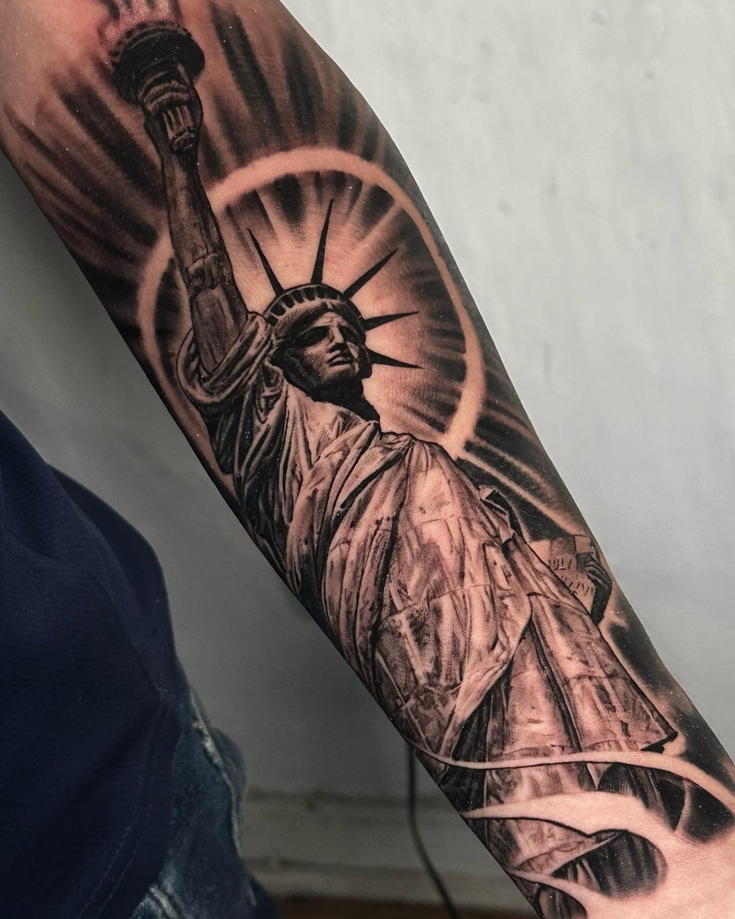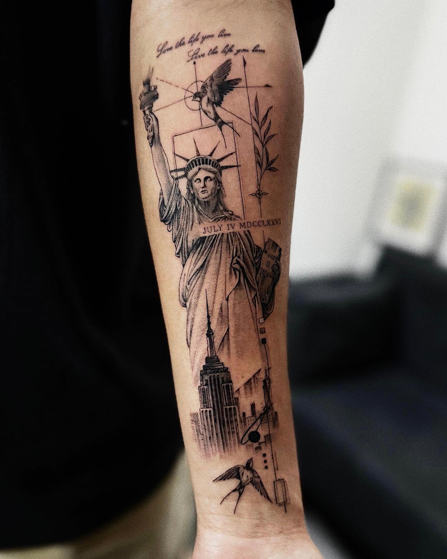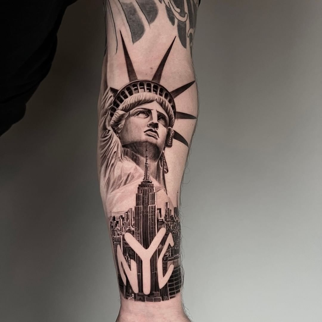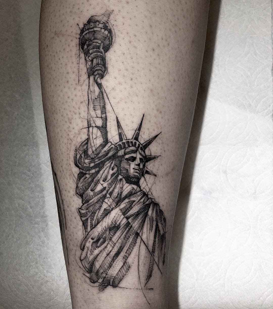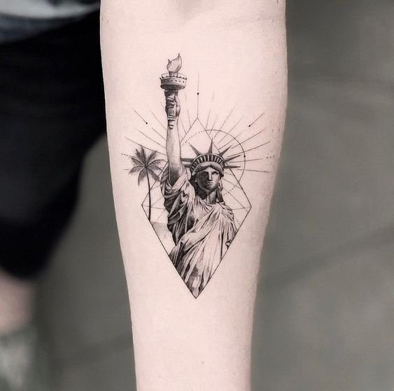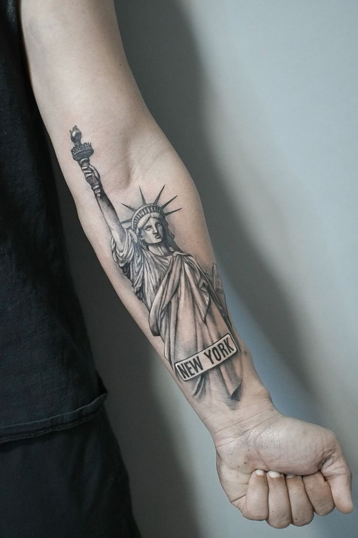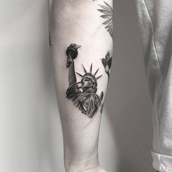 Tetování Sochy Svobody vypadá efektně na rozsáhlých částech těla, jako je záda, předloktí, hrudník, horní část nohy.