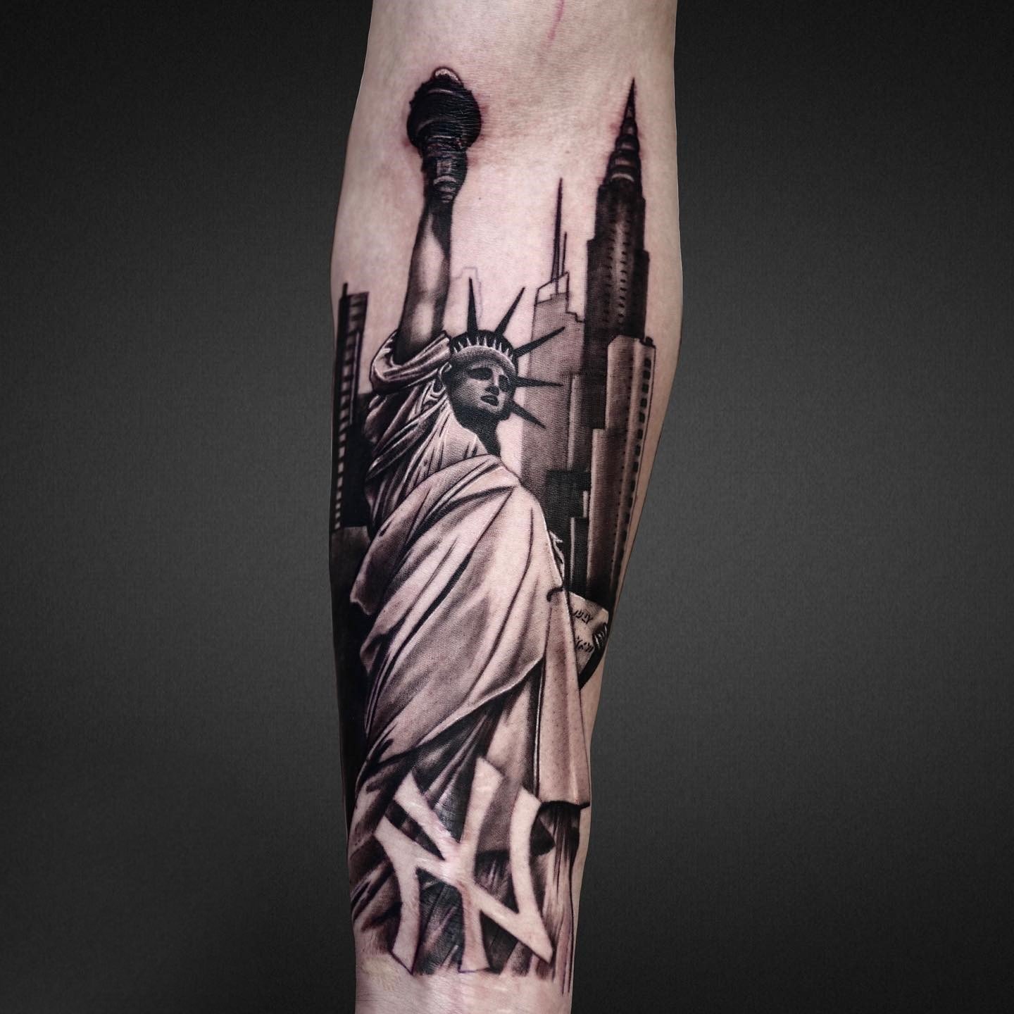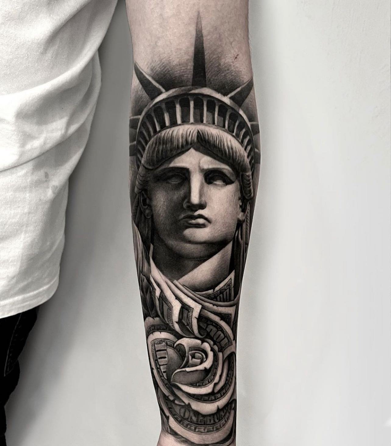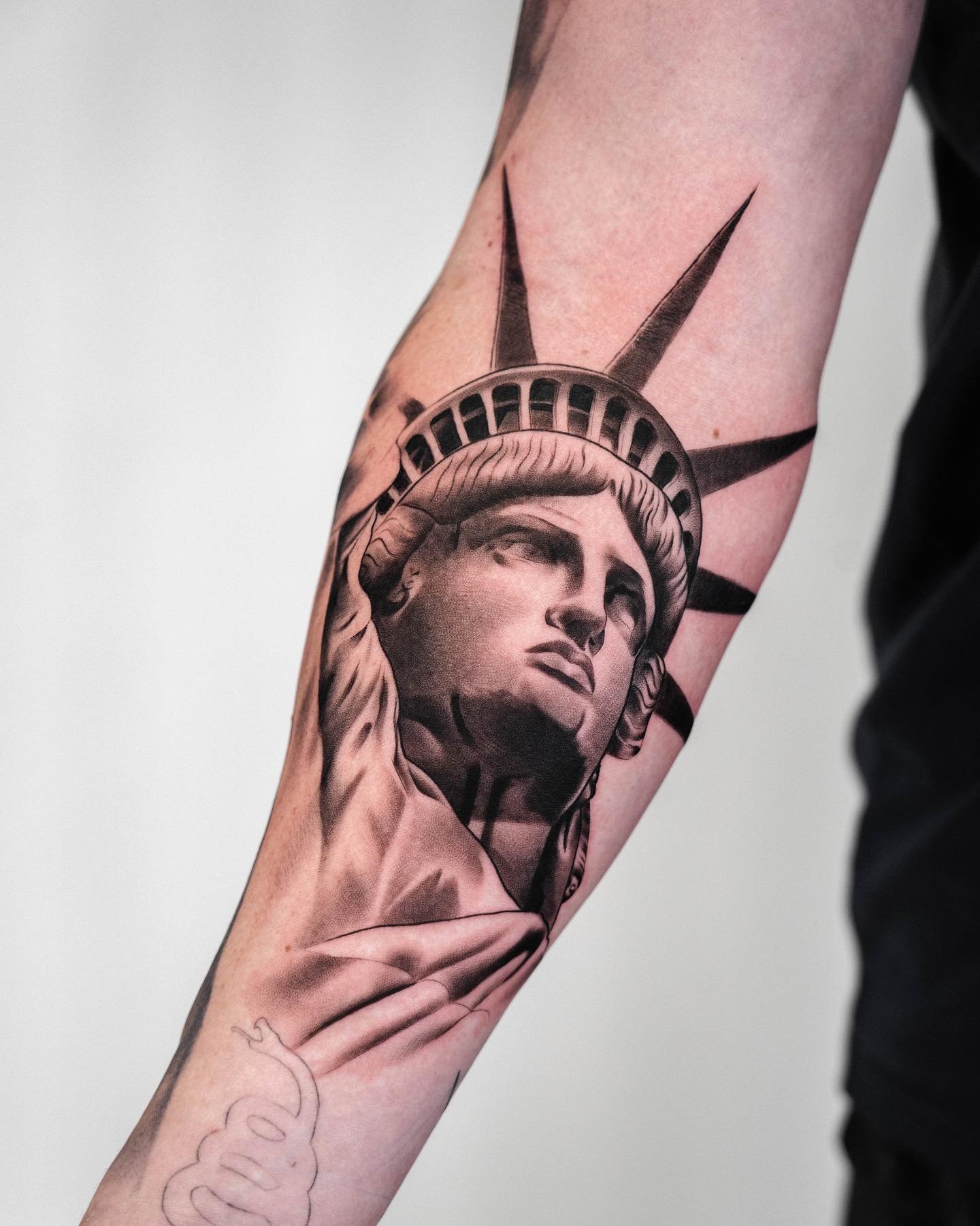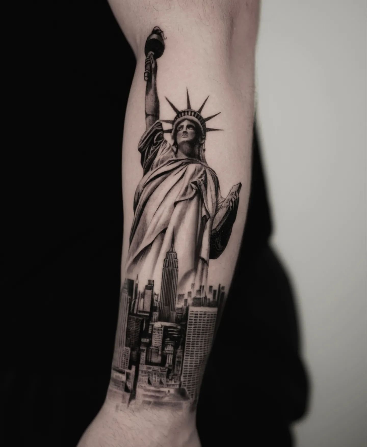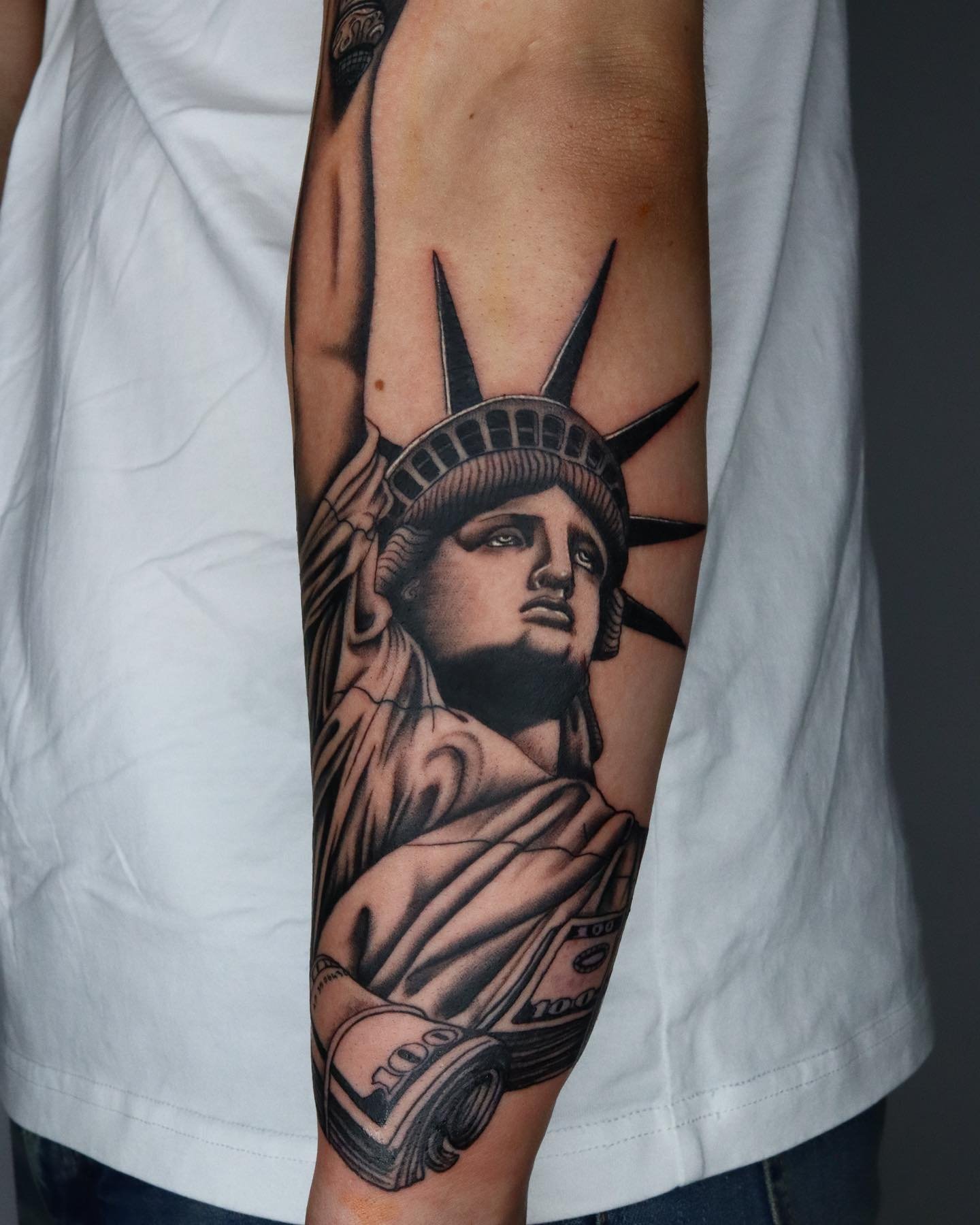 Tetování Sochy Svobody vypadá efektně na rozsáhlých částech těla, jako je záda, předloktí, hrudník, horní část nohy.