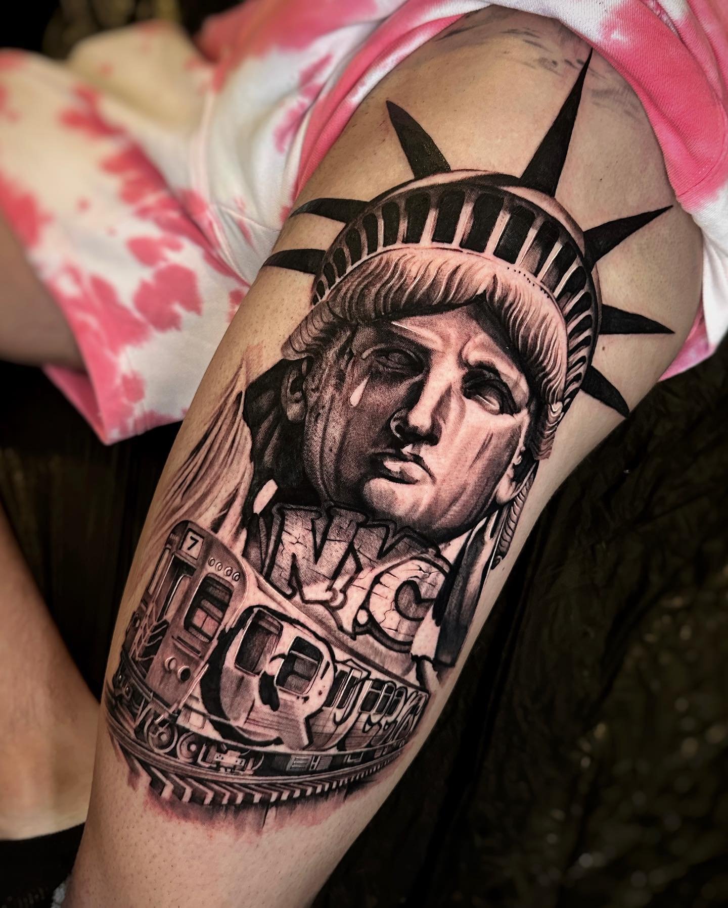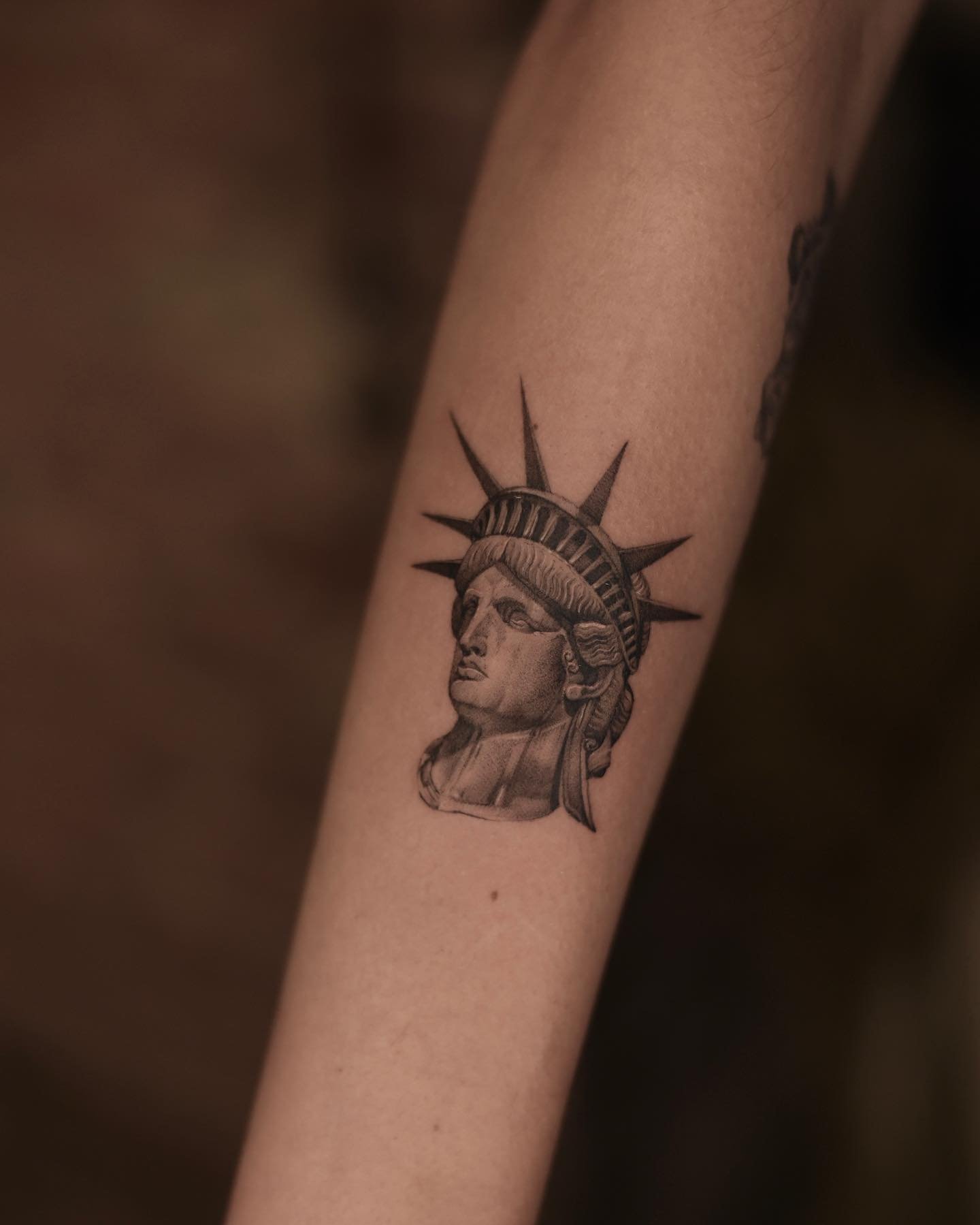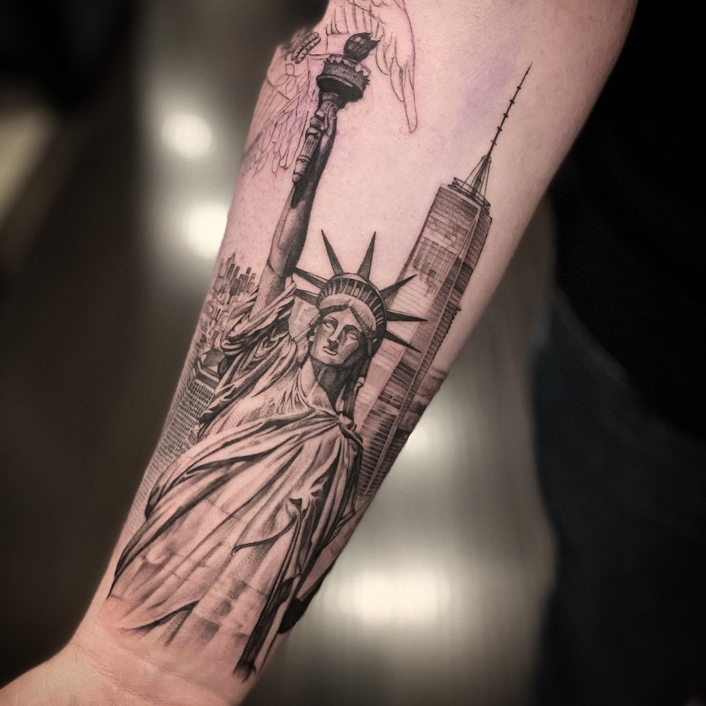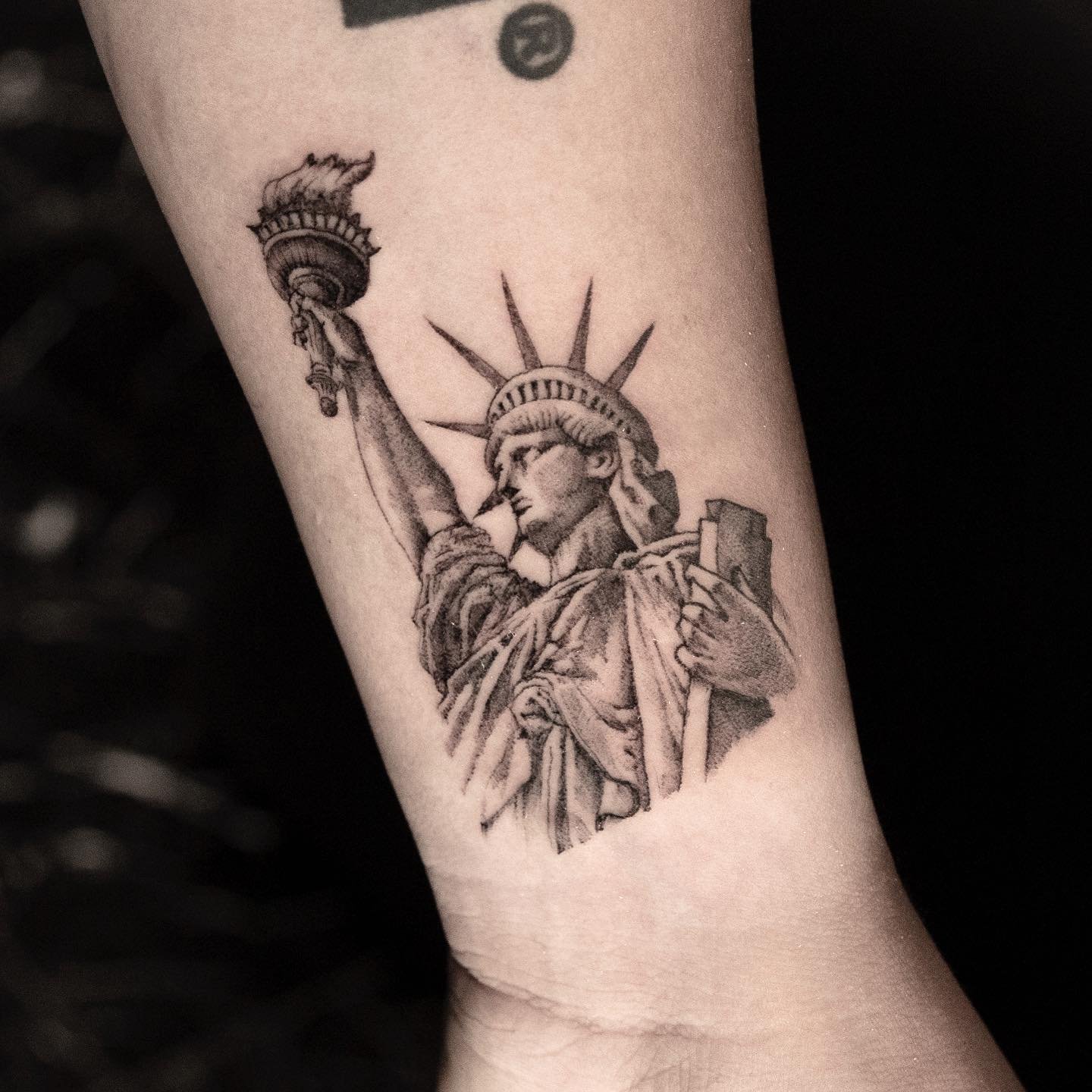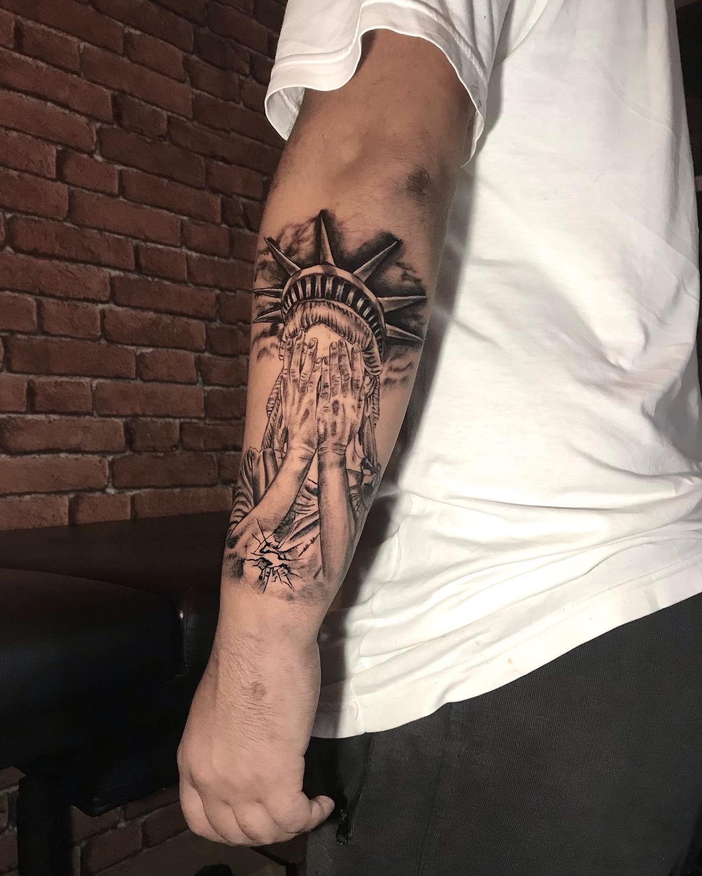 Tetování Sochy Svobody vypadá efektně na rozsáhlých částech těla, jako je záda, předloktí, hrudník, horní část nohy.