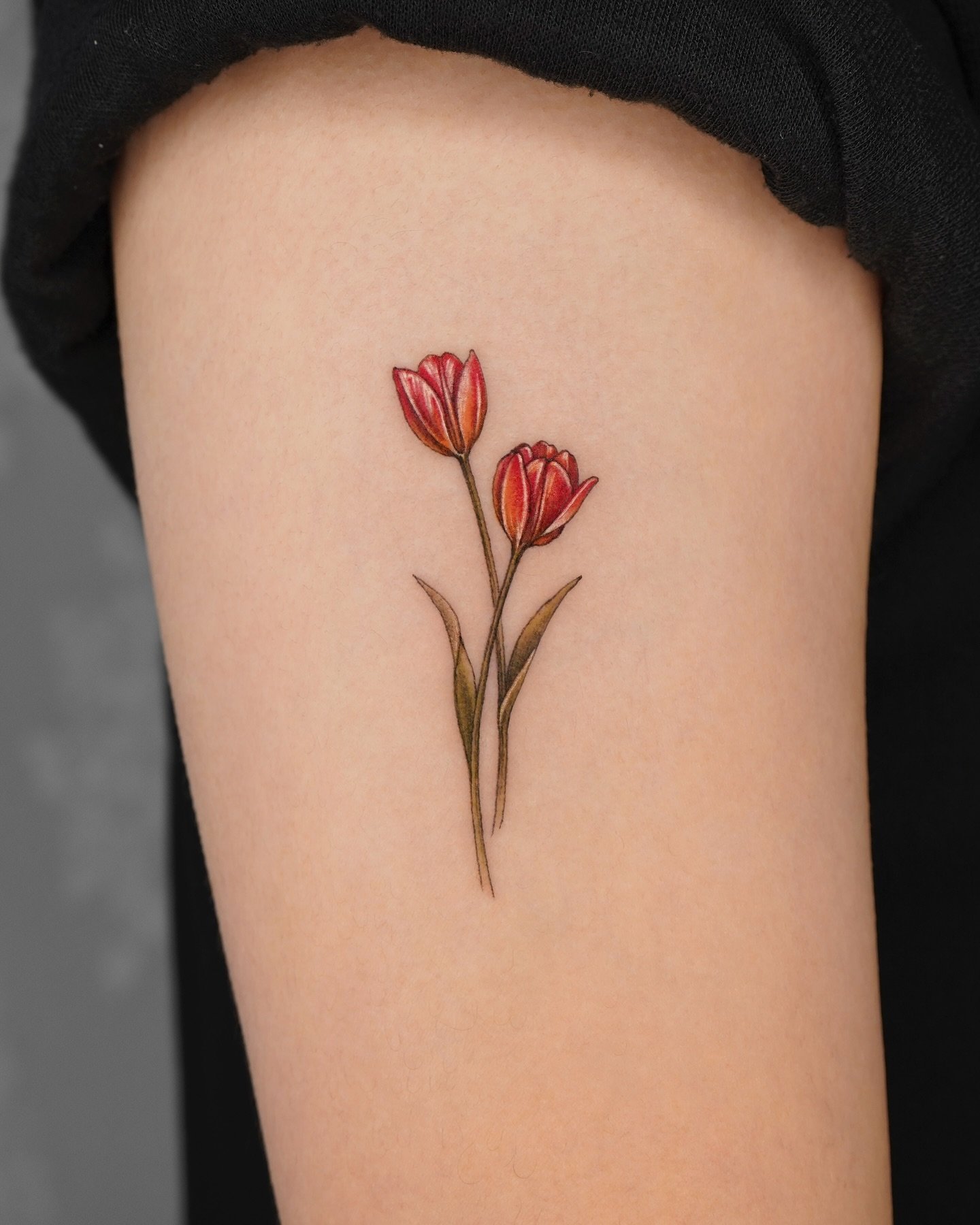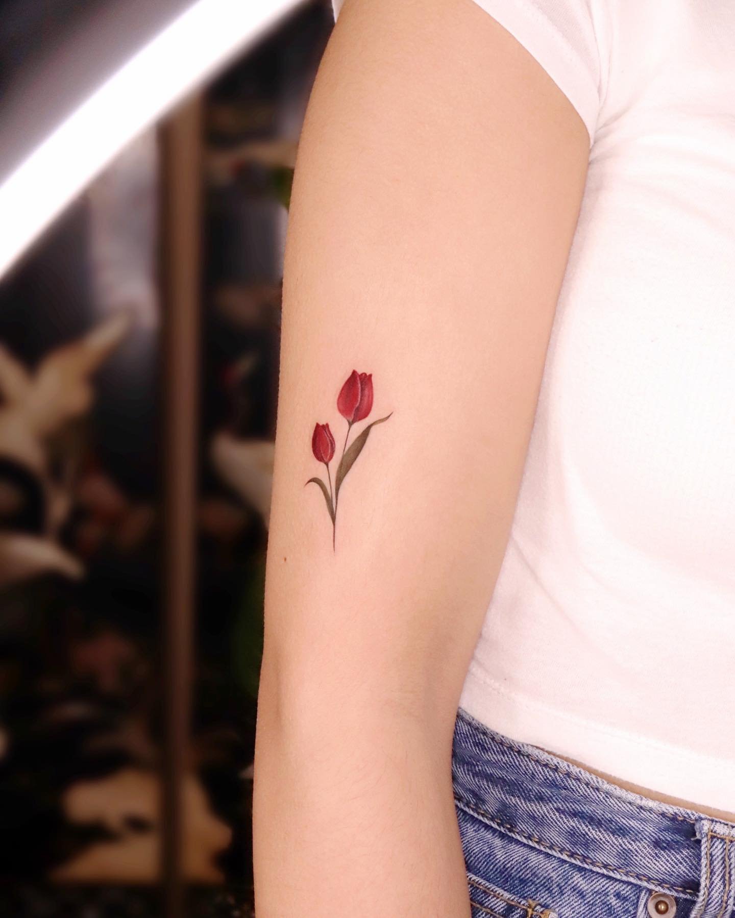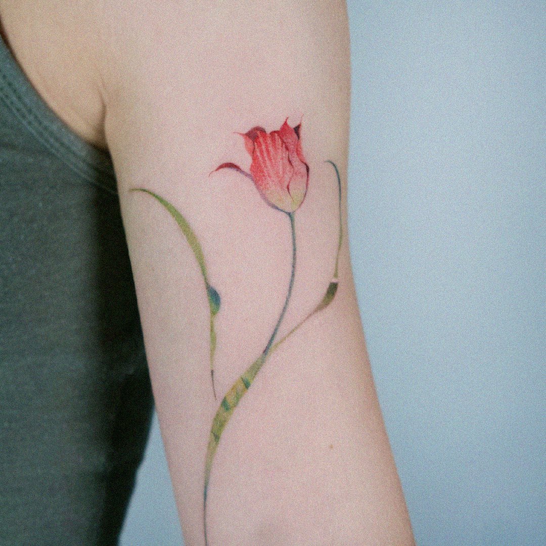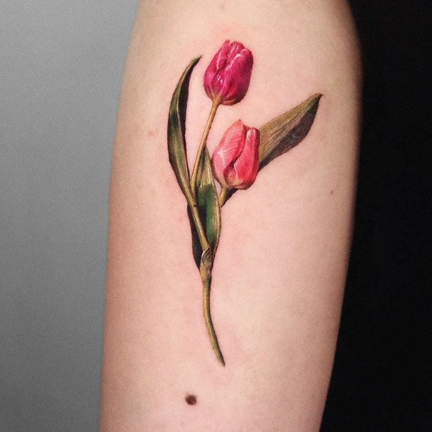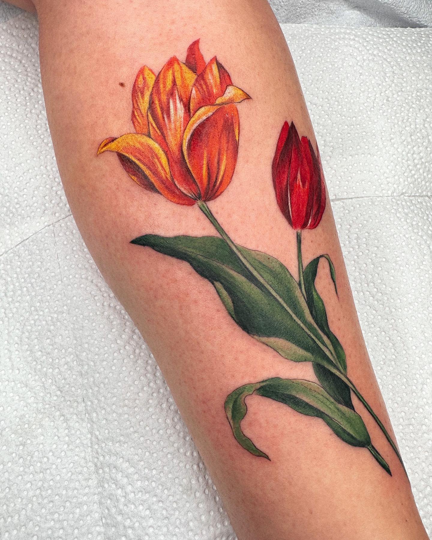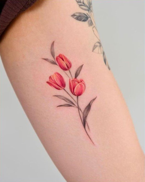 Pro tetování se obvykle volí červené a žluté tulipány, méně často květ bílé barvy. Mimochodem, barva tulipánu také ovlivňuje význam tetování.
