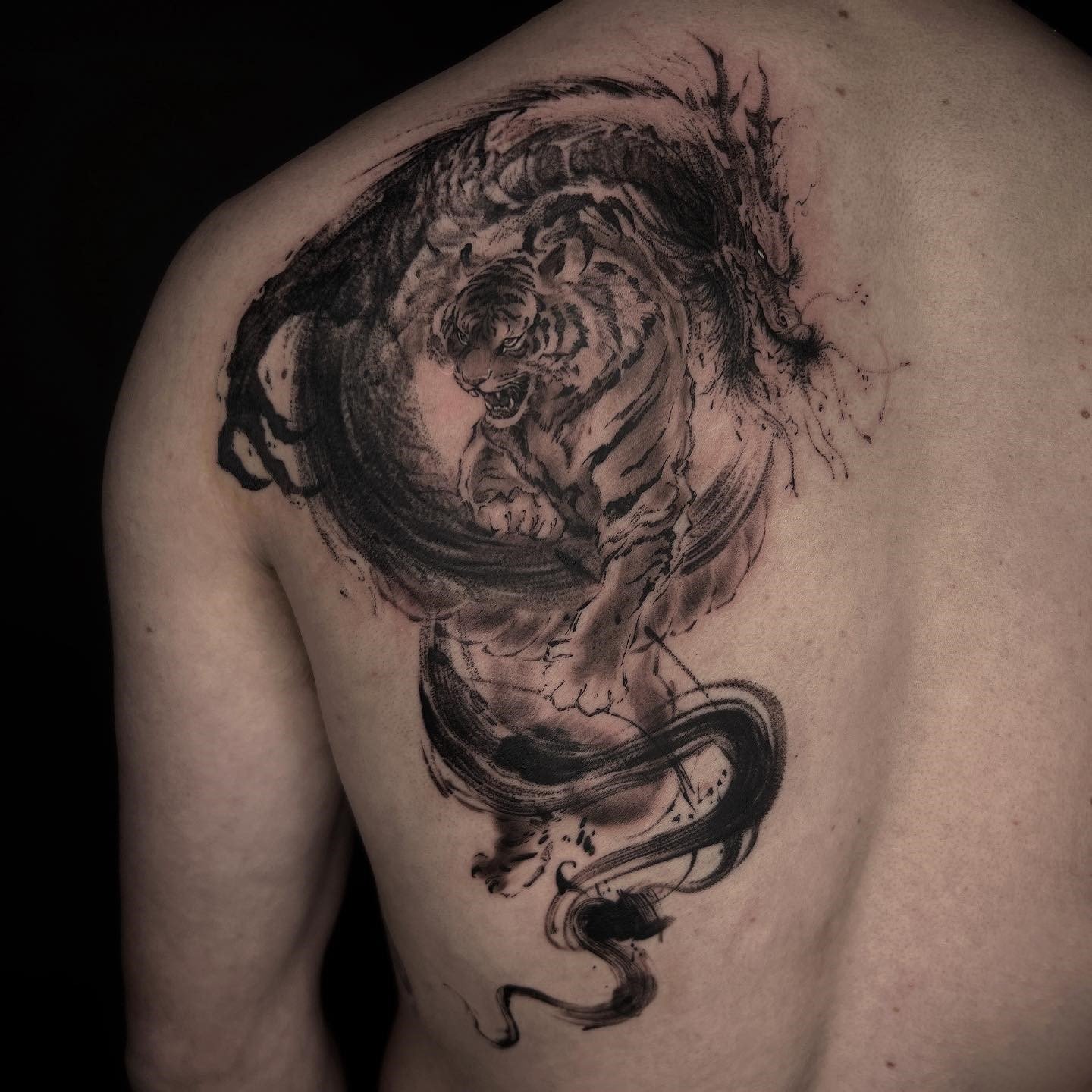 - Zobrazení tygra s drakem představuje ženský princip. V tomto případě obrázek připomíná znamení „Jin-Jang“. Kromě draka může být zobrazení tygra doplněno o květiny nebo motýly, což je více ženská varianta tetování.