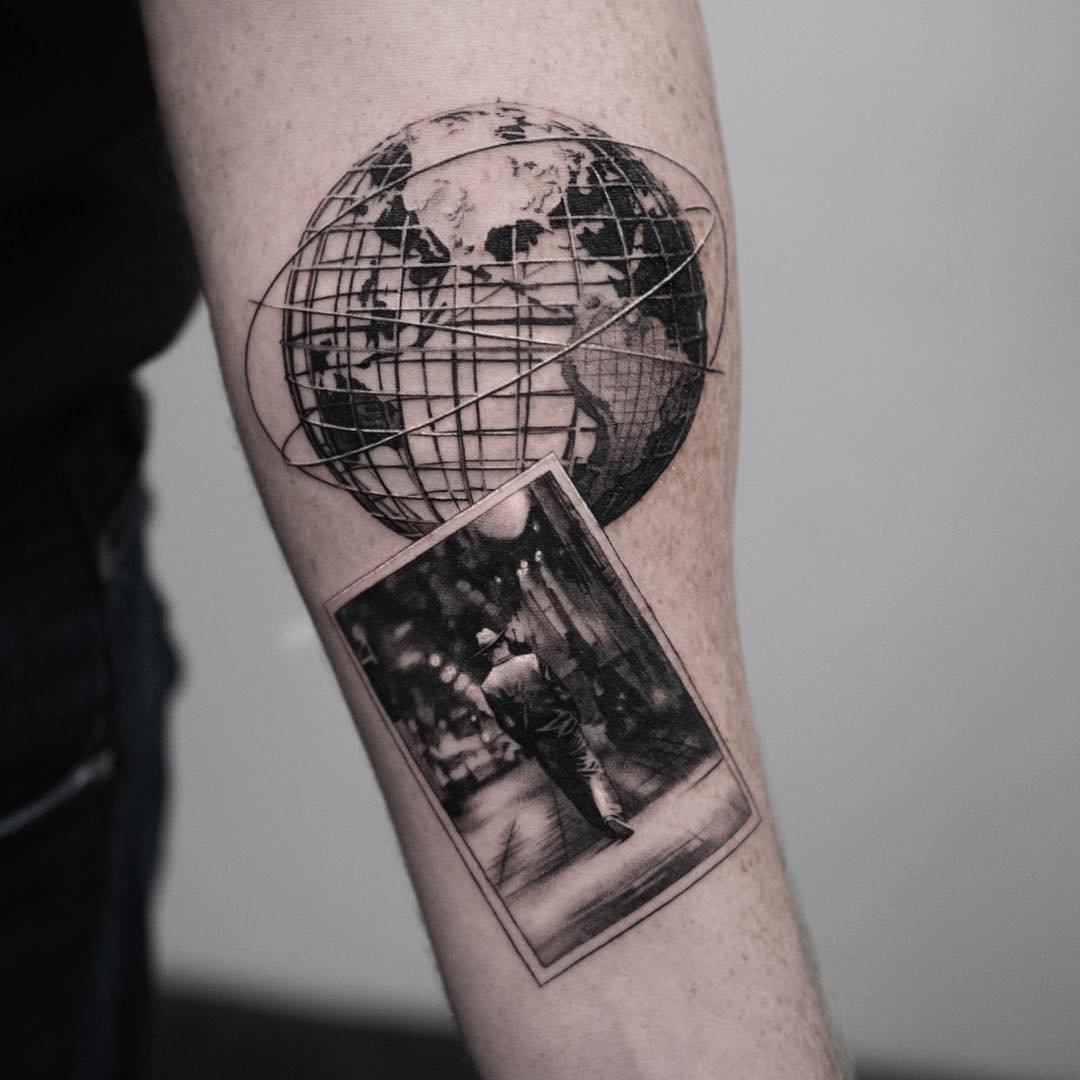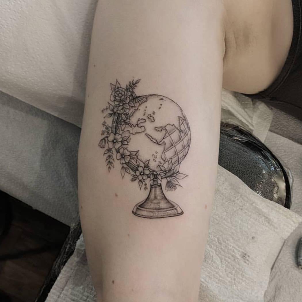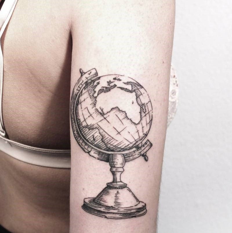 - Zeměkoule s konkrétními zeměpisnými názvy. Toto tetování znamená, že pro majitele jezvláště důležité určené místo. Obvykle si lidé tímto způsobem zvěčňují zemi, ve které se narodili, nebo místo, kam sní jít. Také určené místo může nést romantický význam.