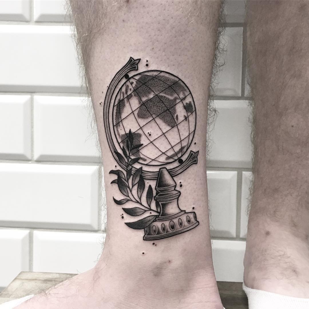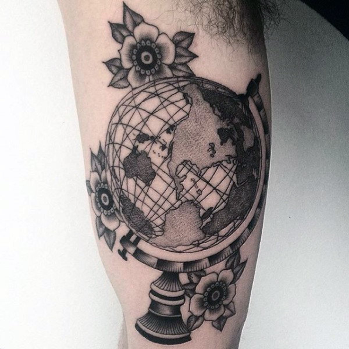 - Globus v černé a bílé. Toto tetování říká, že jeho majitel je pečlivý a přesný člověk.Cestující po celém světě by majitel tohoto tetování raději zůstal v hotelu, než aby si užíval slasti ve stanu.