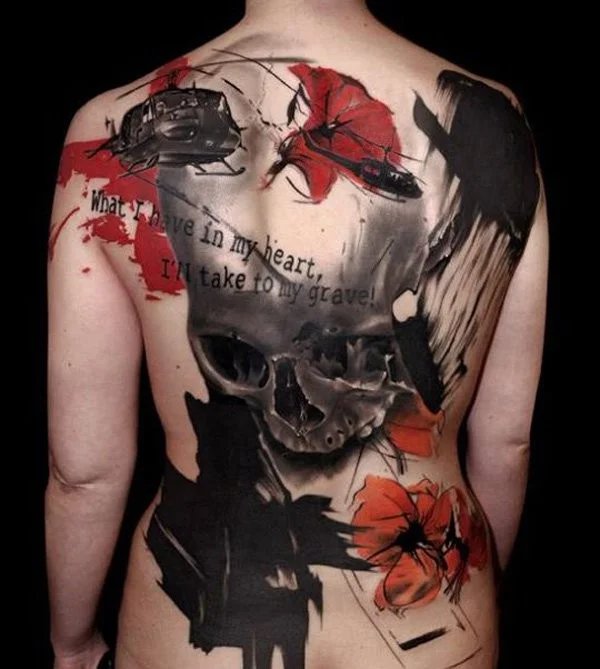 - Tento styl uměleckého tetování vám umožňuje ukázat výzvu k zastaralým obecně uznávaným konceptům, zákonům, moderním trendům. Charakteristickým rysem tohoto stylu je kontrast černé a červené barvy. Tetování je často doplněno tištěným textem.