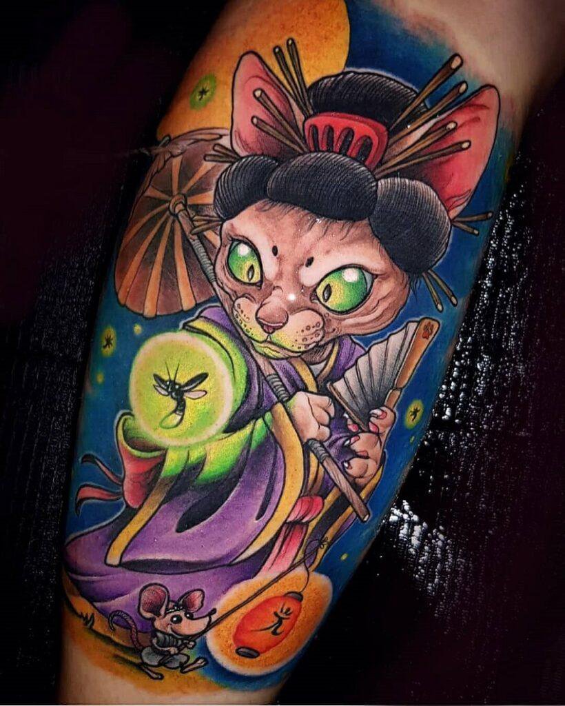 - Abstrakce, humor, fantasy - hlavní nálady tetování New school. Obrázky jsou velmi blízké graffiti. Objevují se v několika jasných, jedovatých barvách. Objevují se velmi krásné a jasné obrazy, pokud se práce ujme zkušený mistr.