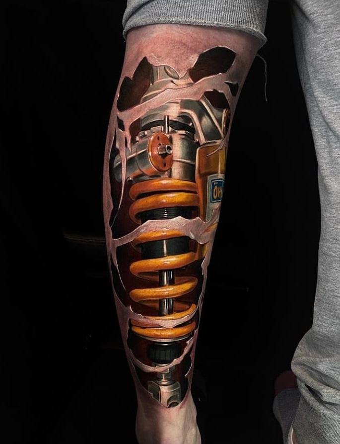 - Biomechanika: Obraz obsahuje mechanické prvky, náhradní díly, součástí: kroužky, ložiska, kotouče a čipy. Velmi často mistři malují roztržený díl. Působí dojmem, že vyčnívá z kůže.