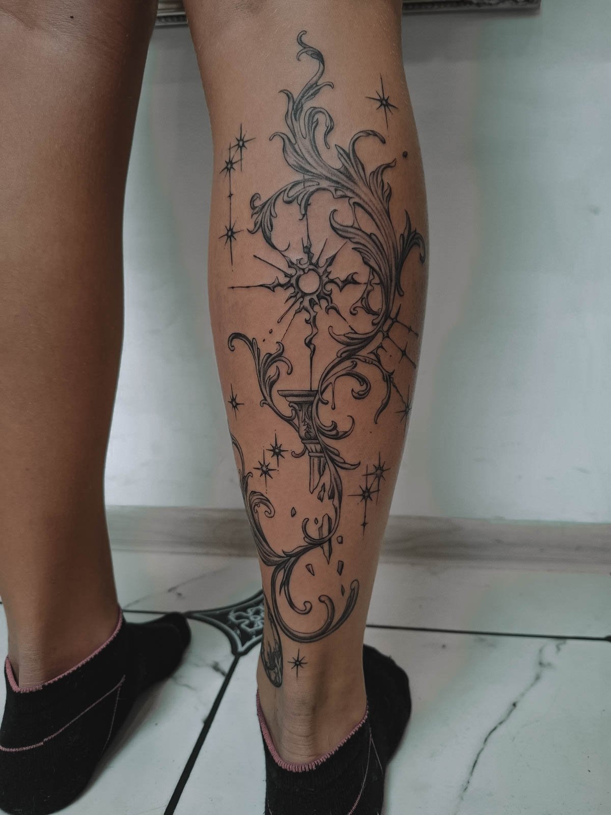 - Lýtko: Tetování na lýtko si ženy často volí kvůli jeho optimální viditelnosti a možnosti snadného zakrytí oblečením. Navíc je lýtková oblast méně citlivá na bolest, což ji činí oblíbenou volbou pro větší motivy. Tetování zde také dobře drží tvar díky pevnější struktuře svalů.